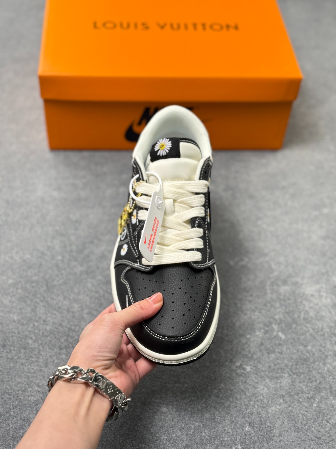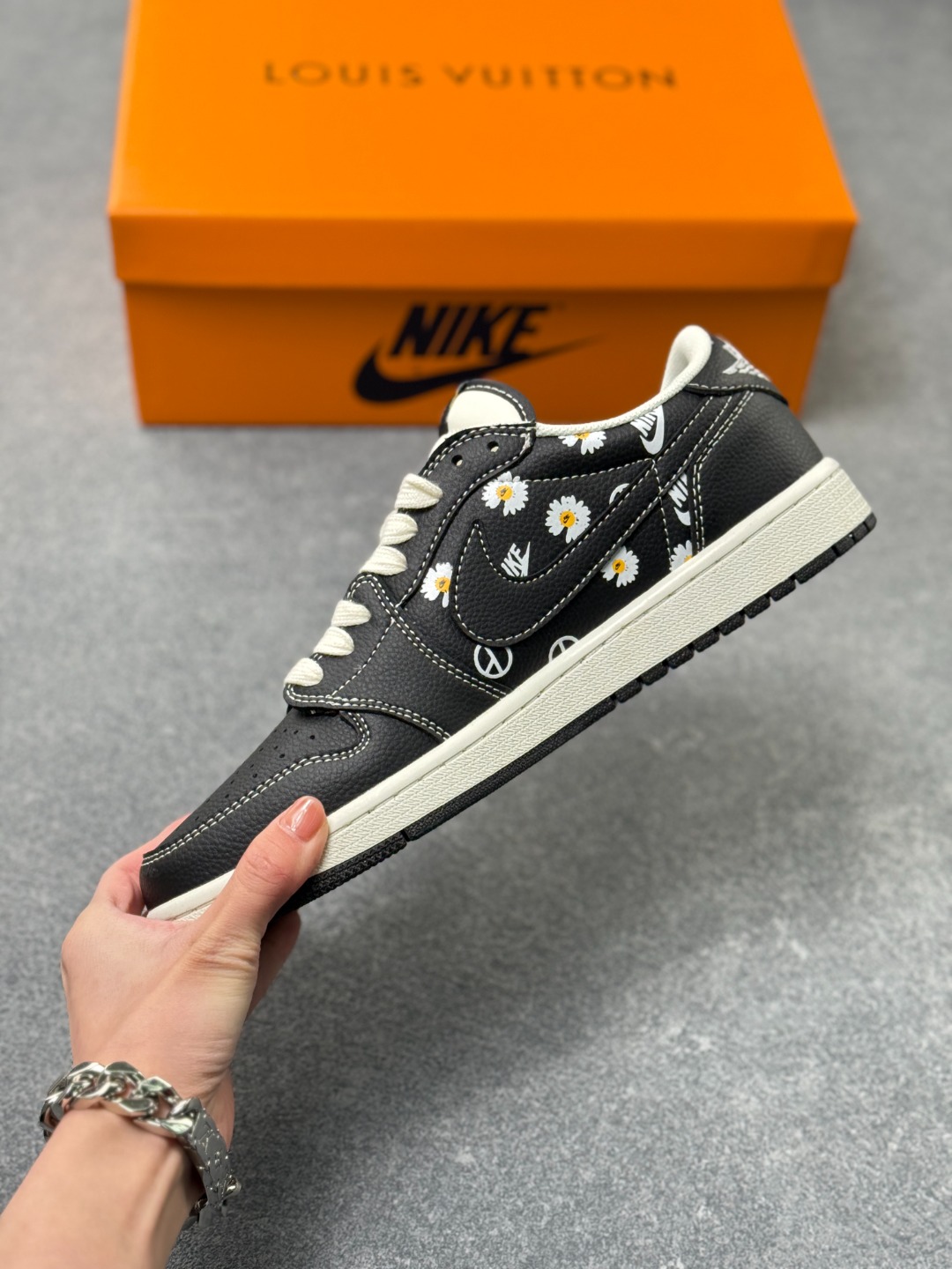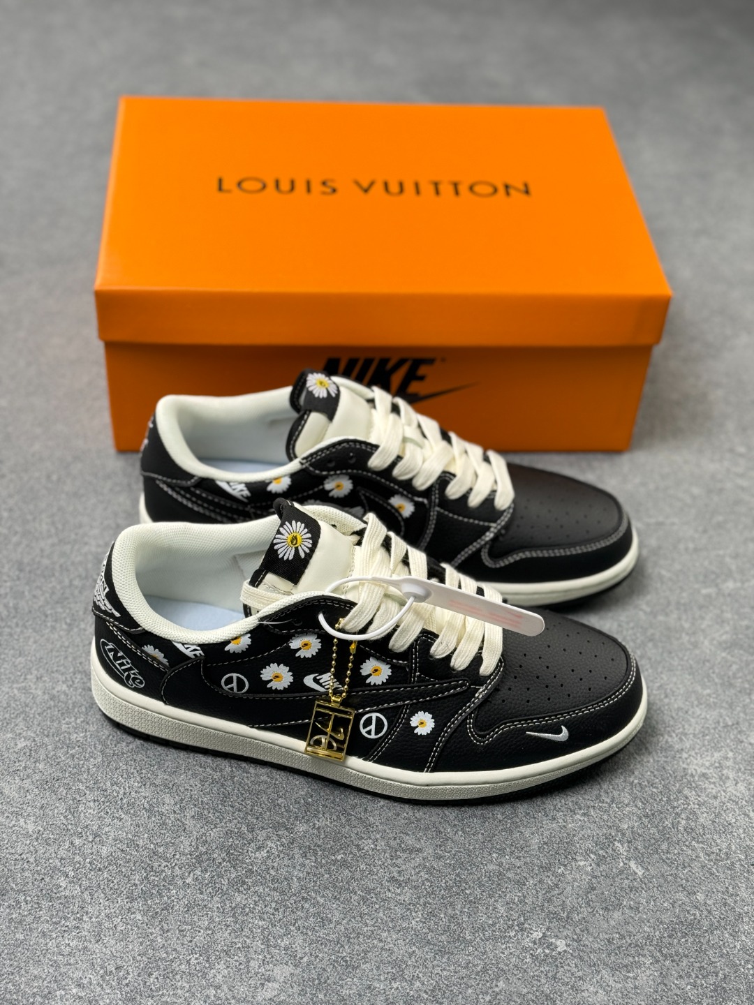 LV Nike 权志龙三方联名设计 黑鞋身铺满软萌小雏菊 搭配奶白包边 金属挂饰 甜酷碰撞的细节直接戳中审美