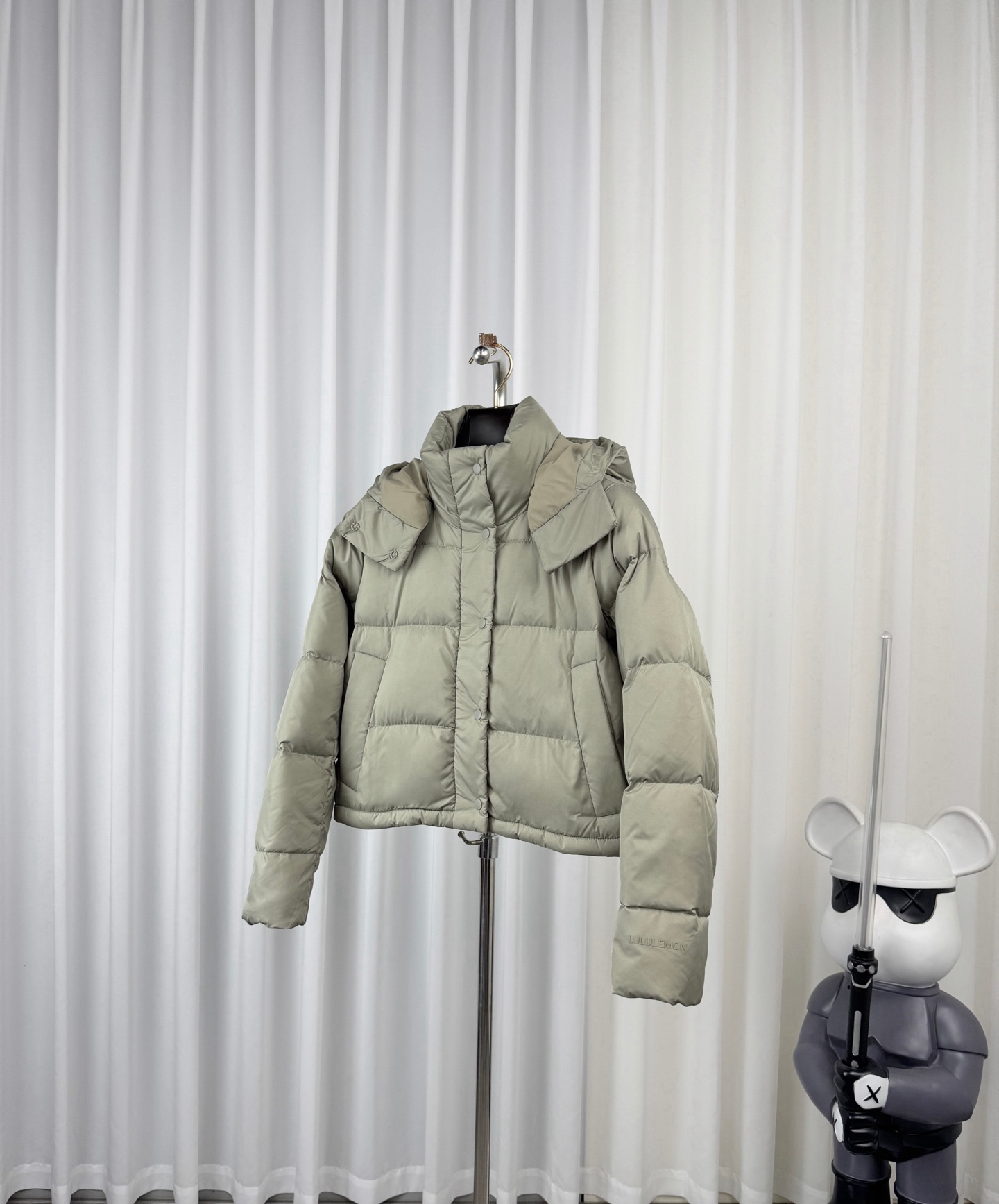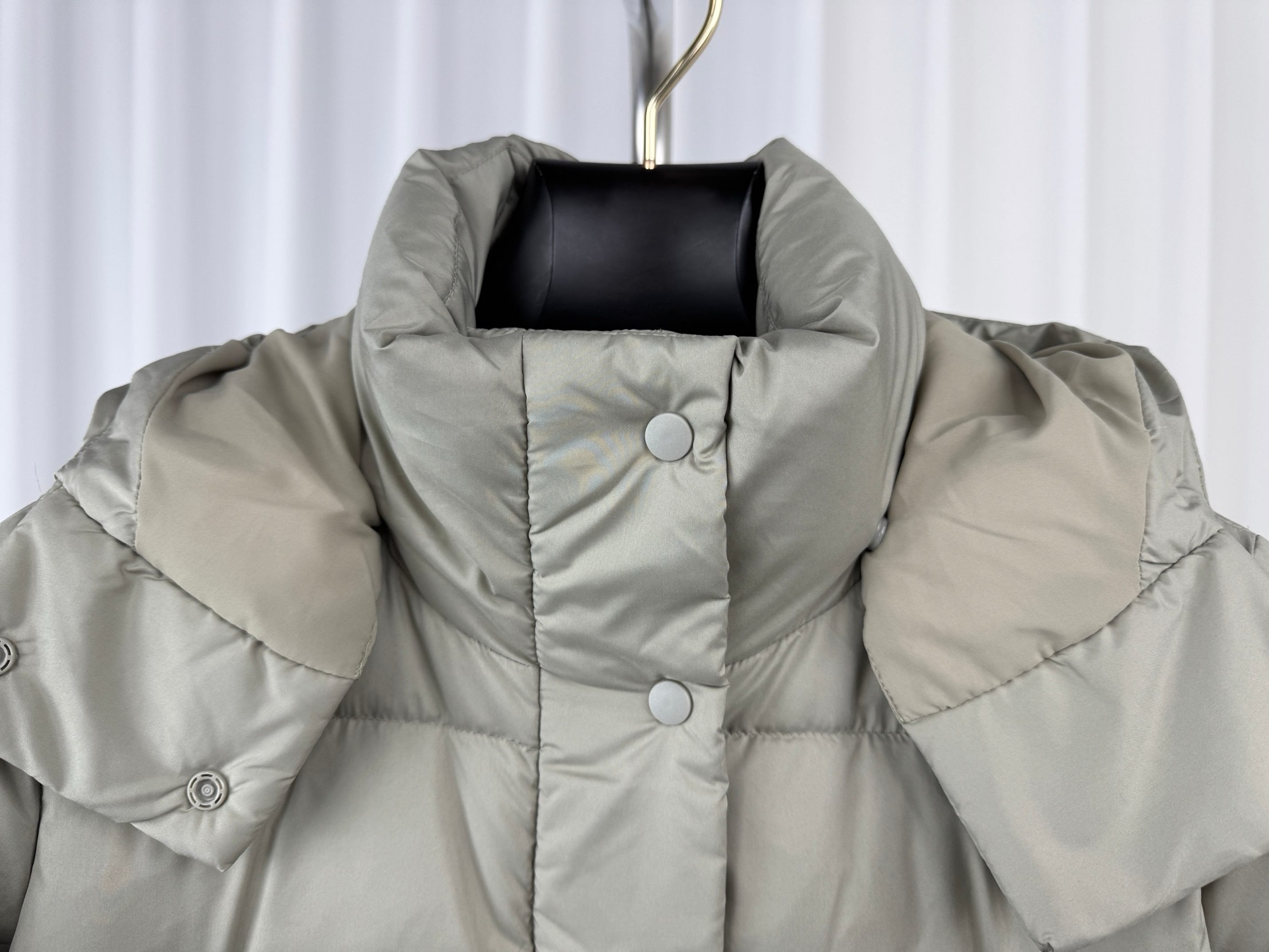 可拆卸连帽 通过按扣与衣身连接 可根据天气或风格需求灵活拆卸 戴上时能抵御寒风 拆卸后则呈现利落的立领造型 风格切换自如