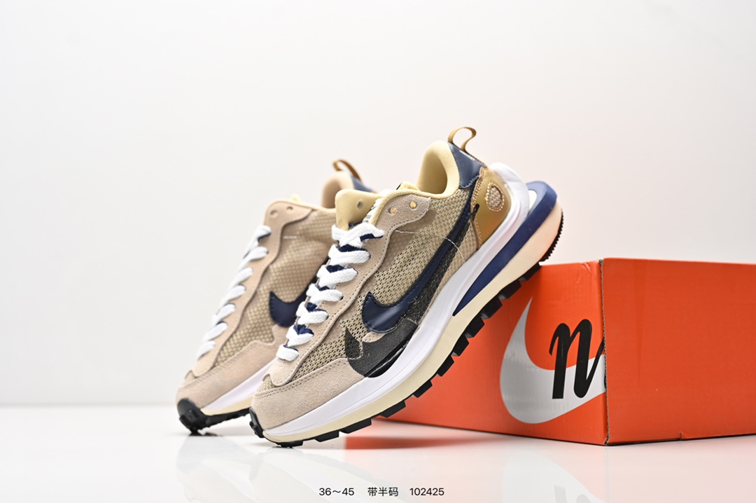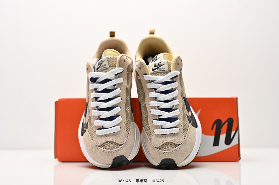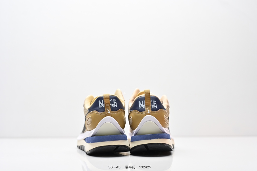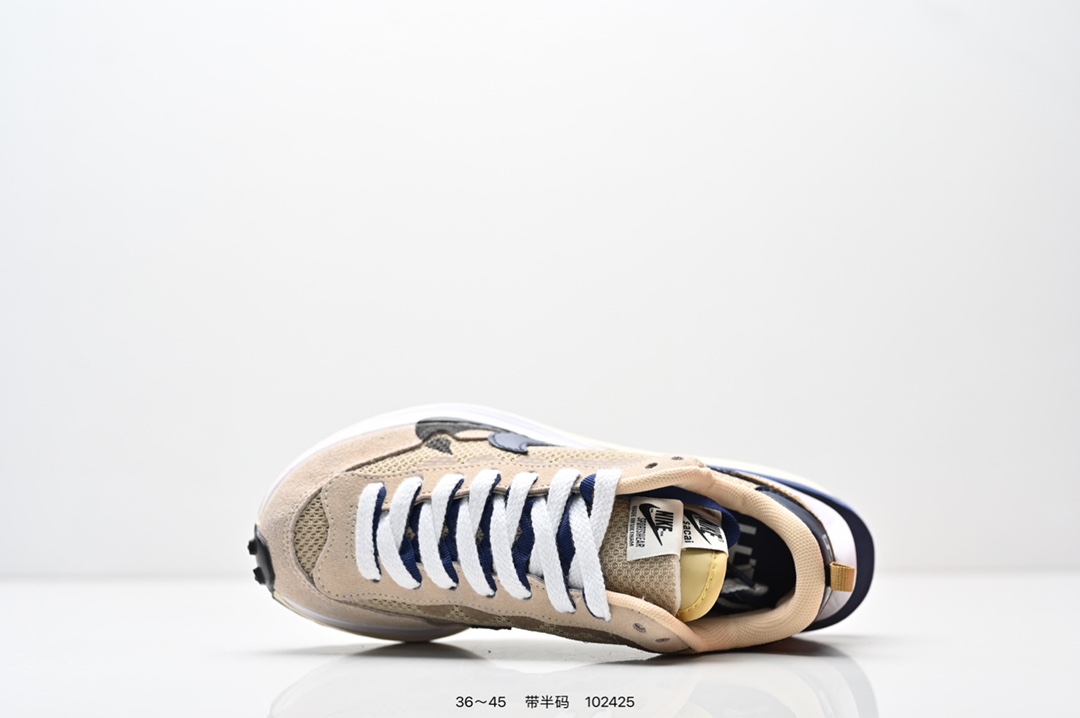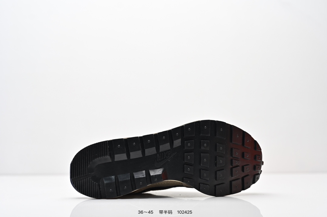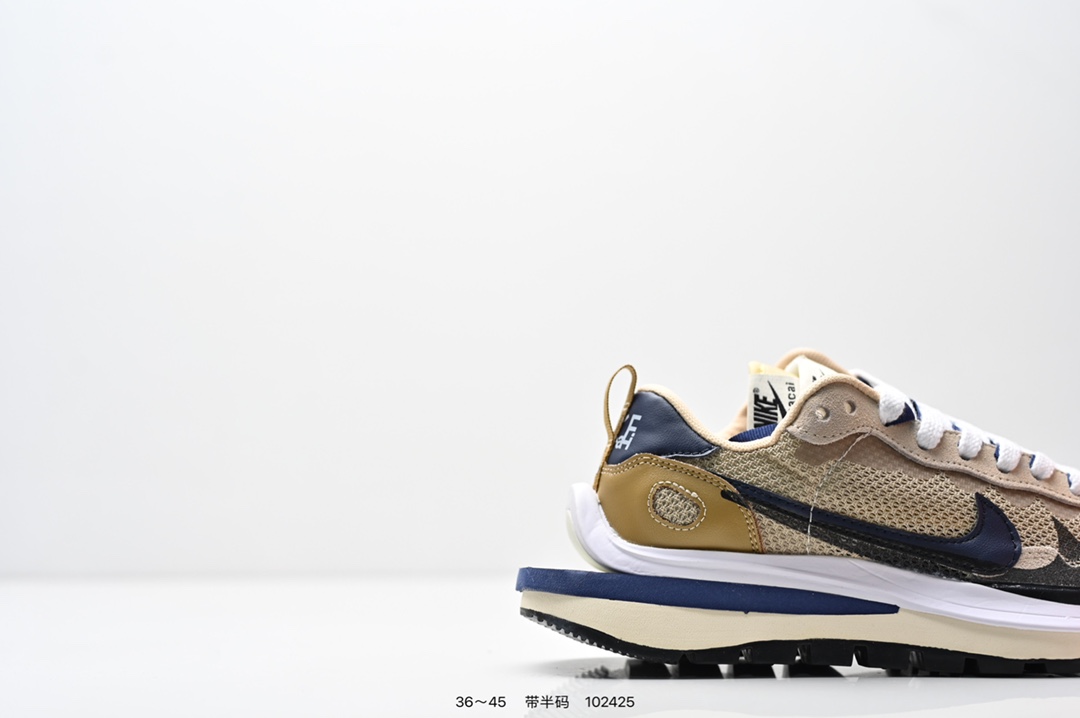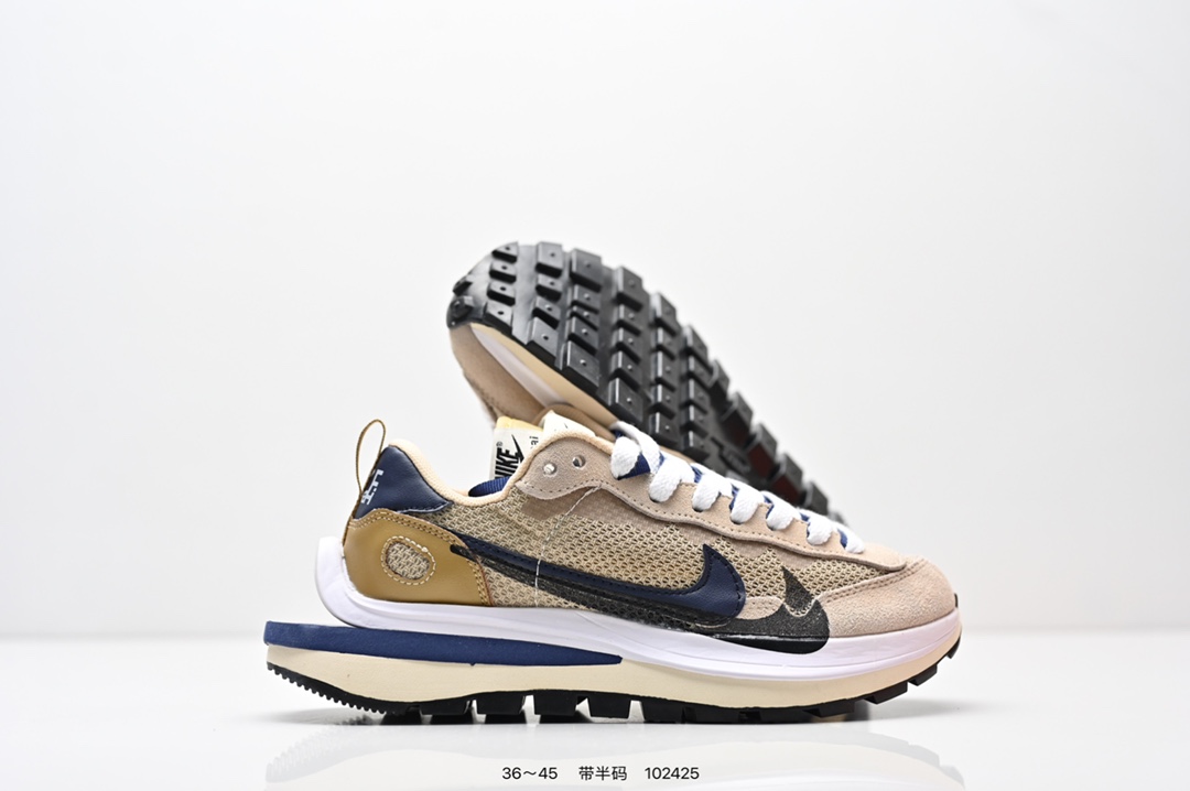 耐克 Sacai X NIKe vaporWaffle 华夫三代3 0 走秀重磅联名款运动鞋 鞋款由Pegasus与VaporFly两款鞋型的设计元素共同构建 鞋身材质由翻毛皮和透气网布共同打造 熟悉的解构手法 重叠Swoosh 双重鞋舌 鞋带以及后跟SACAI字体都悉数保留 最大亮点在于 本次鞋底变本加厉 层数更多 简直和巴黎世家的TripleS有一拼 增高效果妥妥的