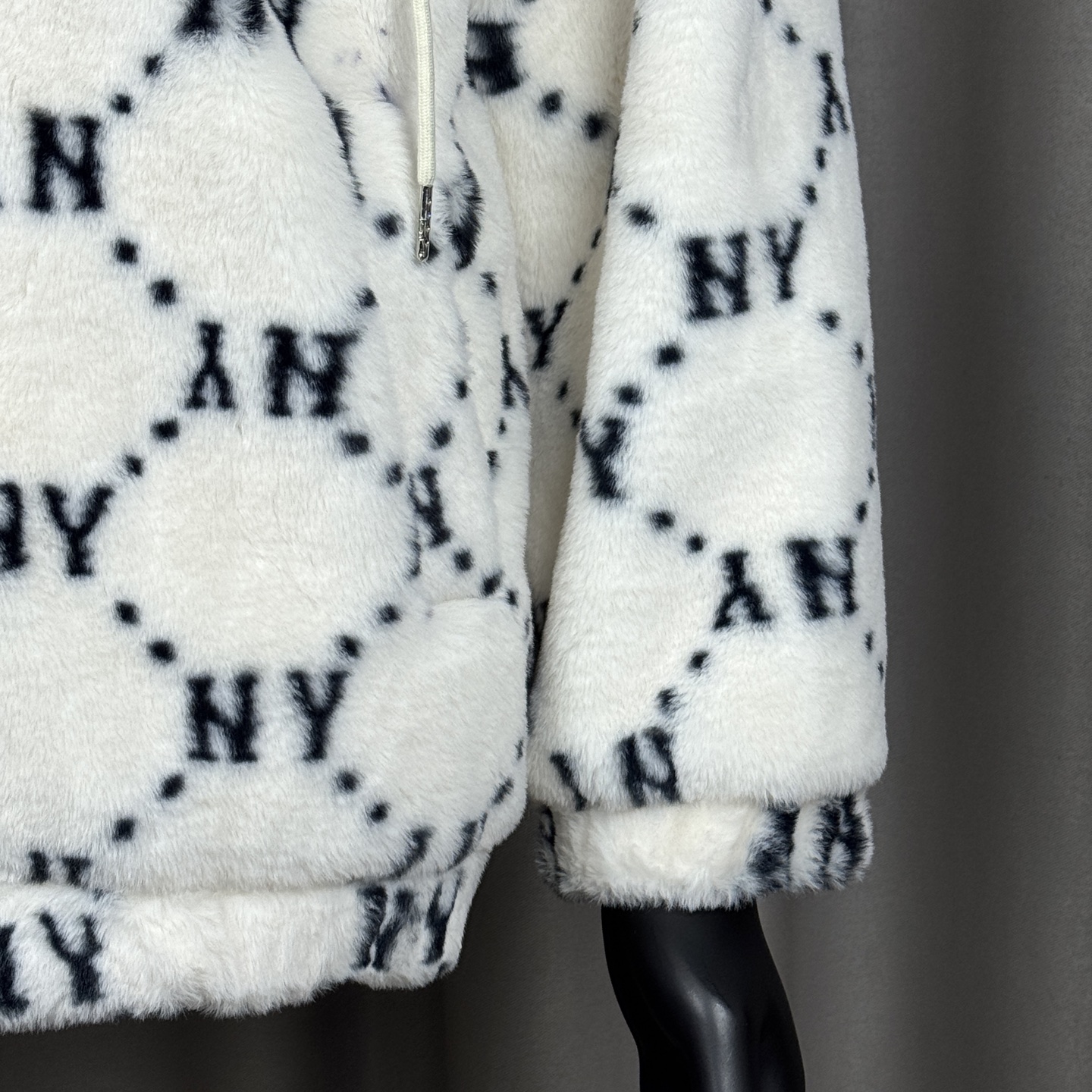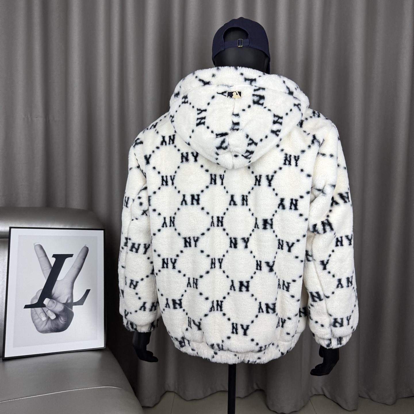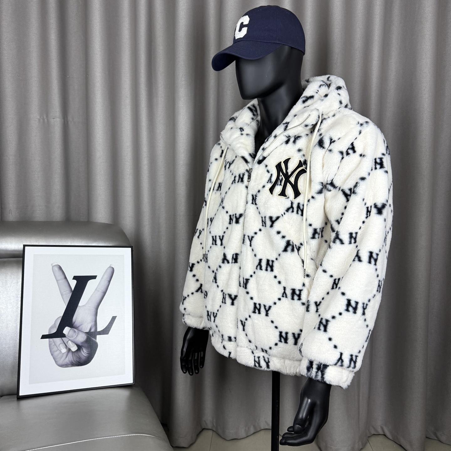 面料采用原版定制高克重优质仿兔毛 上身柔软舒适 保暖防风 搭配满印logo里布 帽子上原版贴布刺绣 棒球人 标志 所有五金都有钢印logo 胸前刺绣立体饱满 宽松的版型男女同款不挑身材
