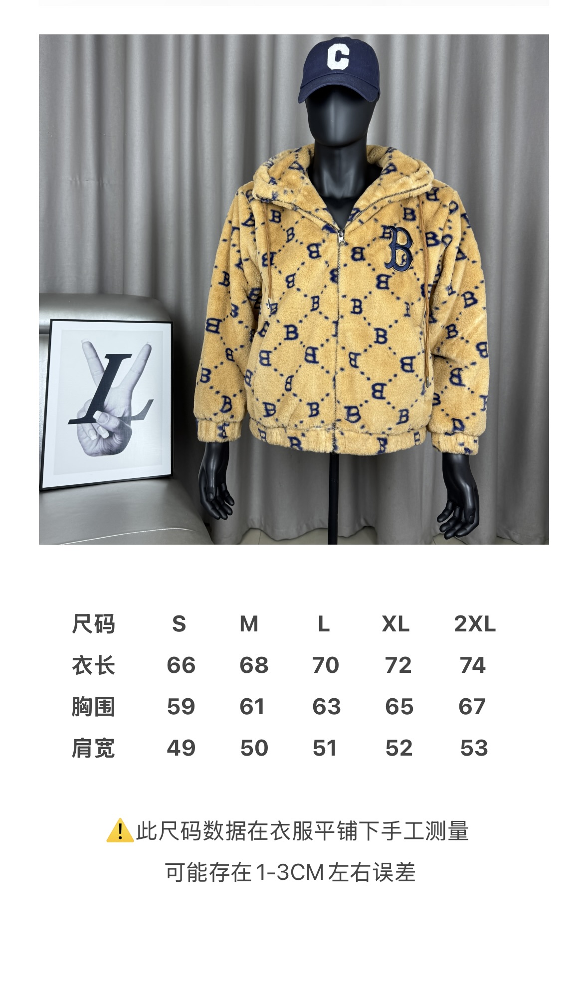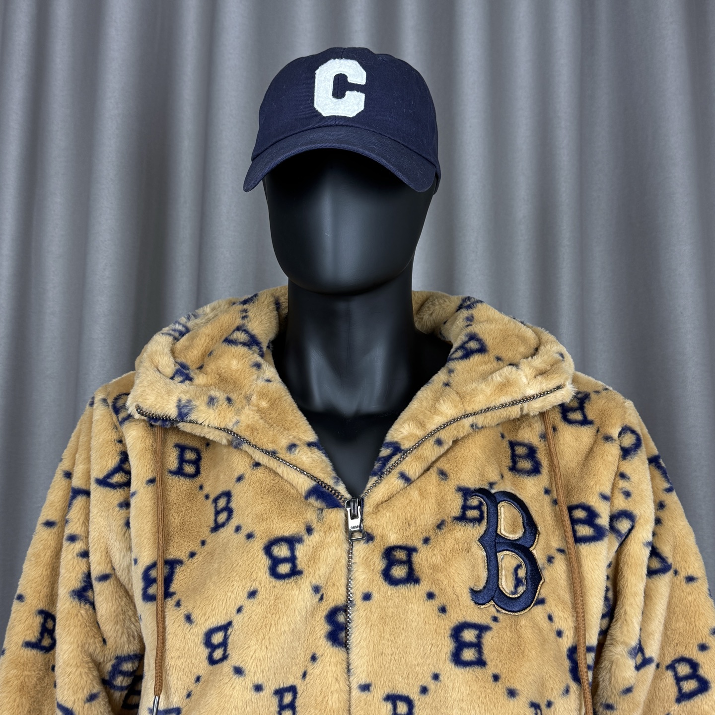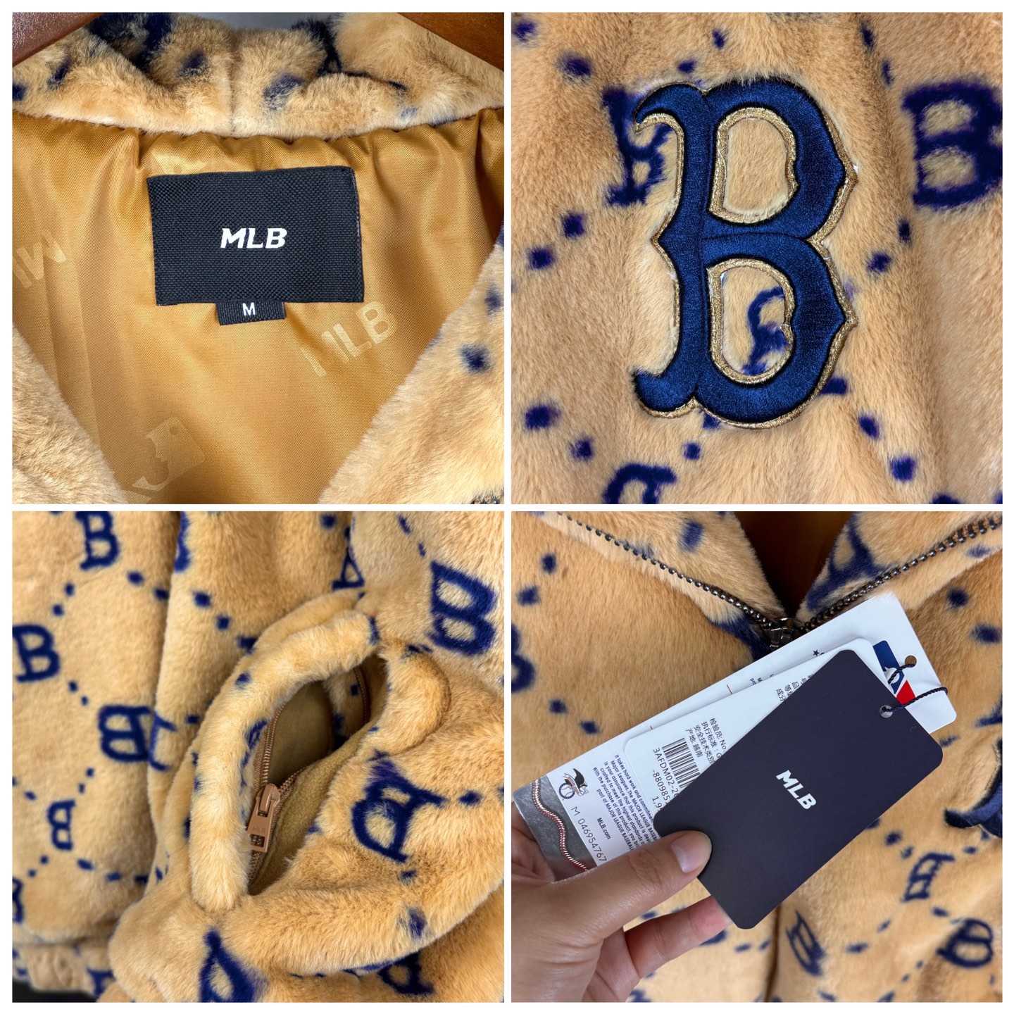 面料采用原版定制高克重优质仿兔毛 上身柔软舒适 保暖防风 搭配满印logo里布 帽子上原版贴布刺绣 棒球人 标志 所有五金都有钢印logo 胸前刺绣立体饱满 宽松的版型男女同款不挑身材