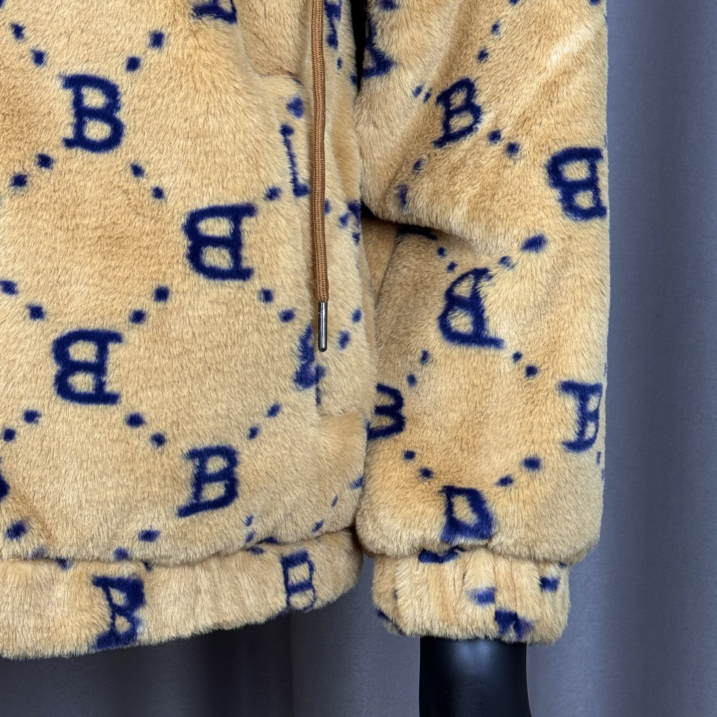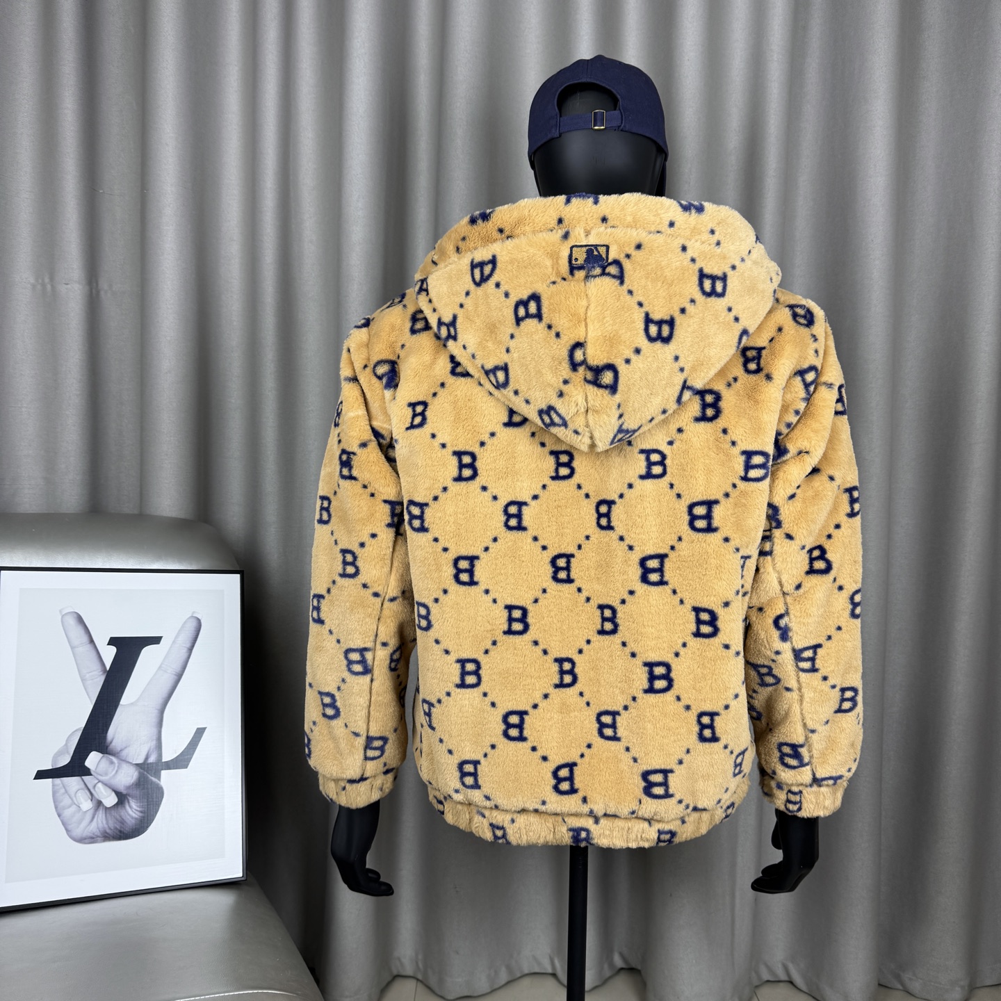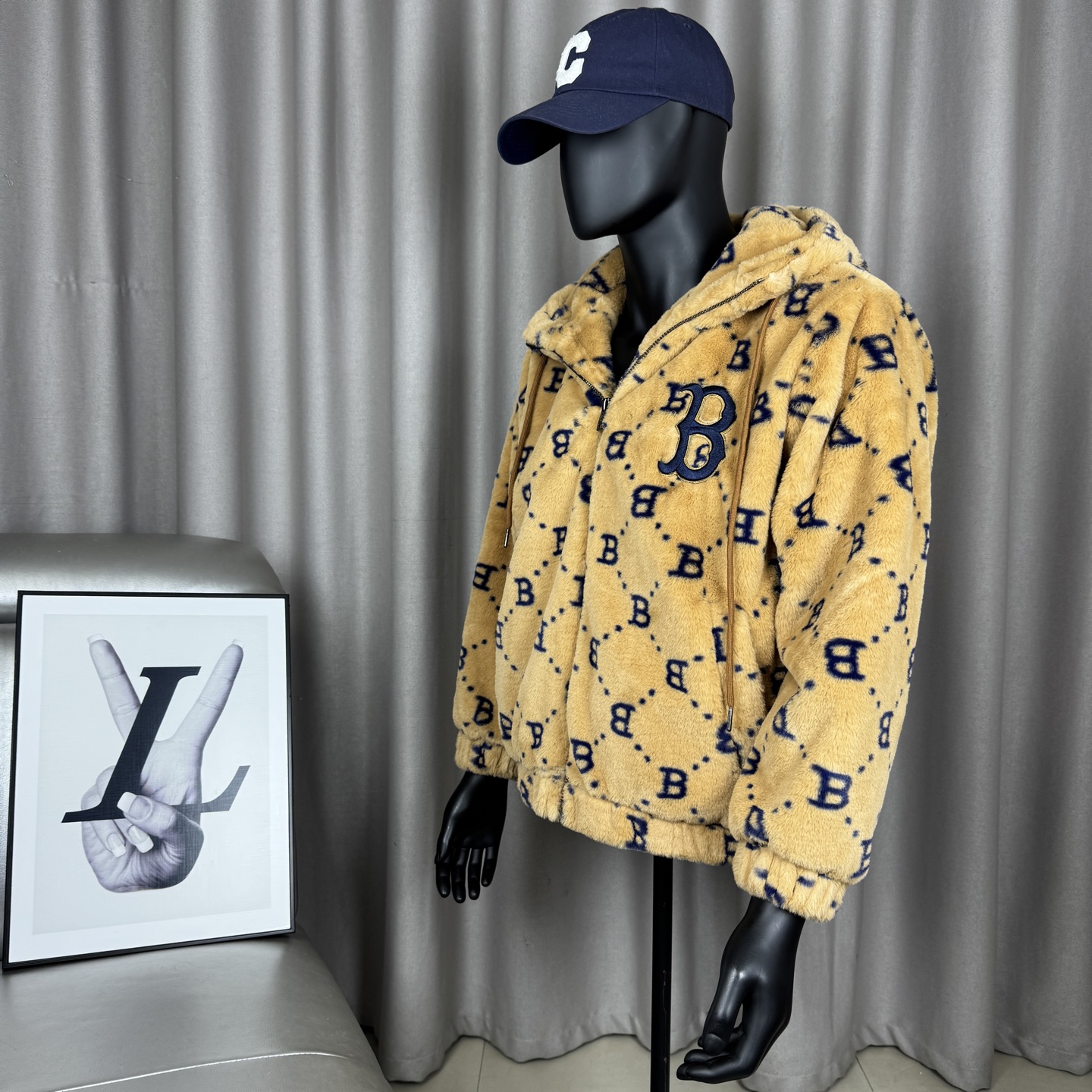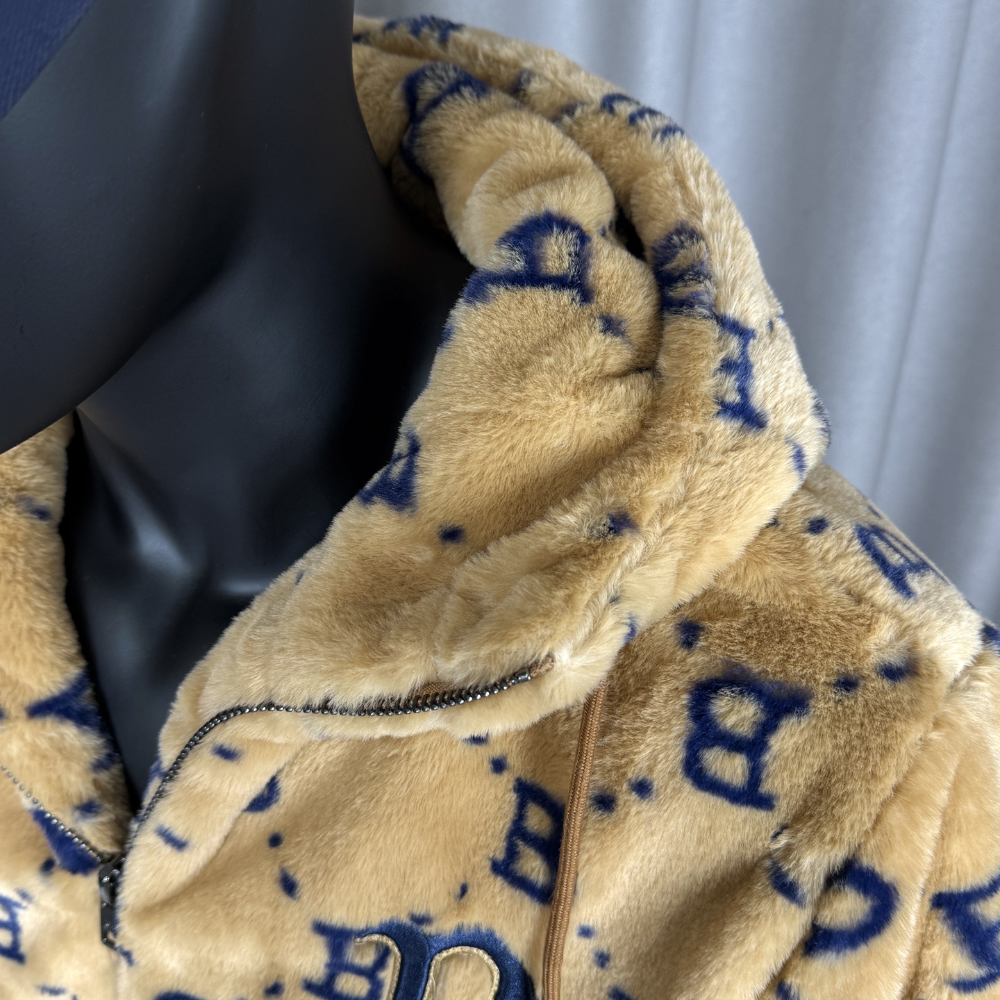 面料采用原版定制高克重优质仿兔毛 上身柔软舒适 保暖防风 搭配满印logo里布 帽子上原版贴布刺绣 棒球人 标志 所有五金都有钢印logo 胸前刺绣立体饱满 宽松的版型男女同款不挑身材