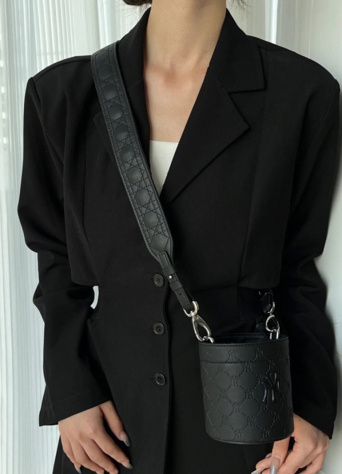 款号 217 配礼盒 2023秋冬新款mlb ny老花香水包潮奢nano水桶包 包包容量非常可 对于女生来说出门装个粉饼 发夹 唇膏足够了 并且非常搭衣服如果想DIY 还可以自己搭配一个链条 标配一根短手提跟一个长肩带 颜色 黑色 尺寸 长13 高12 宽10cm