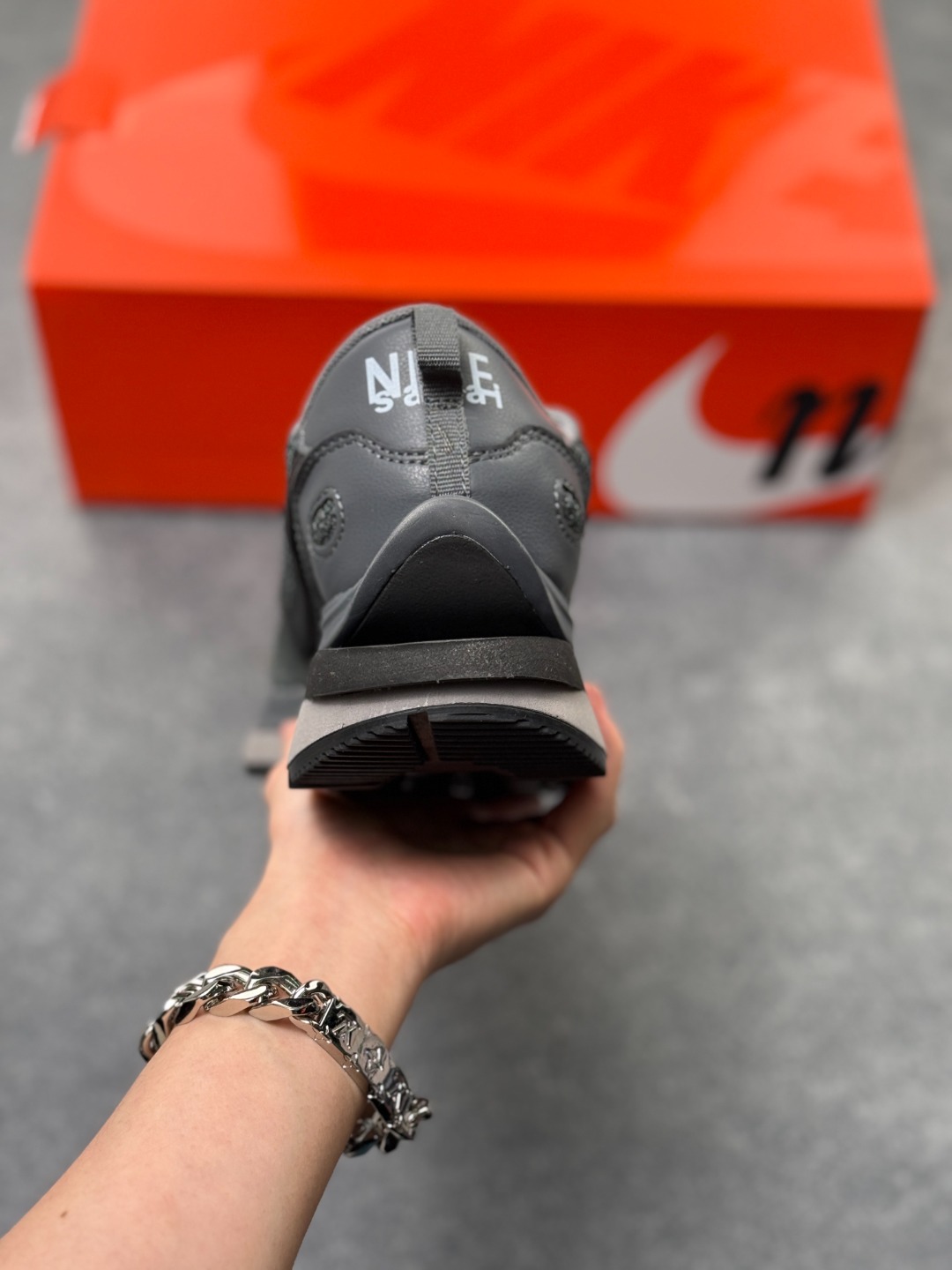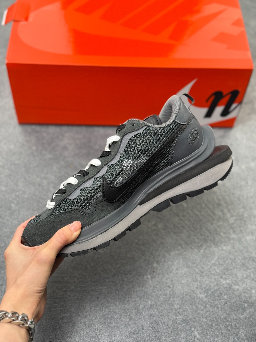 Sacai x VaporWaffle 华夫三代3 0 走秀重磅联名 黑灰 货号 CV1363 105 正确纯原版本 独家原鞋开发 原模数据大底 独家五层分离组合底 原厂长绒皮料 质感十足 注意区分 鞋款由Pegasus与VaporFly两款鞋型的设计元素共同构建 鞋身材质由翻毛皮和透气网布共同打造 熟悉的解构手法 重叠Swoosh 双重鞋舌 鞋带以及后跟SACAI字体都悉数保留 最大亮点在于 本次鞋底变本加厉 层数更多 简直和巴黎世家的TripleS有一拼 增高效果妥妥的 尺码 36 45 半