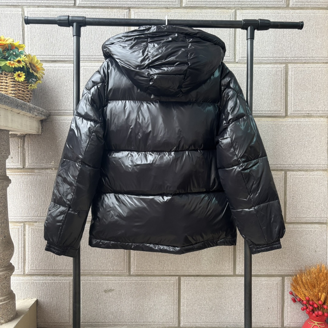 该款羽绒服采用标志性的闪亮漆面尼龙面料制成 双门襟设计可轻松调节款型 点缀标志性三色织带细节 可根据气候情况拆卸风帽 打造更简洁造型