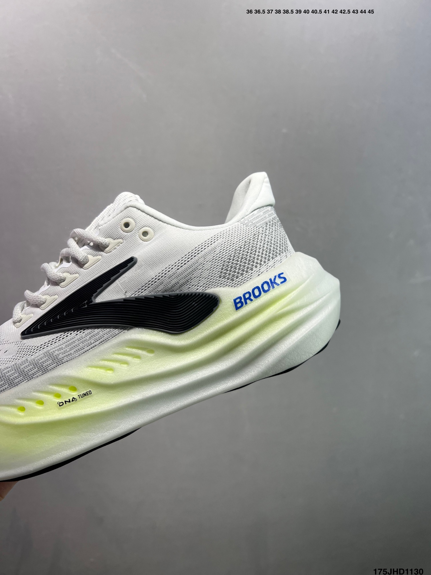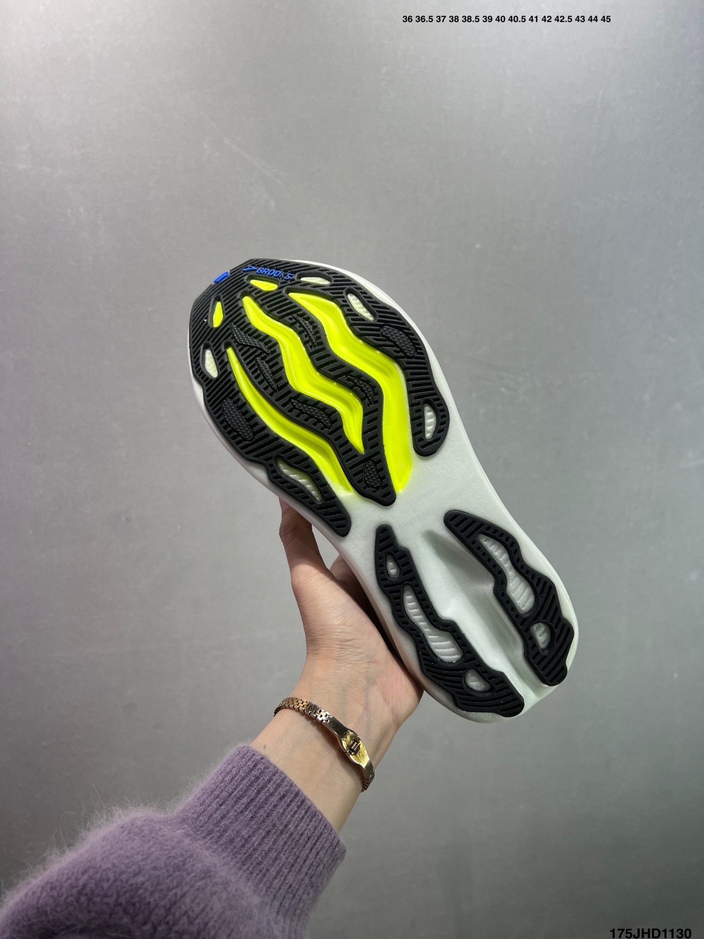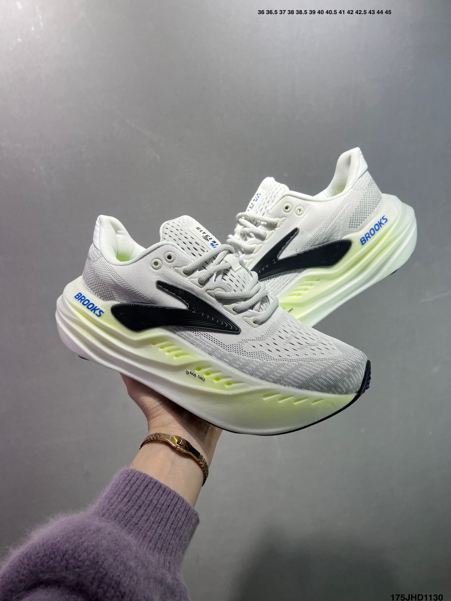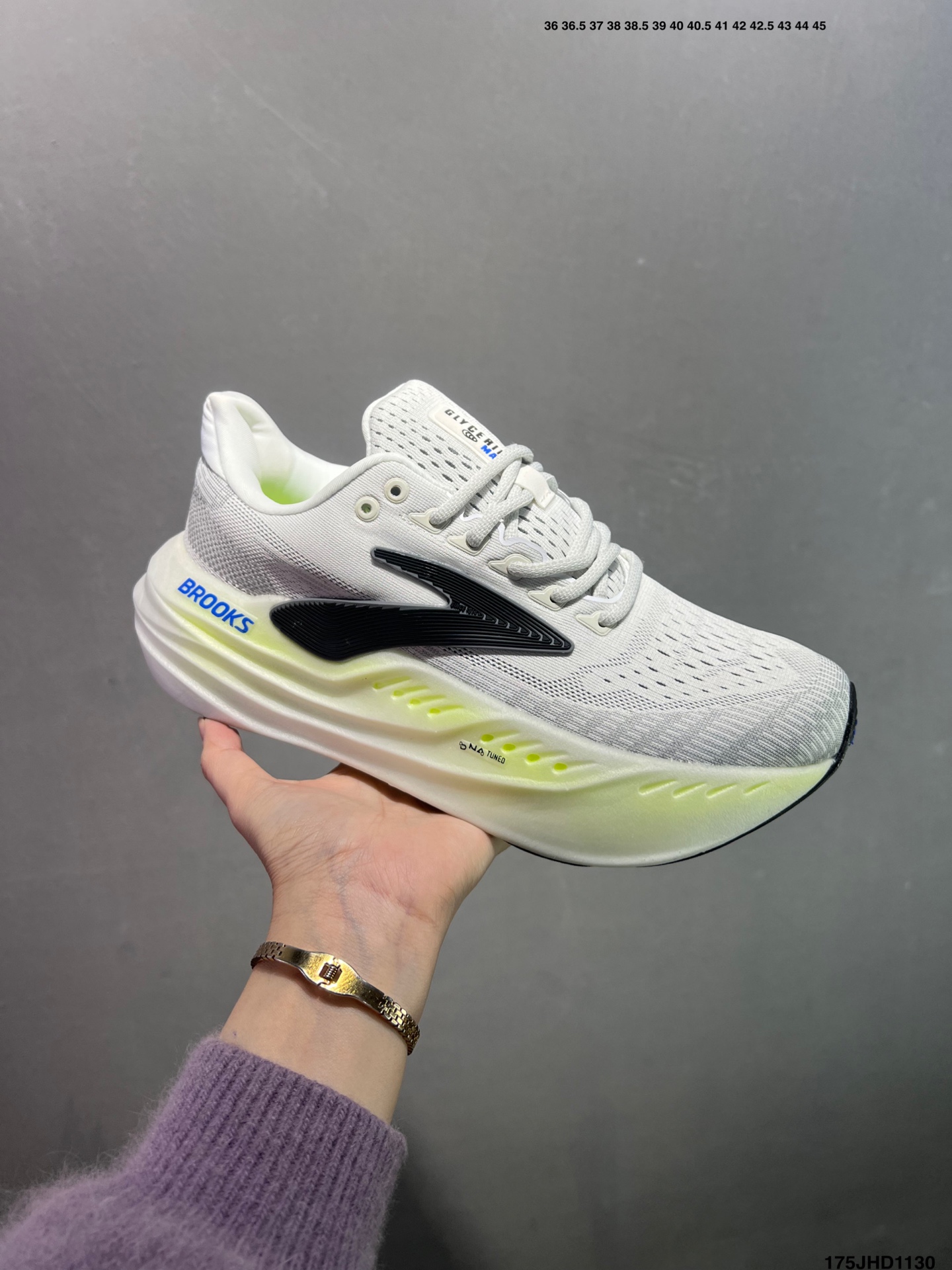 Brooks 布鲁克斯Glycerin Max 超级甘油 厚底马拉松缓震跑鞋 该鞋以厚实的中底和高分子注氮技术为特点 提供极致的缓震性能 鞋面柔软厚实 具有良好的包裹性能和散热性能 大底设计简单 纹路深 适合城市路面 货号 120436 1D 118 码数 如图 编码 175JHD1130