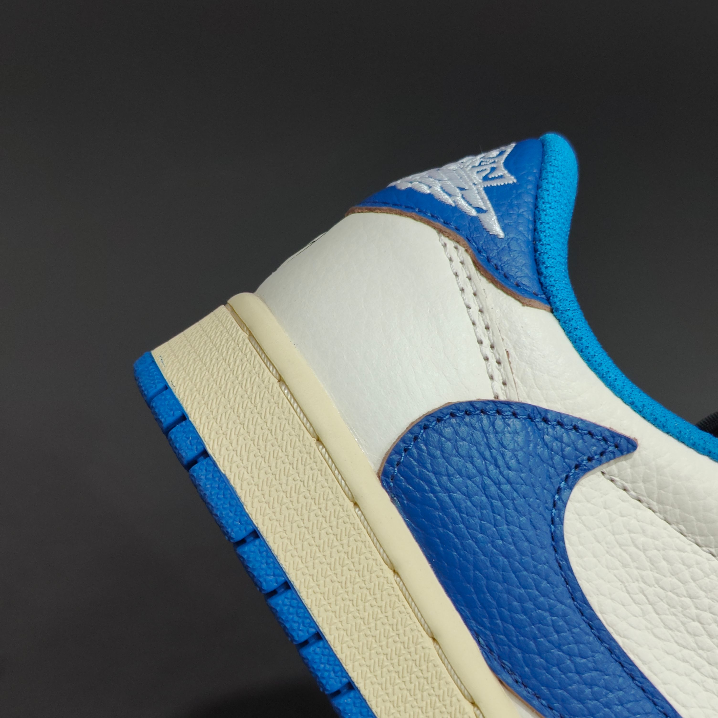 延续 Travis Scott 标志性的反向勾设计 辨识度极高 后跟处印有藤原浩 Fragment Design 的双闪电标志 象征双方合作的身份 鞋面采用柔软皮革拼接 细节丰富且层次分明 既保留了 AJ1 的经典结构 又融入街头感十足的潮流元素