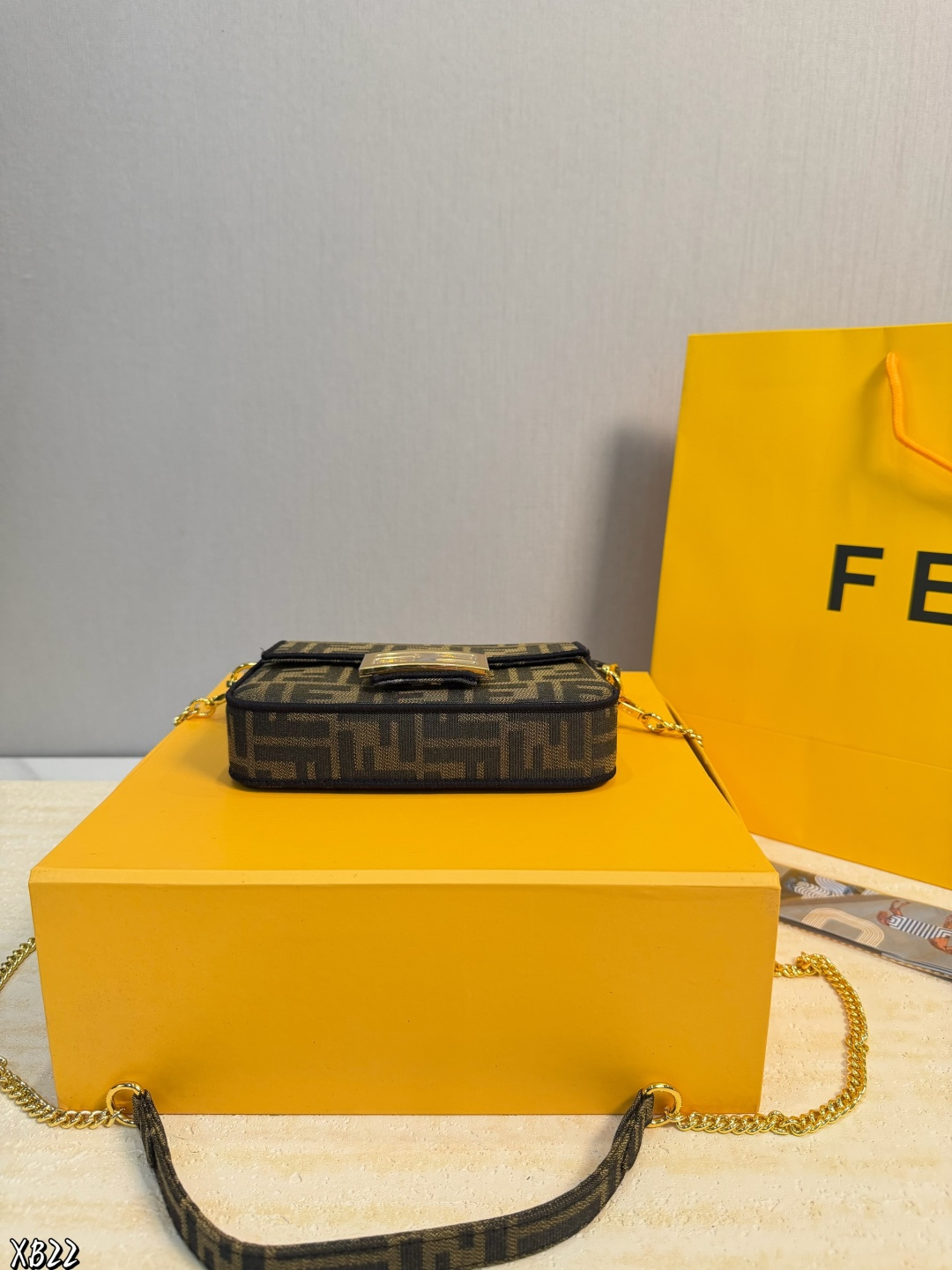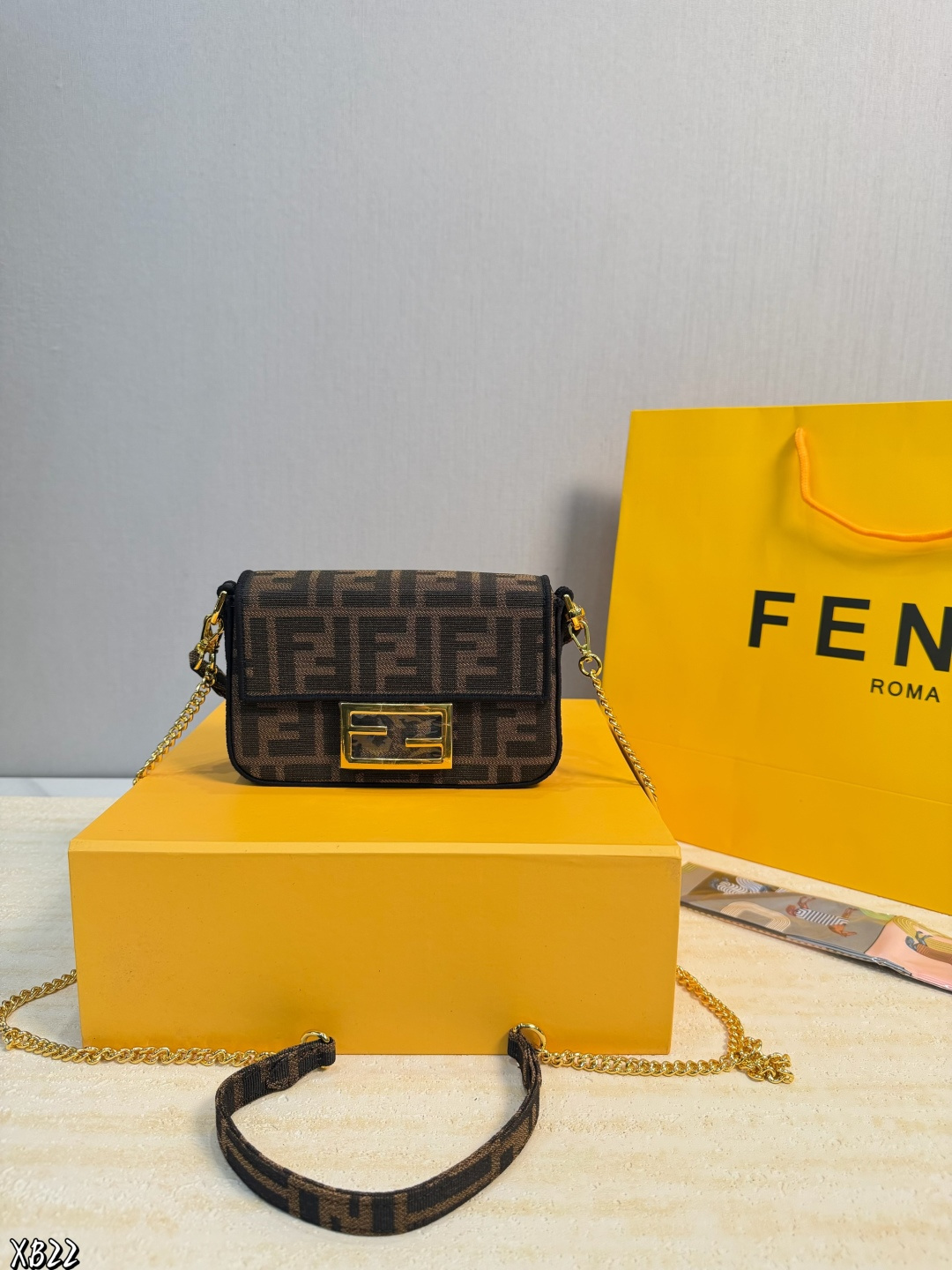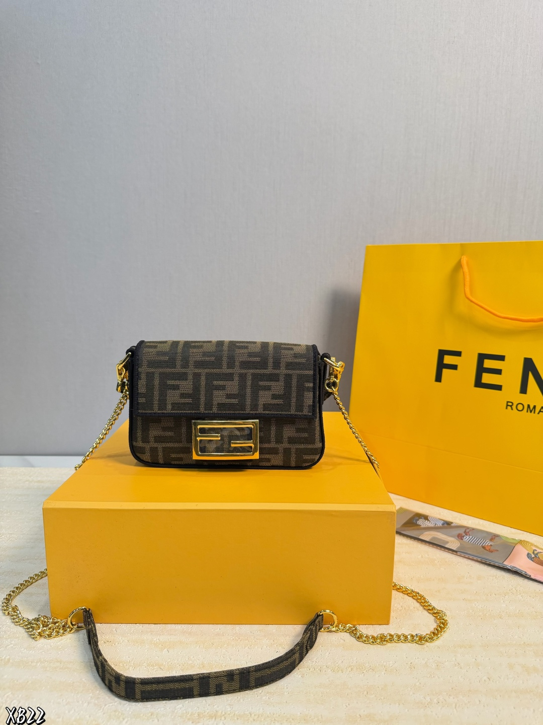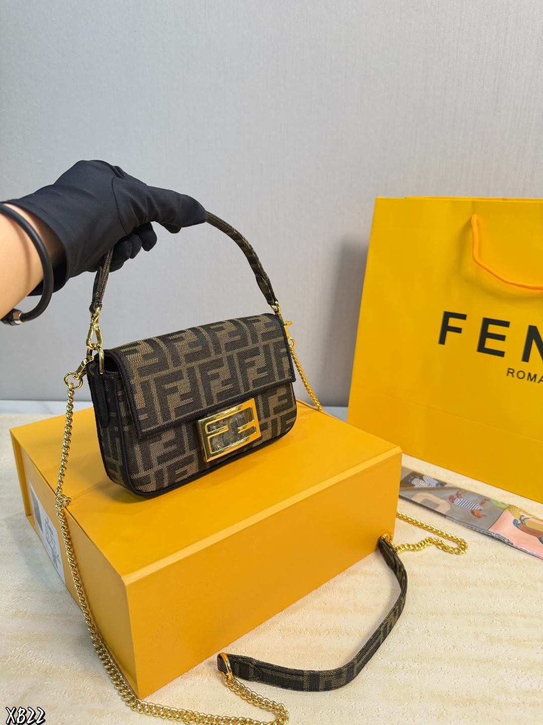 礼盒包装 米兰时装周街拍中 潮人们背的最多的包包大概就是Fendi芬迪的这款法棍包 Baguette 了 从黑色再到粉色 各种颜色应有尽有 单肩 斜跨都不是问题 有种慵慵懒懒的街头风 戚薇 Rosie等明星日常出街也会背 尺寸 18 10cm