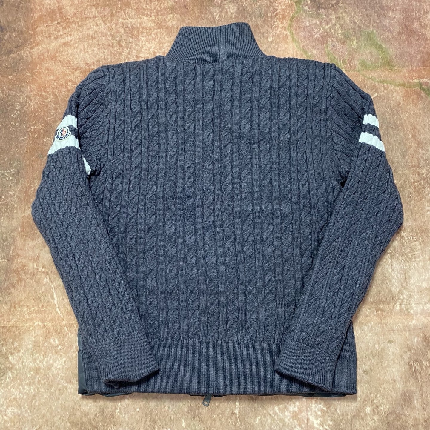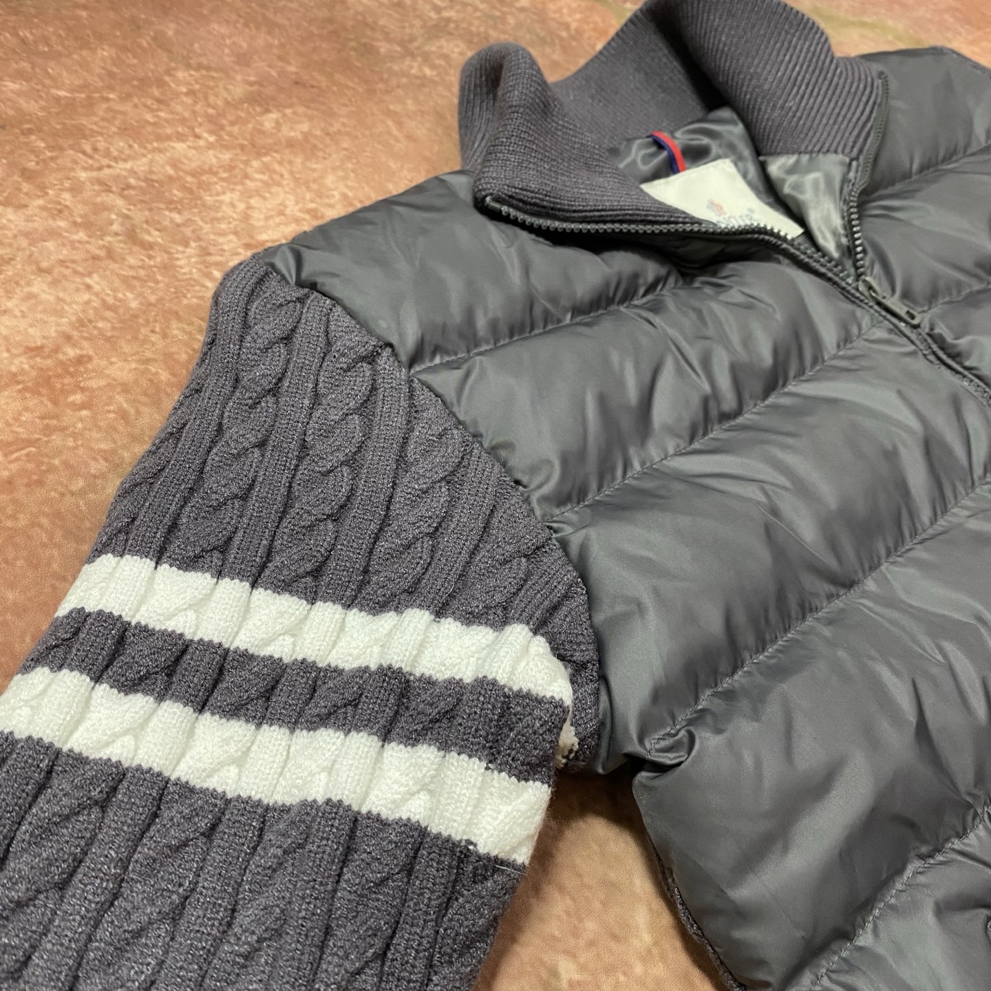 立领设计 合身直筒版型 拉链闭合 M针织拼接羽绒前幅90绒填充 拼接处采用羊毛材质 袖子饰有补丁徽章 立领拉链开合