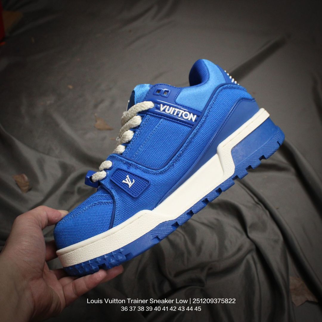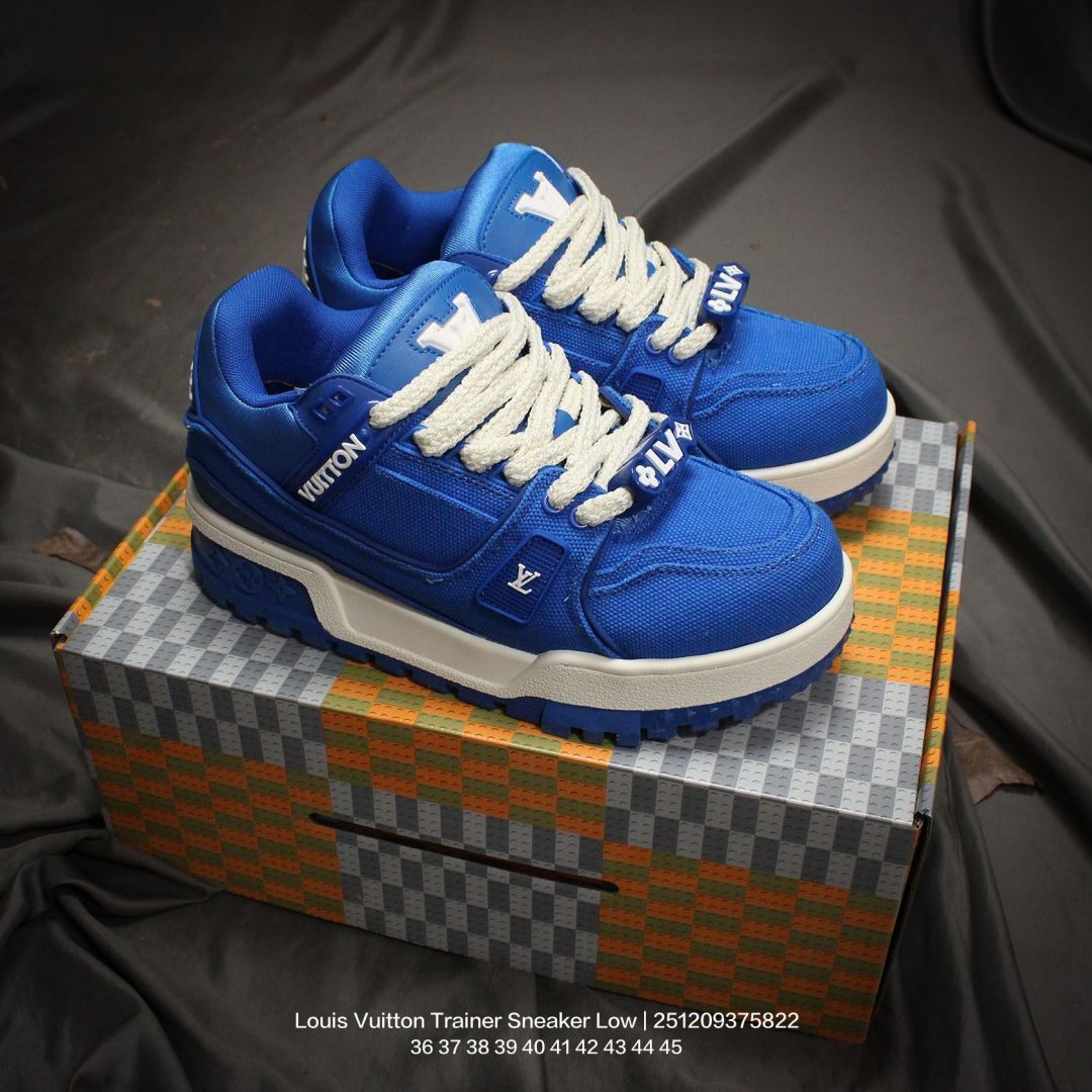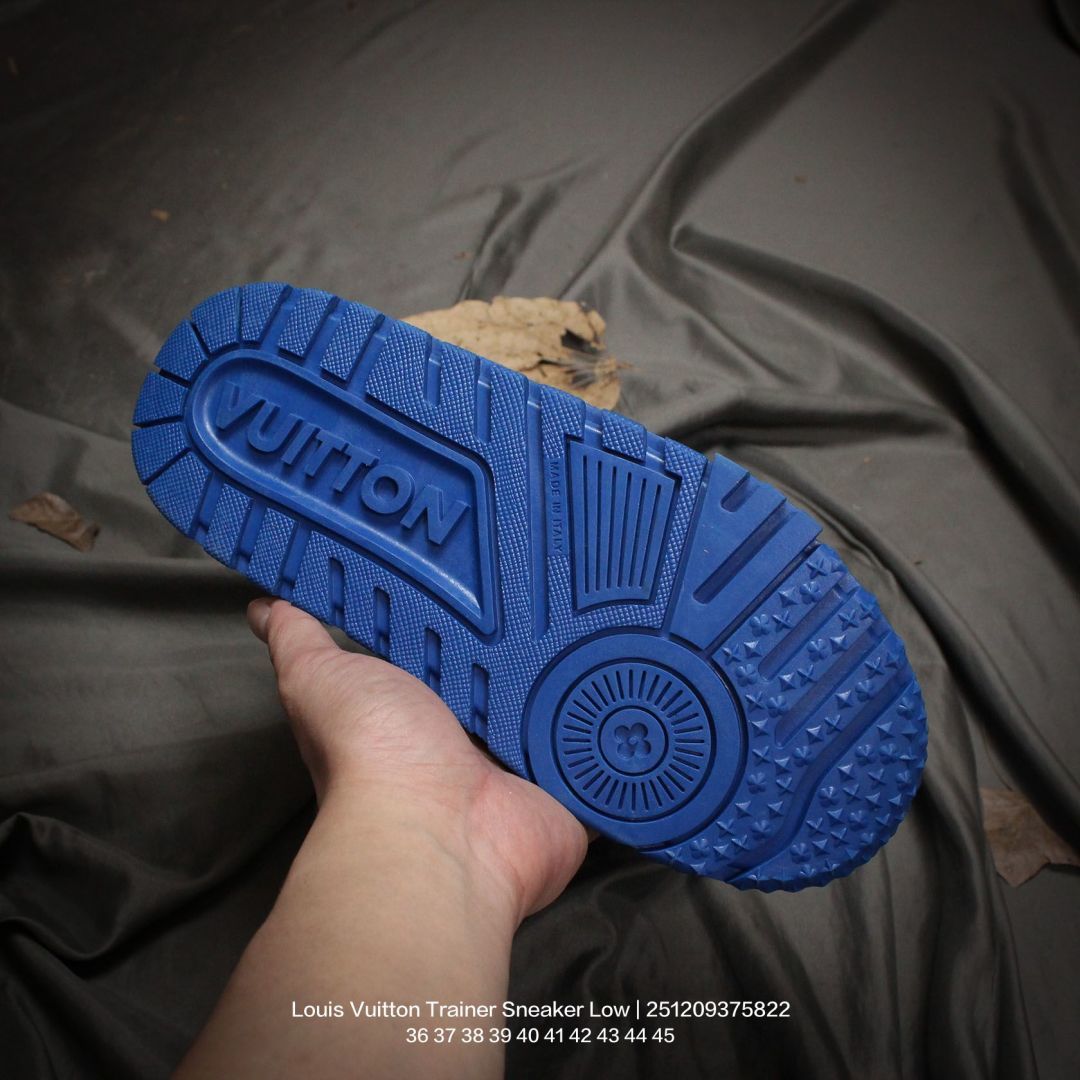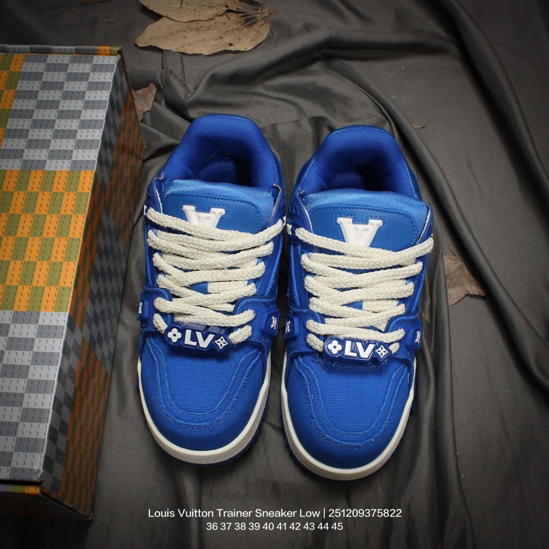 Louis Vuitton 路易威登 男女鞋配置厚实抽屉礼品鞋盒 采用荔枝纹纤维革组合粒面牛剖革鞋面材质 鞋垫嵌入软脚感EVA物料 外置TPR光泽隔色鞋底法国巴黎百年奢侈品牌LV路易威登Louis Vuitton Trainer Sneaker Low 运动系列低帮复古百搭休闲运动文化篮球板鞋