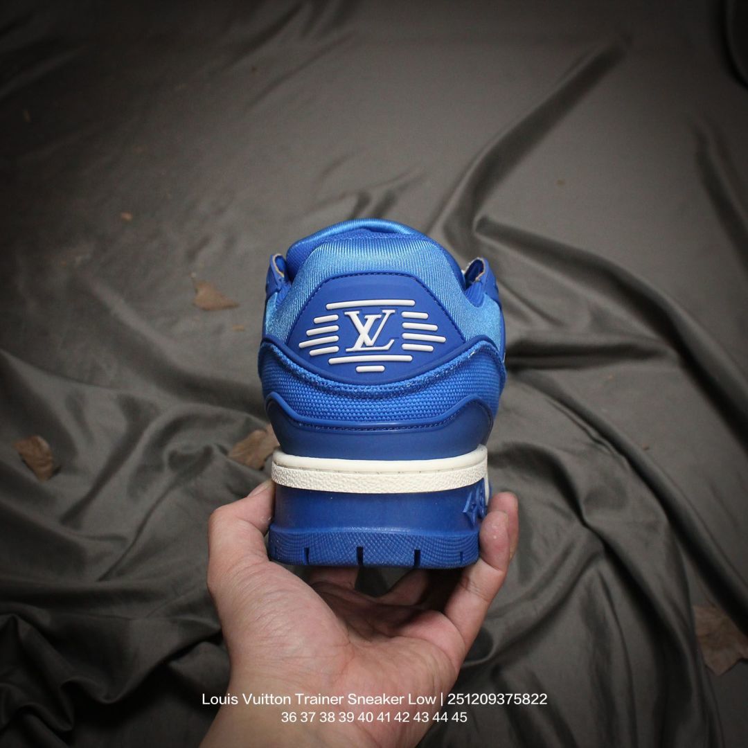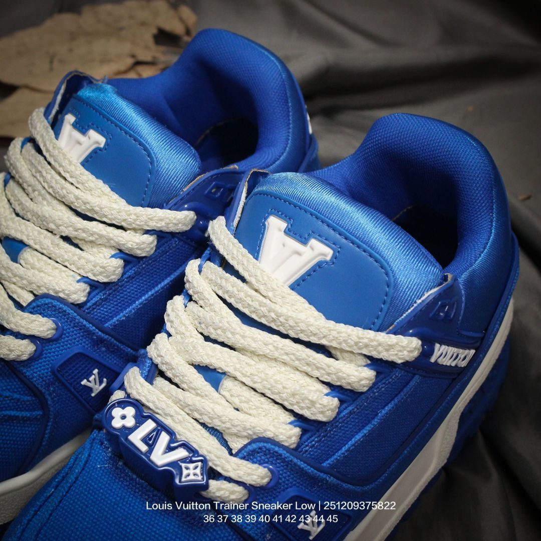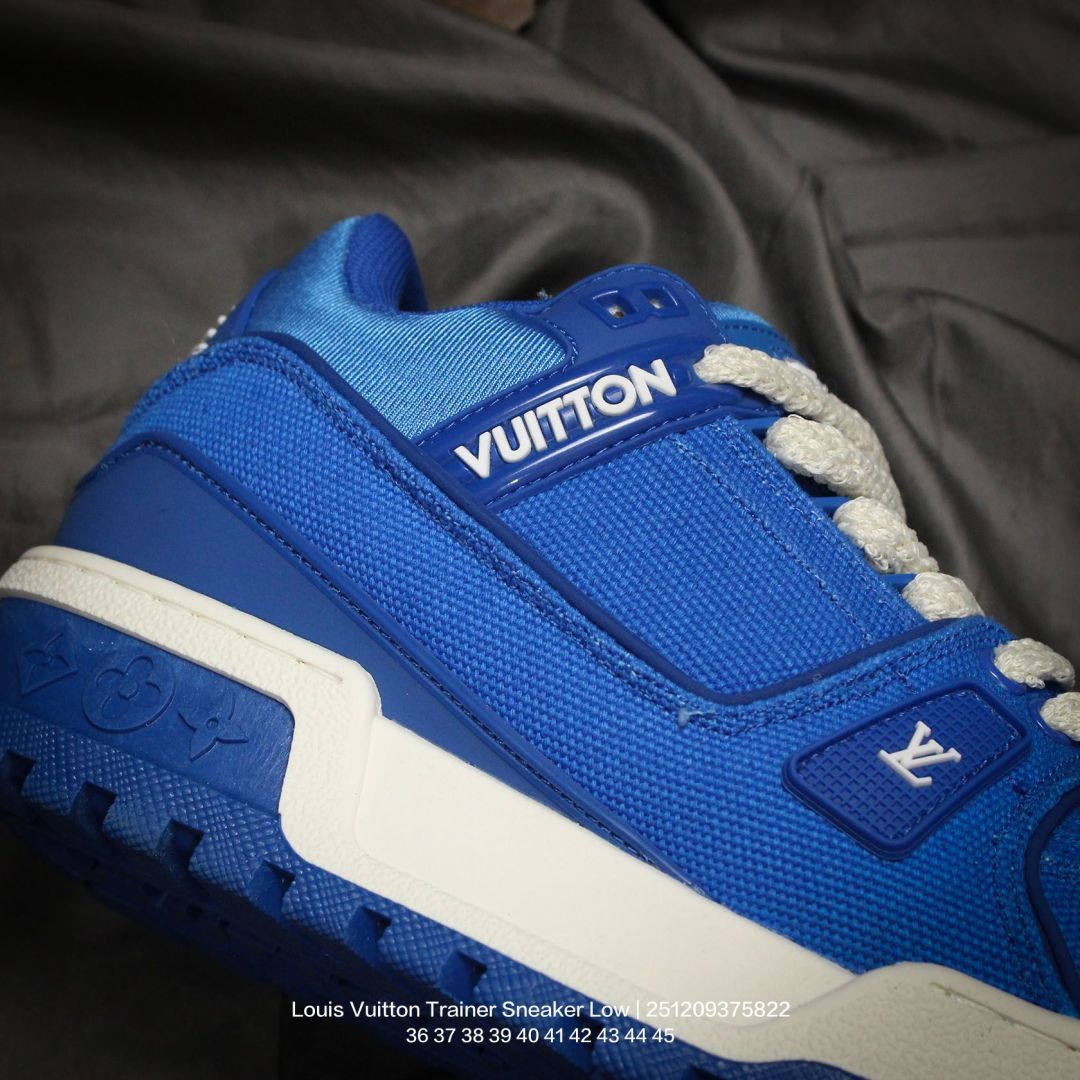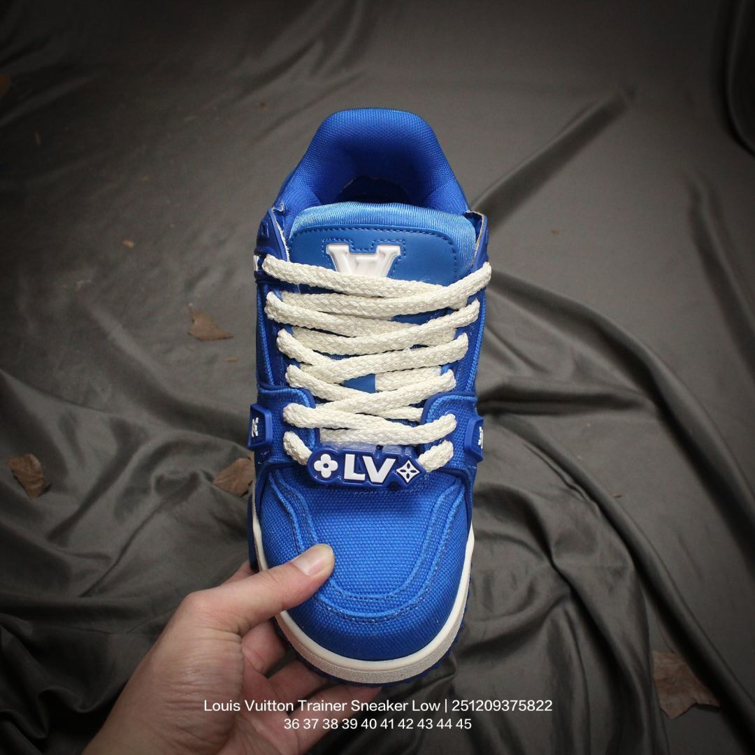 Louis Vuitton 路易威登 男女鞋配置厚实抽屉礼品鞋盒 采用荔枝纹纤维革组合粒面牛剖革鞋面材质 鞋垫嵌入软脚感EVA物料 外置TPR光泽隔色鞋底法国巴黎百年奢侈品牌LV路易威登Louis Vuitton Trainer Sneaker Low 运动系列低帮复古百搭休闲运动文化篮球板鞋