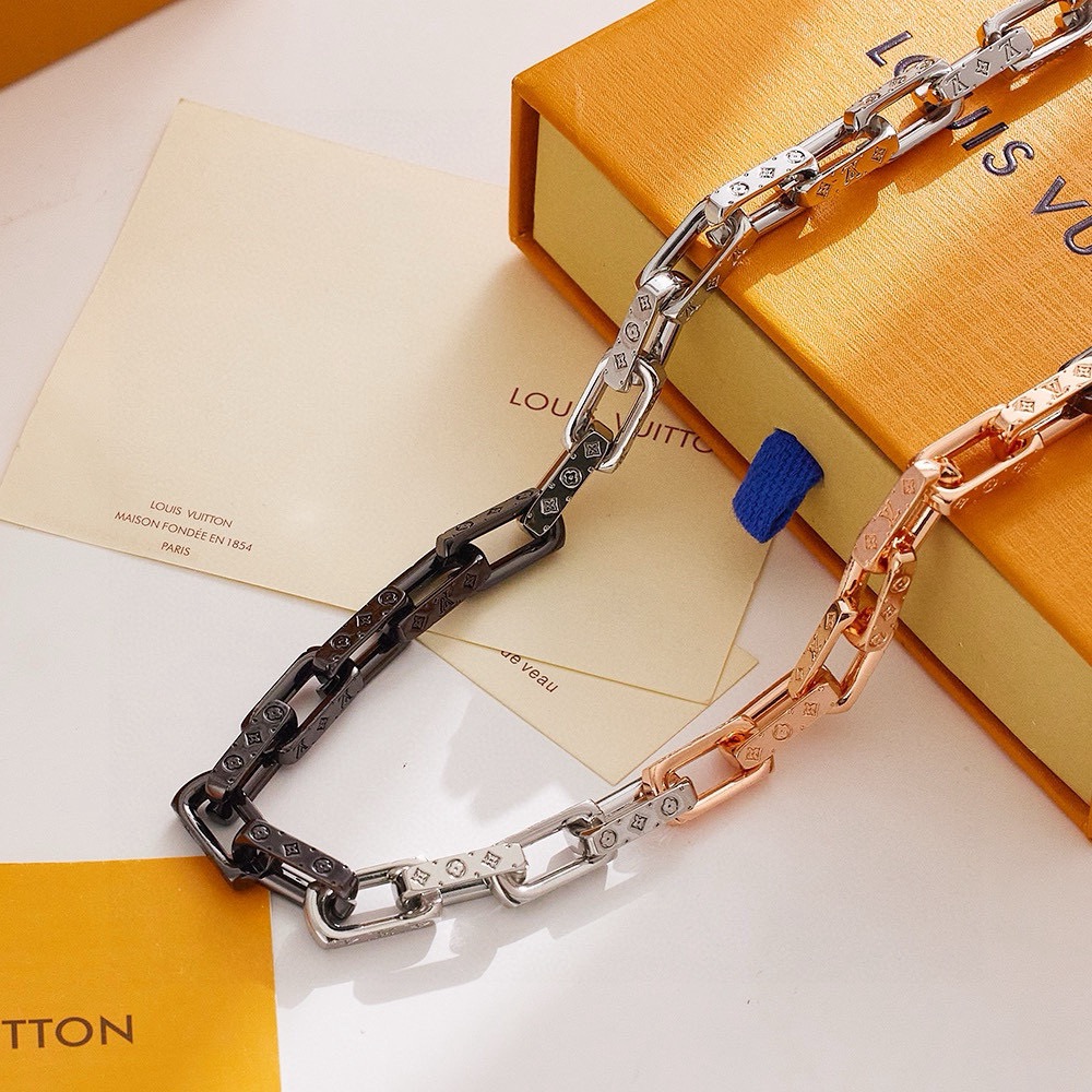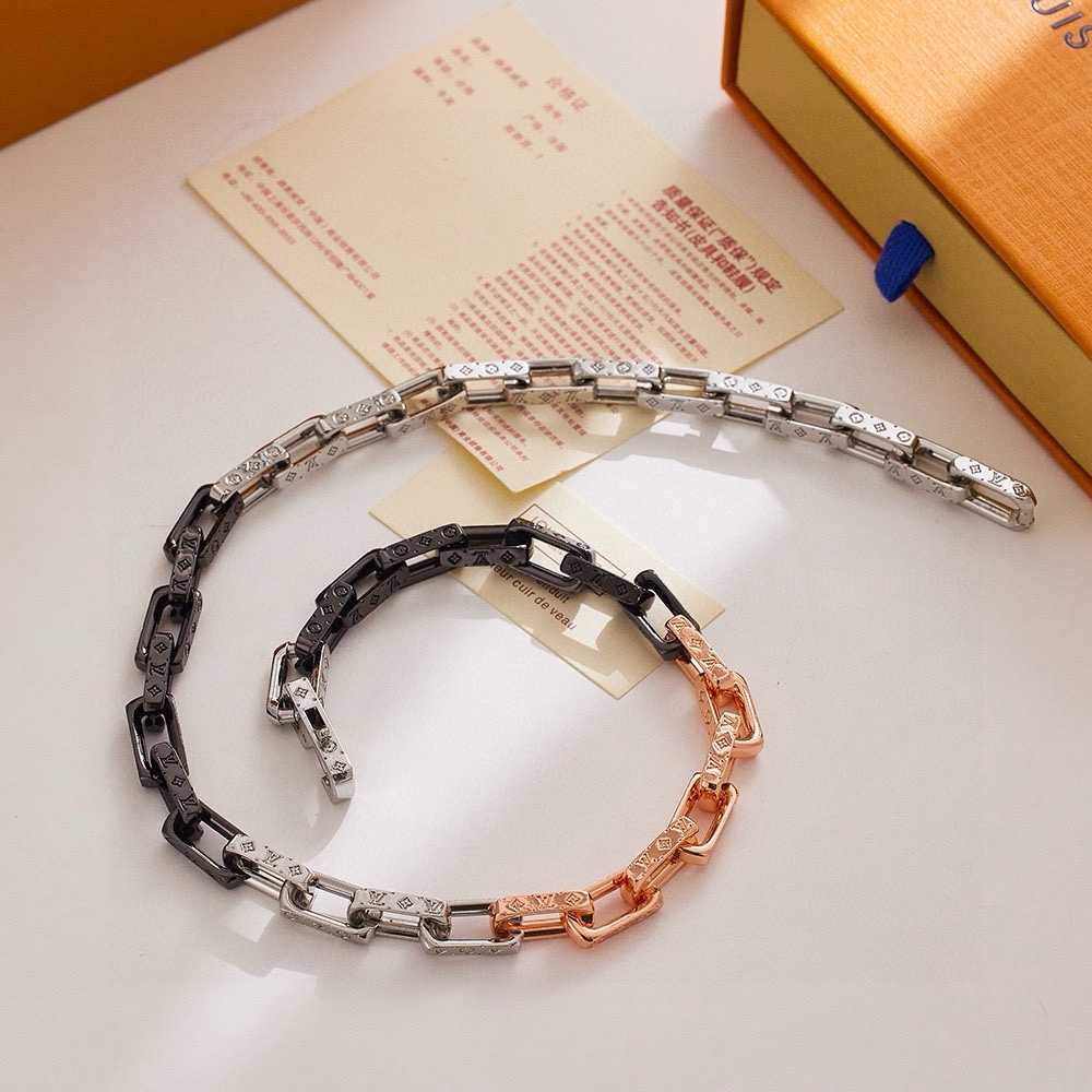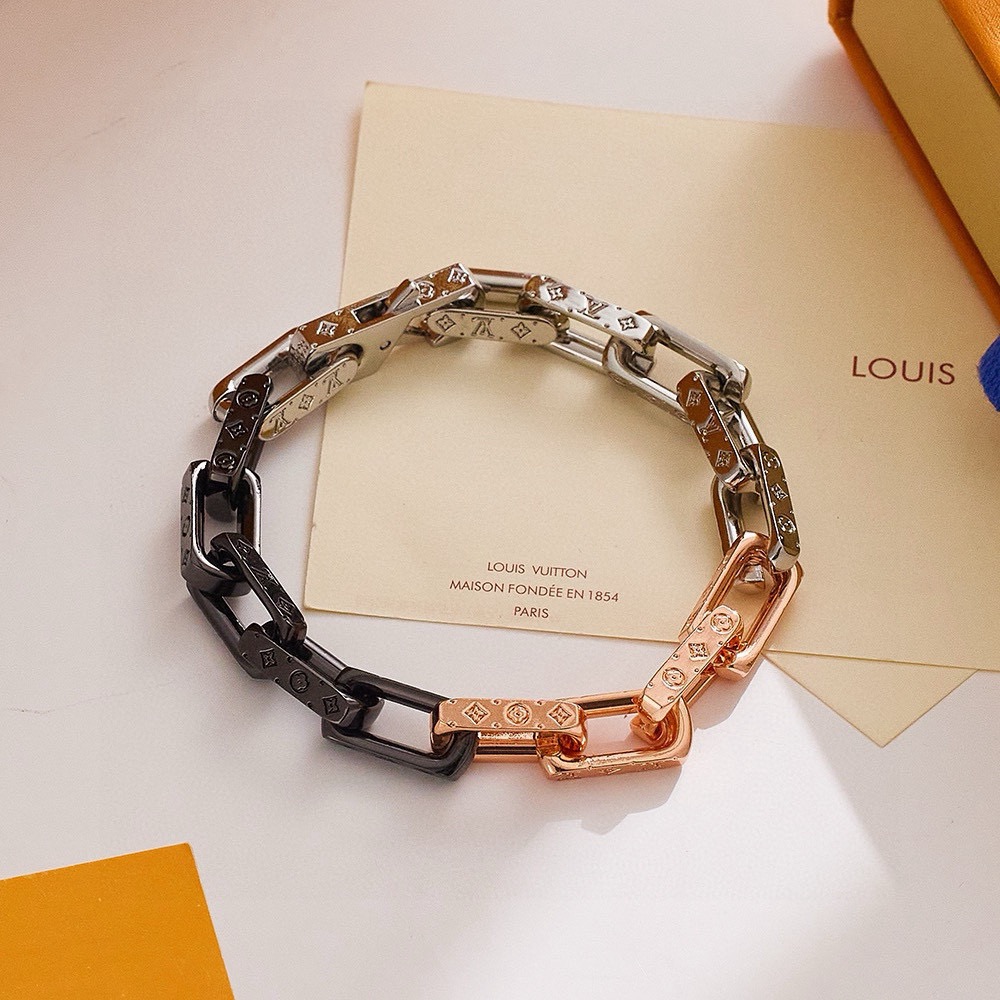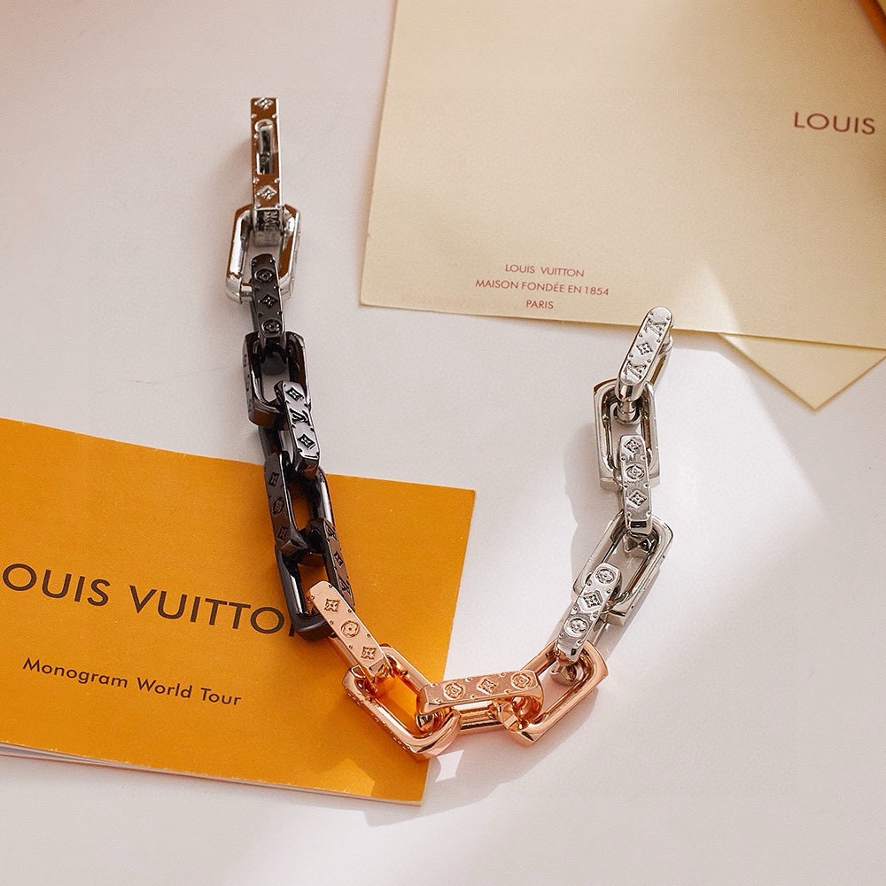 LV路易威登香槟金拼色手链 配全套包装 Monogram Chain 手链携新色再度回归视野 精钢链环释放刚毅工业气息 细致镂刻经典 Monogram 图案 彰显英武魅力和繁复设计的瞩目融合 成就赠予潮流人士的上佳之选 详细特征