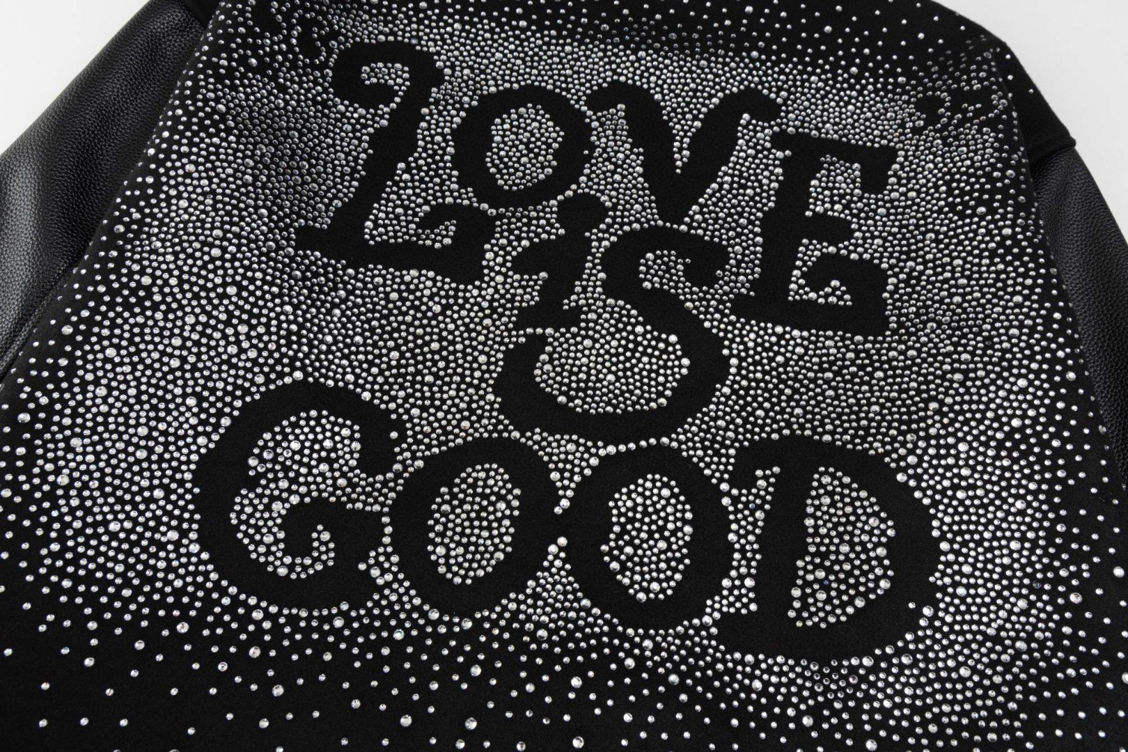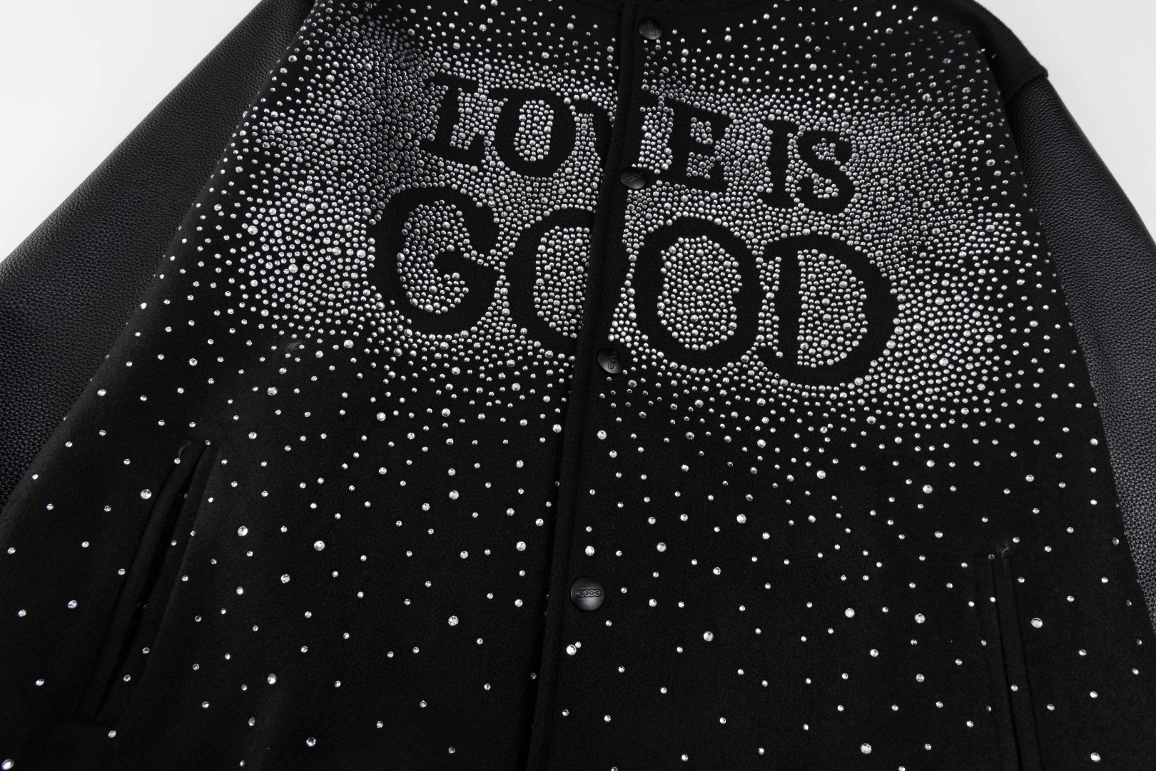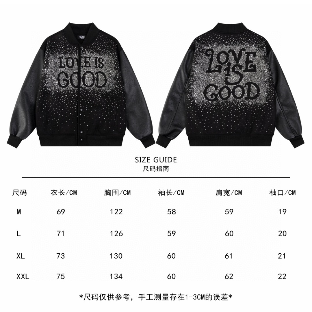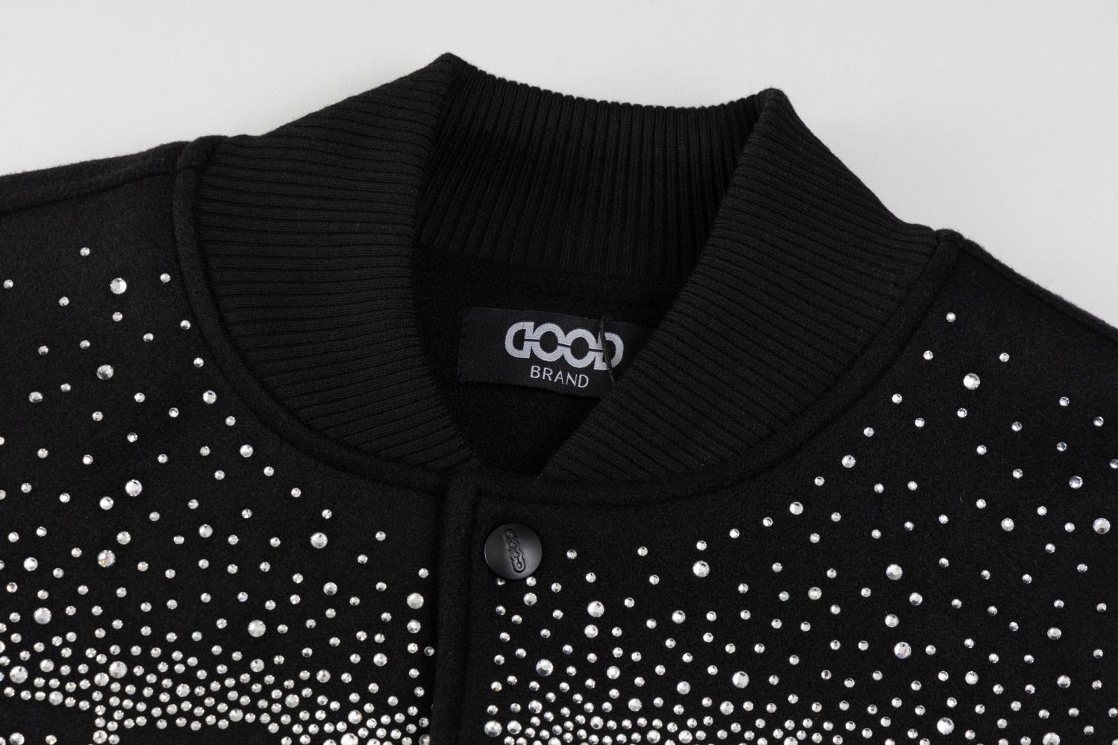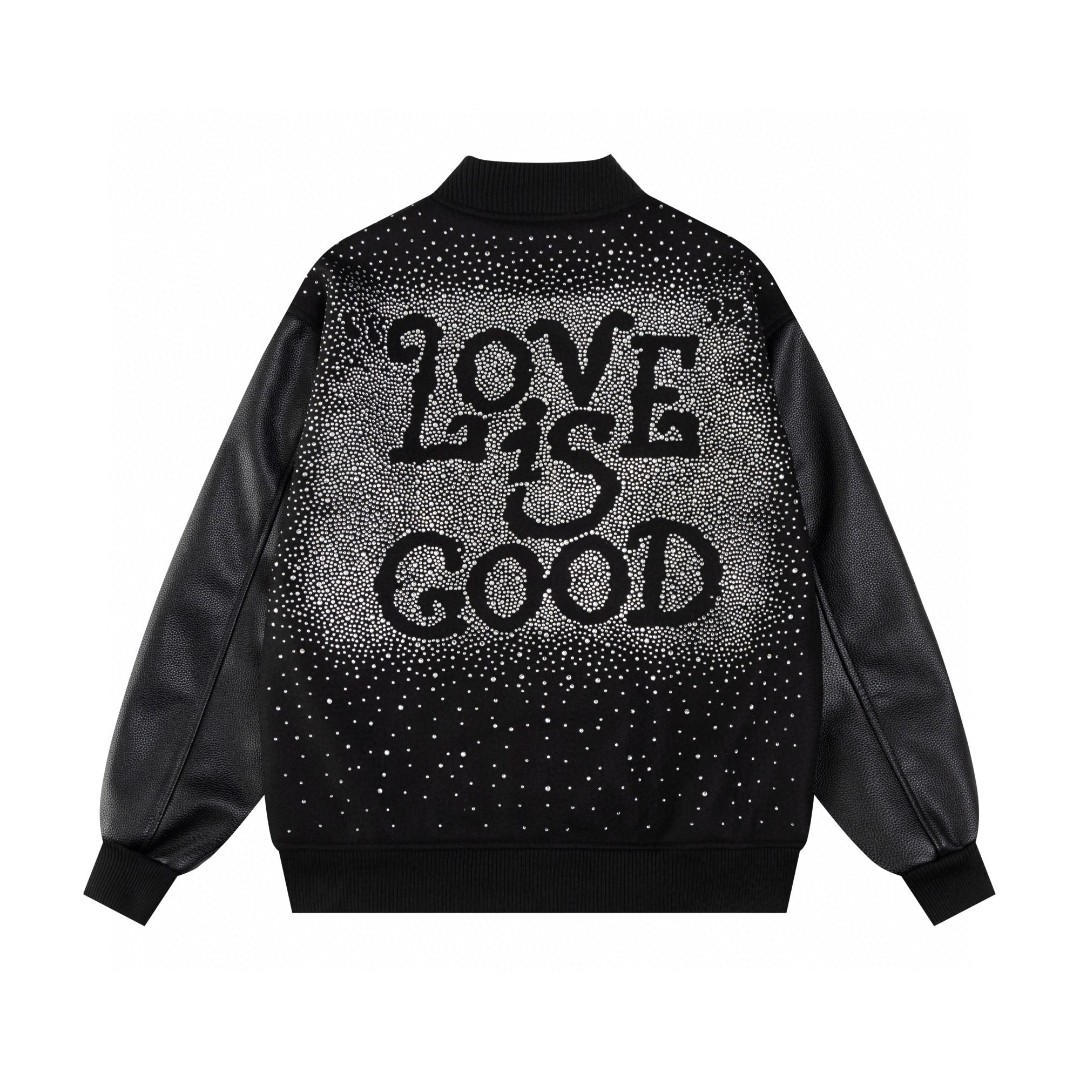 GOODBRAND烫砖贴布绣花工艺棒球服外套 高温烫砖 颗颗饱满 选用防澳白砖石 一颗颗镶嵌 尽显工艺细致 700 克龙凤尼料搭配 荔枝纹皮革袖子 五金配件齐全