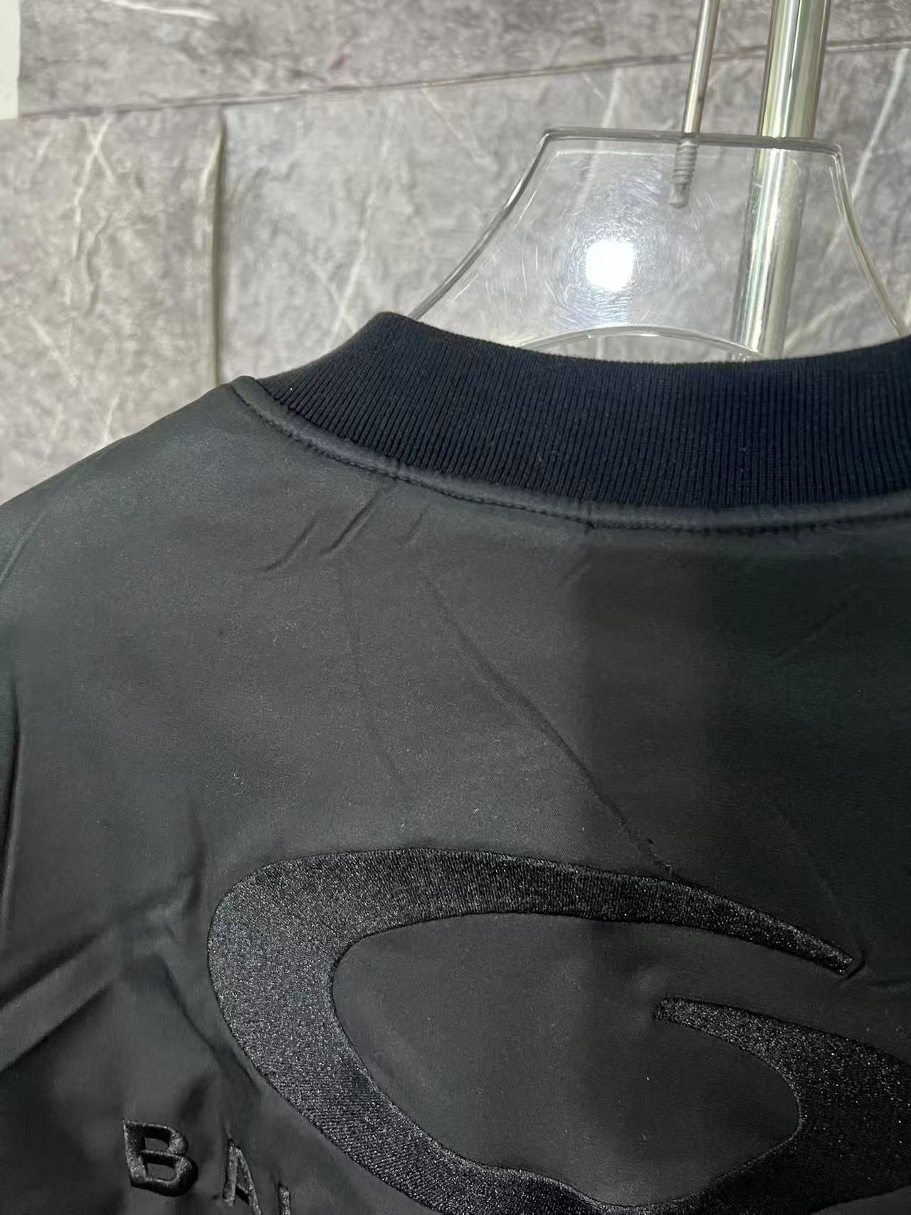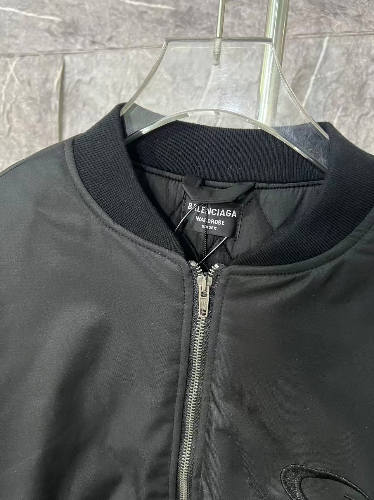 Balenciaga巴黎世家25年ss秋冬季新款Bomber LOGO前后刺绣男女外套 定制面料定制罗纹定制五金 罗纹为纯棉螺纹一条一条现染现织而成 面料为订染定制2000y起订 非市面普通版本 五金开模定制 25年巴黎世家最炸裂的一款外套特别百搭内里夹棉穿上不臃肿款式不挑人百搭时尚 YYDS 男女同款 宽松版型