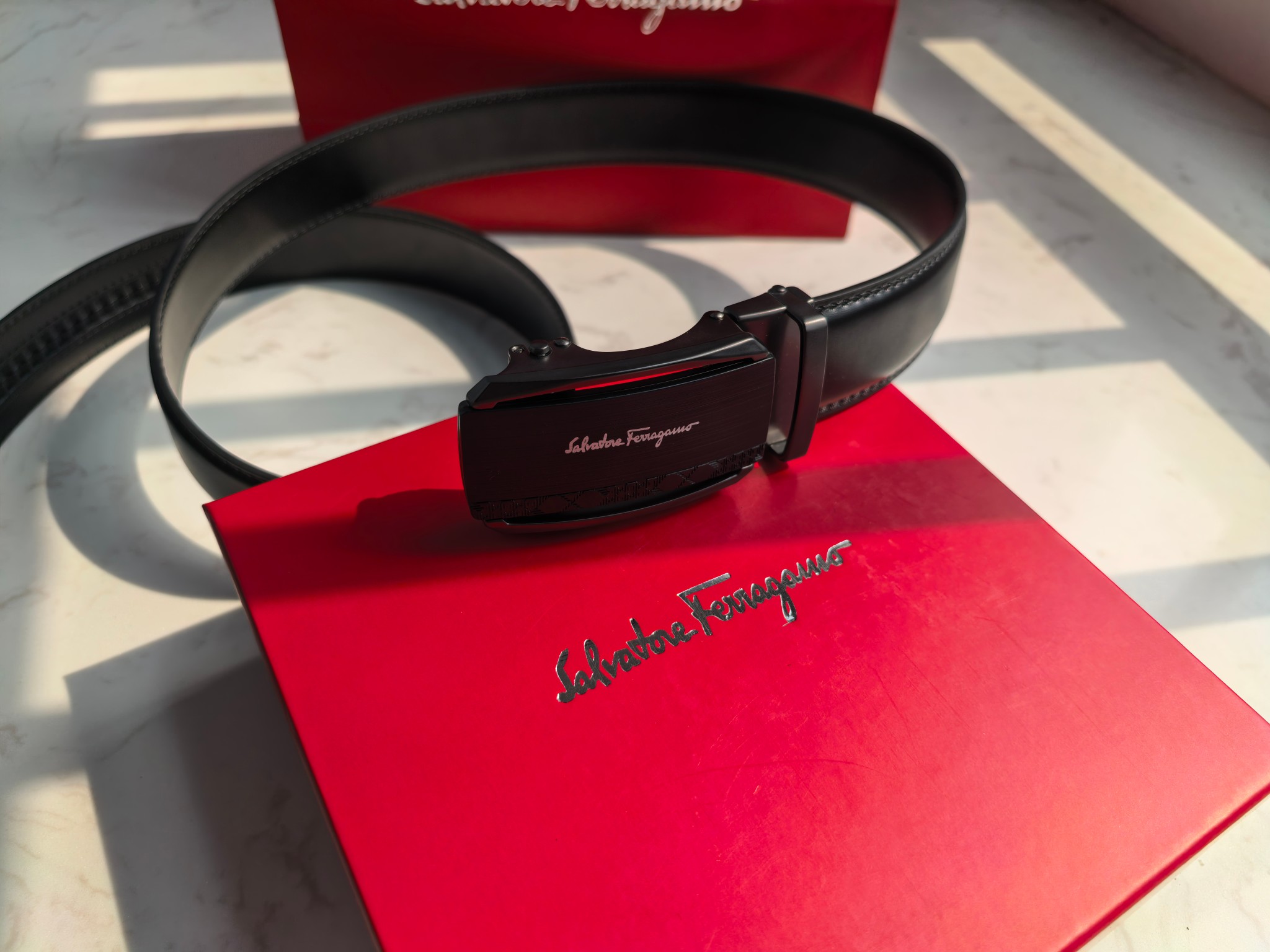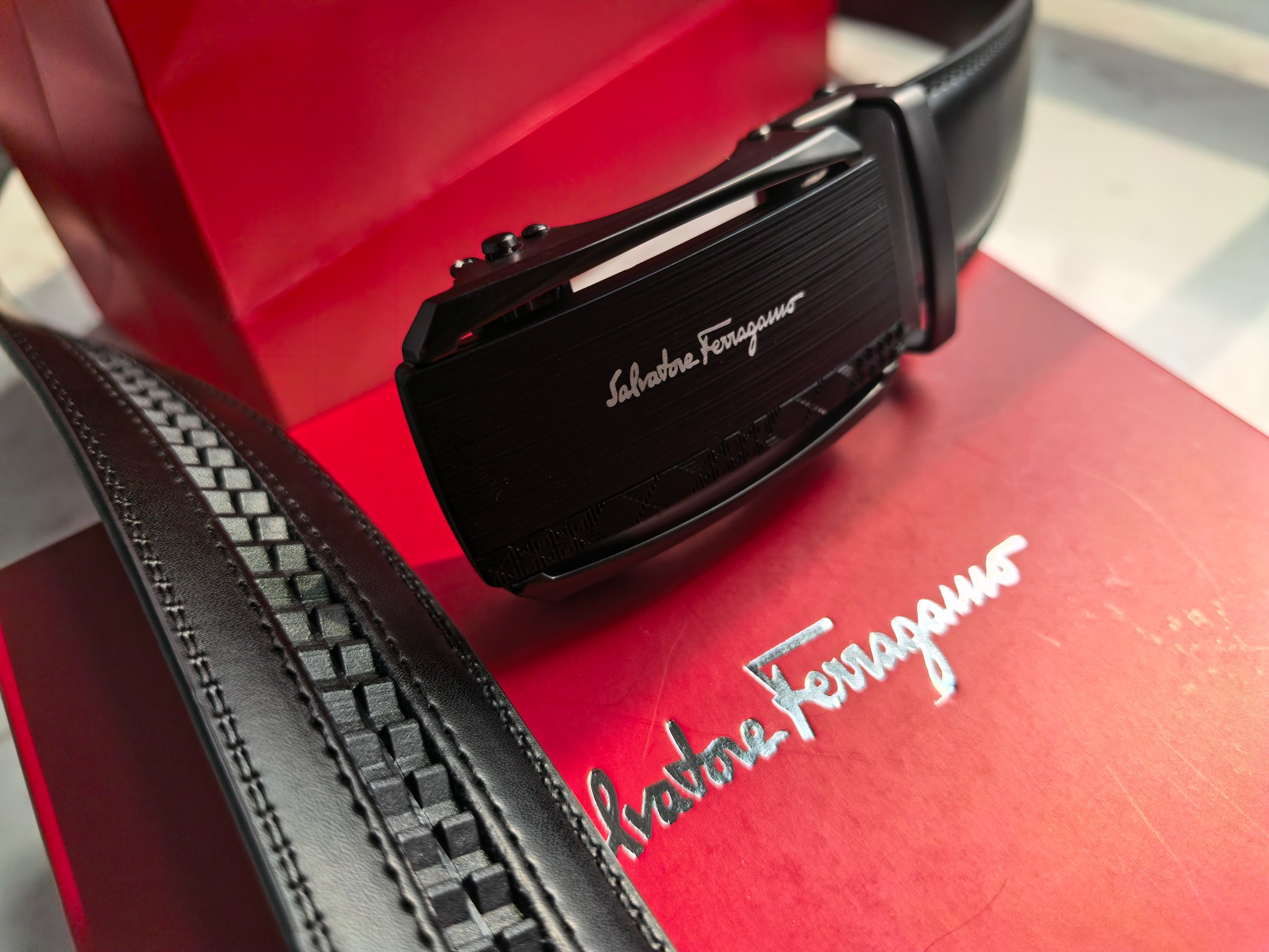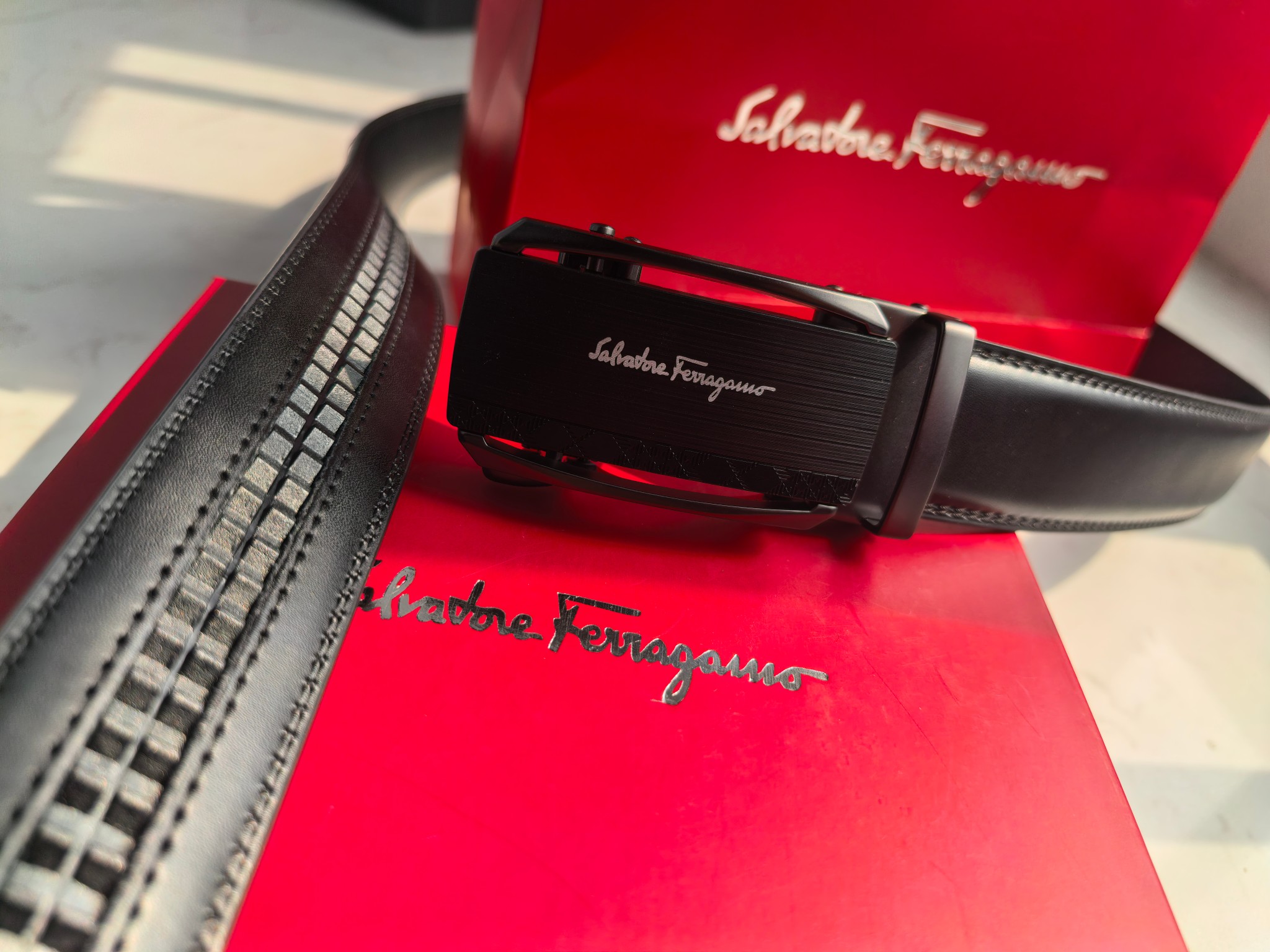 最新款 菲拉格慕Ferragamo磨砂镂空款扣头 真的超级好看 这款皮带一定要搞一条 今年专柜最新款 真的非常帅 超级百搭款 可商务 可休闲 皮带扣头全部是东莞代工厂出货 非常的有分量 克重足 皮带采用内外头层牛皮制成 非常的耐用 两年内绝不会有问题 放心使用 配全套专柜包装盒手提袋 无论送礼还是自用都非常的有档次 尺码 120cm x3 5cm 最大可用到220斤 长短可调节