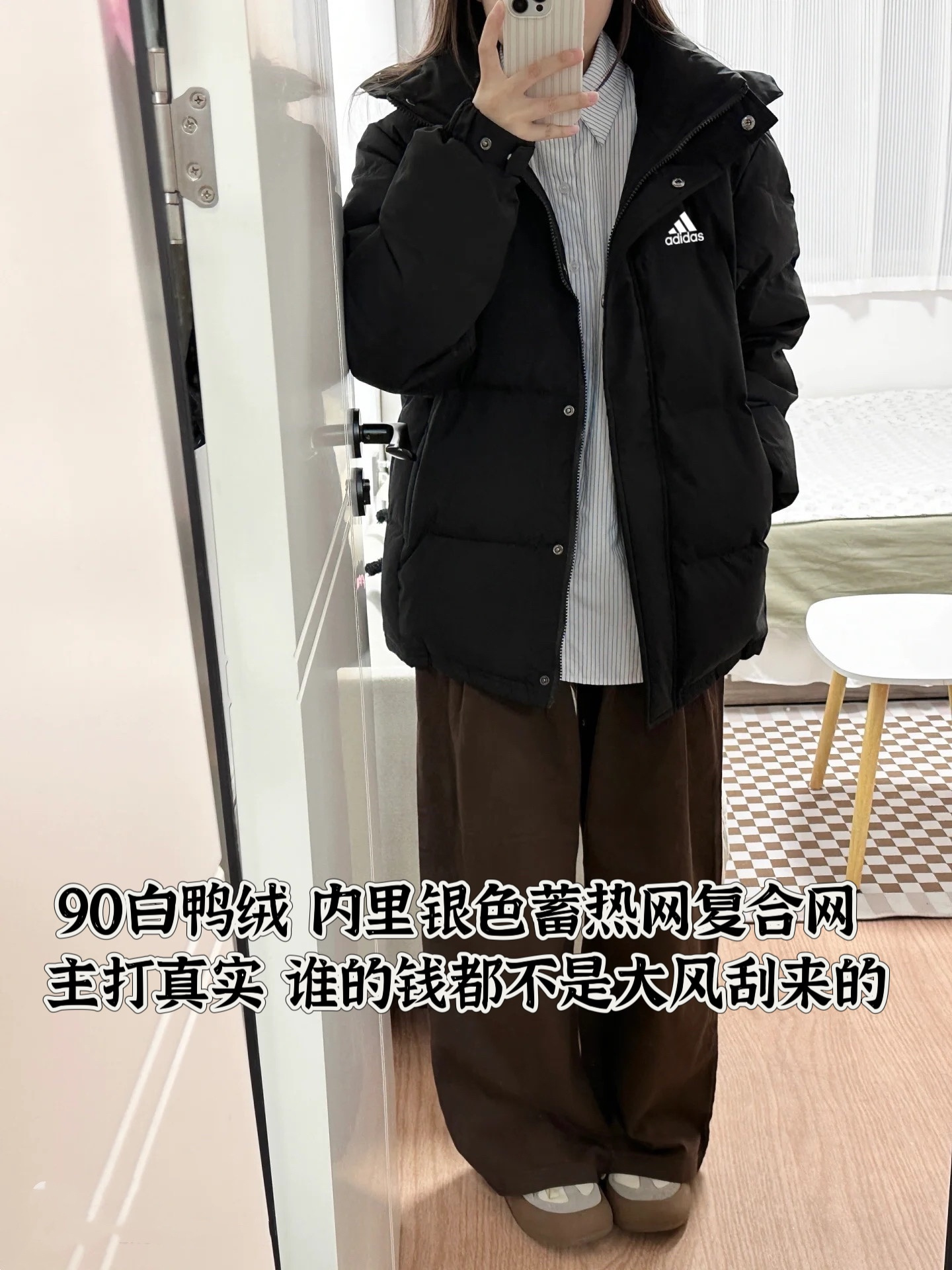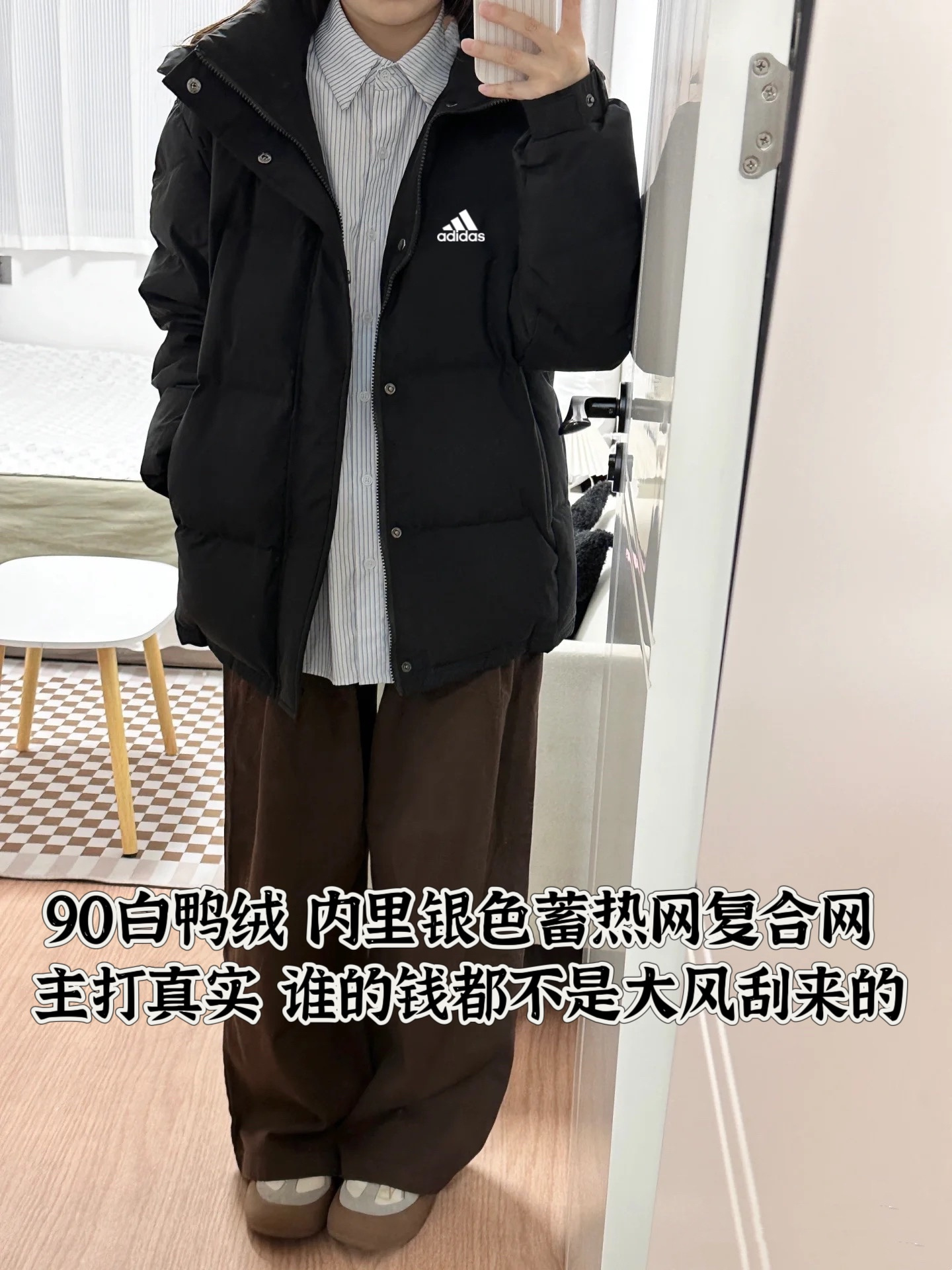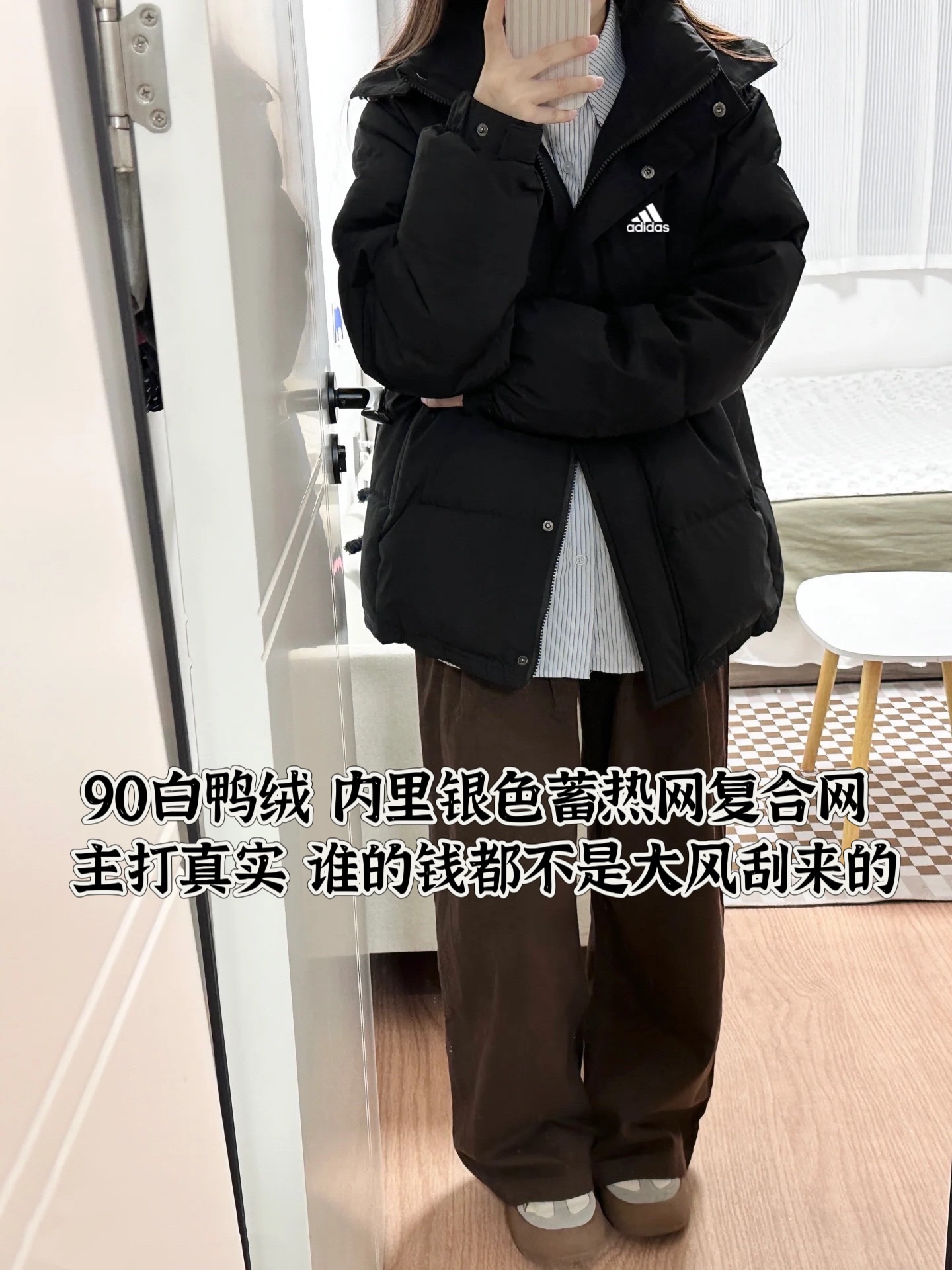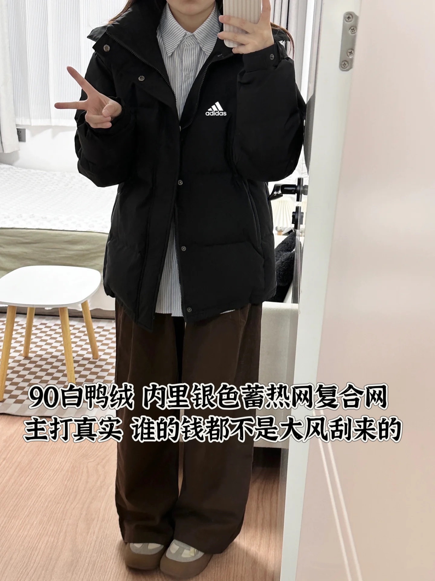 白鸭绒阿迪达斯Adidas连帽短款加厚防风情侣款连帽羽绒服