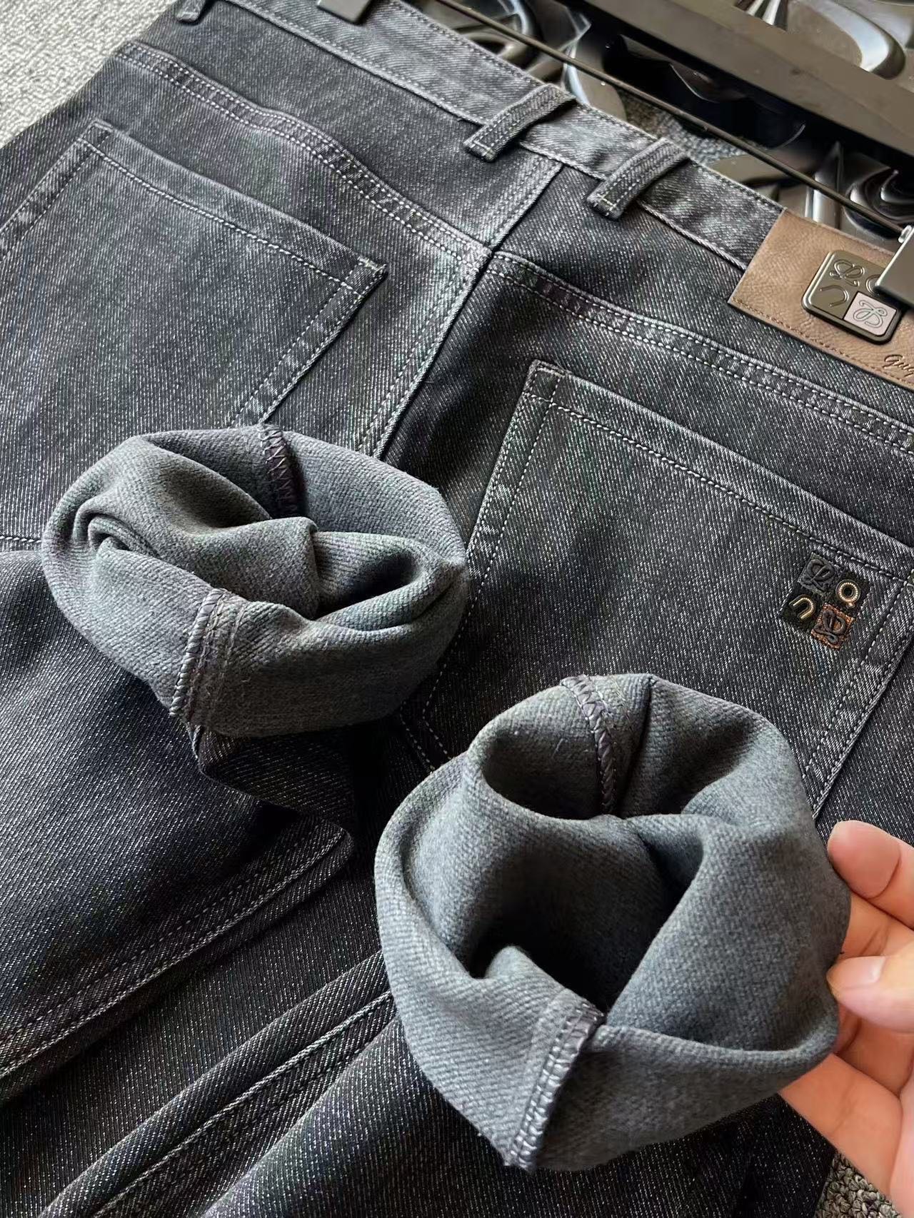 细节细节再细节 Loewe家商场新款水洗灰黑轻奢运动商务牛仔裤 前后偏浅磨砂处理 腰口浮雕Loewe ON金属棕色皮标 口袋处做了刺绣彩标细节工艺 内里精湛做工 业界天花板