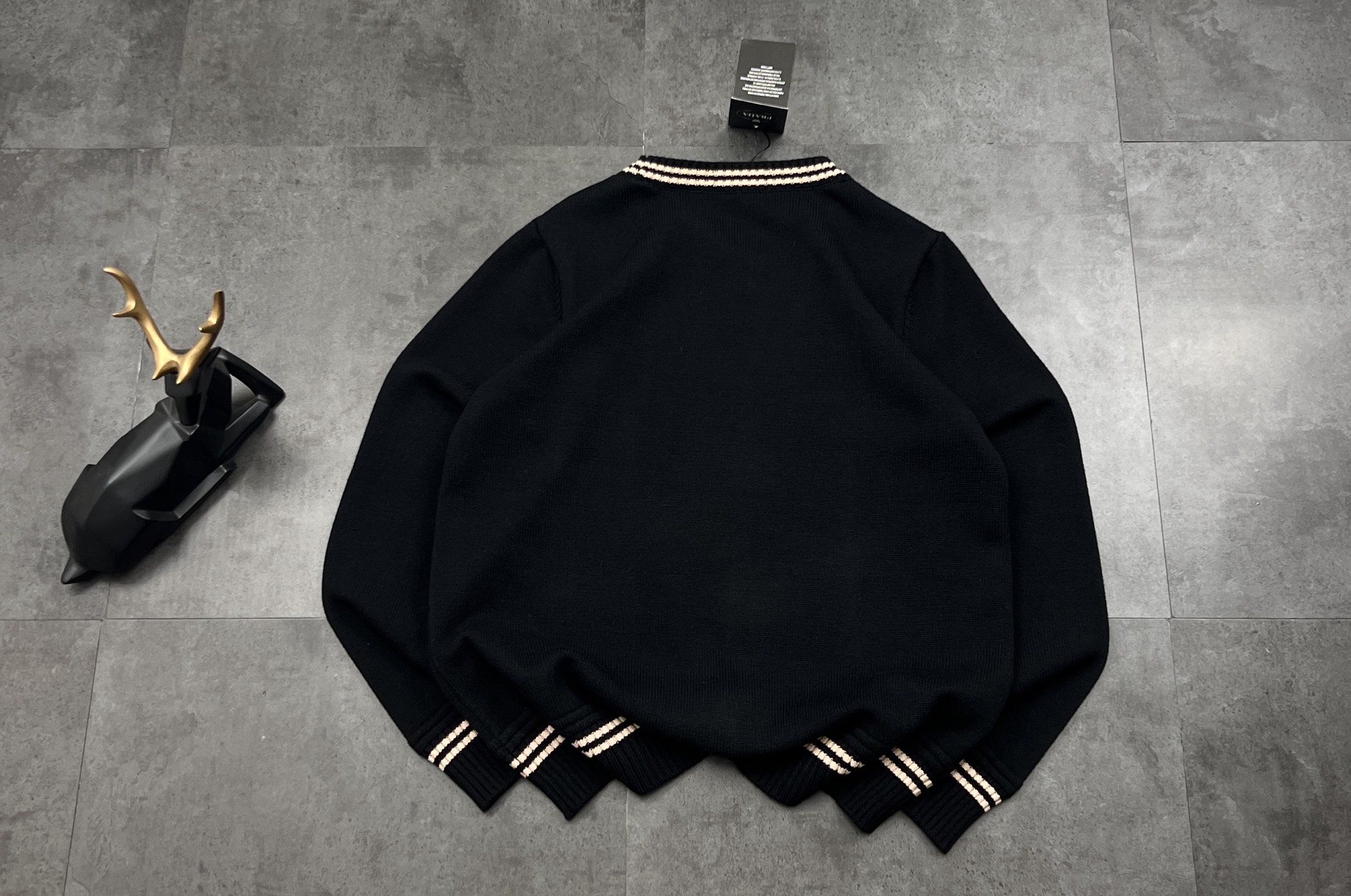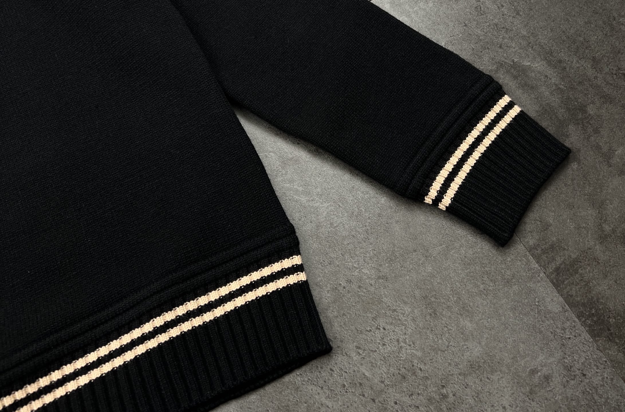 款式是经典的宽松圆领版型 略带落肩的设计弱化了肩线 对各种身形都超包容 慵懒又不失利落感 领口 袖口和下摆的咖色双条纹织带 和黑色衣身形成撞色层次感 简约中透着设计巧思 不管是单穿还是搭西装 风衣做内搭 都能瞬间提升整体造型的精致度