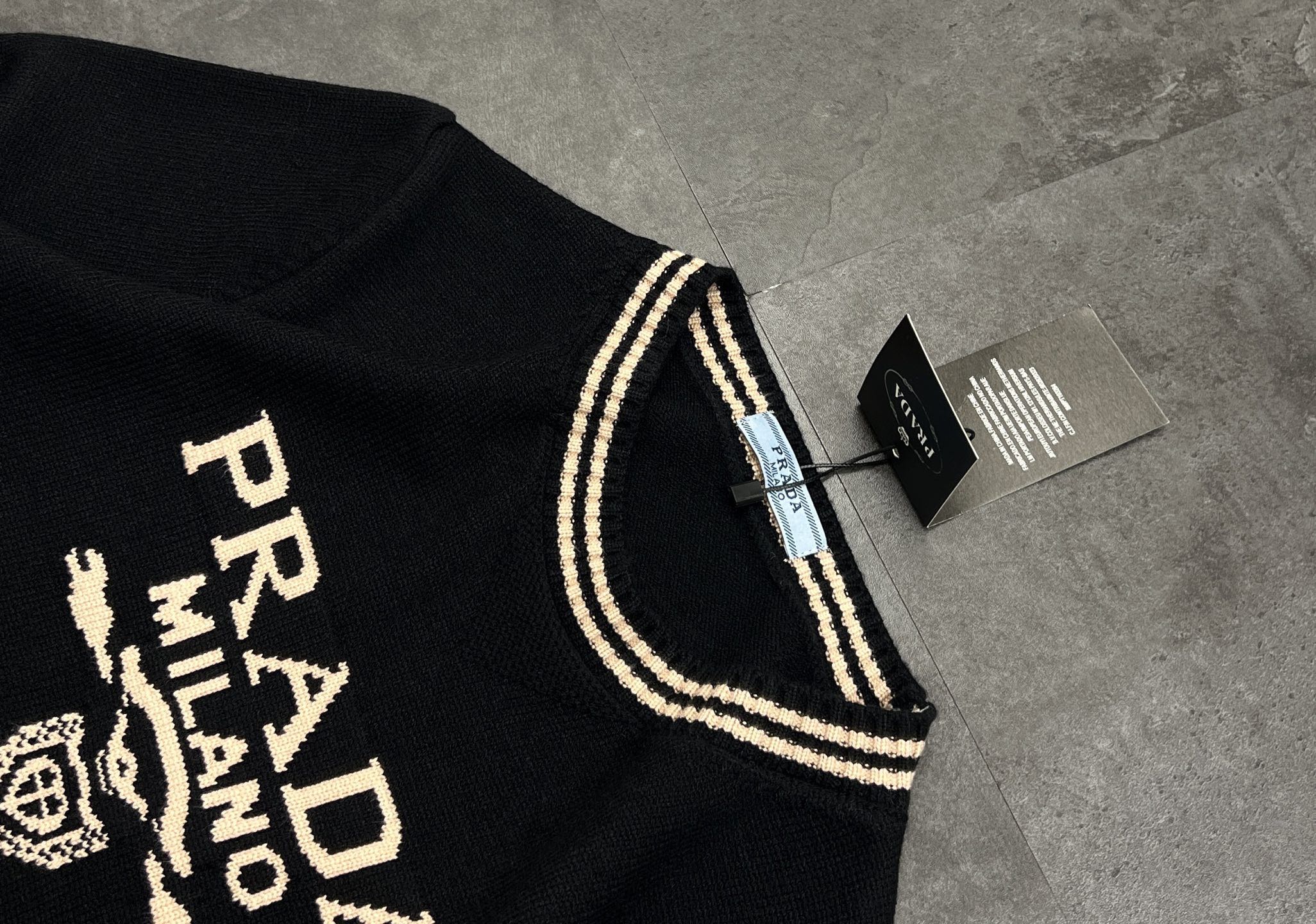 工艺上更是能看出Prada的匠心 正面的PRADA MILANO徽标 盾形徽章 用的是色织嵌花工艺 不是普通的印花 字母和徽章的纹理立体清晰 针脚细密到连徽章的纹路都分毫毕现 洗多少次都不会开裂脱落 衣身采用高密四平针针织工艺 平整度和弹性都在线 不易变形 领口和袖口的罗纹是双路车线锁边工艺 弹性持久还能牢牢贴合身形 细节处的做工完全挑不出毛病