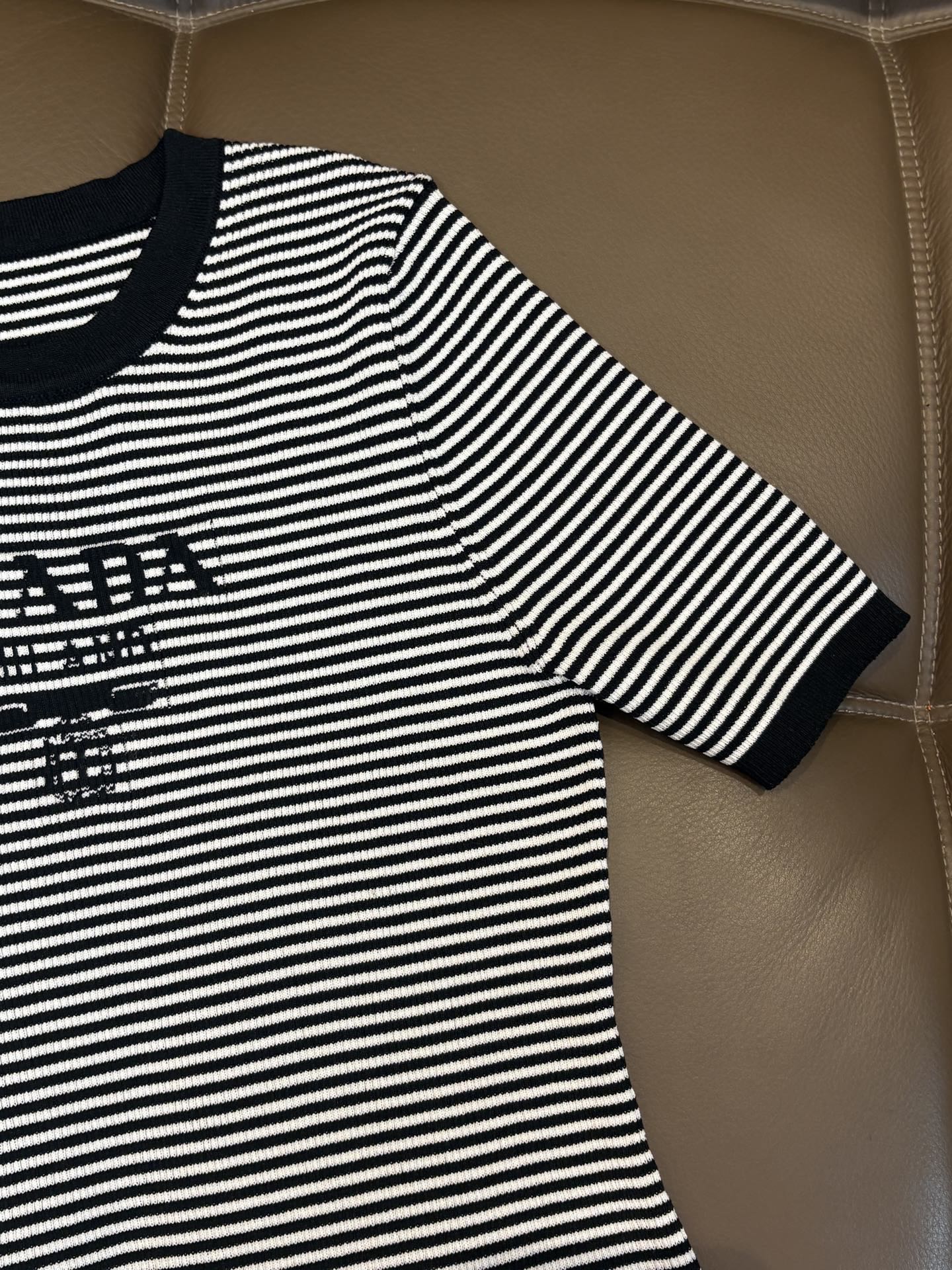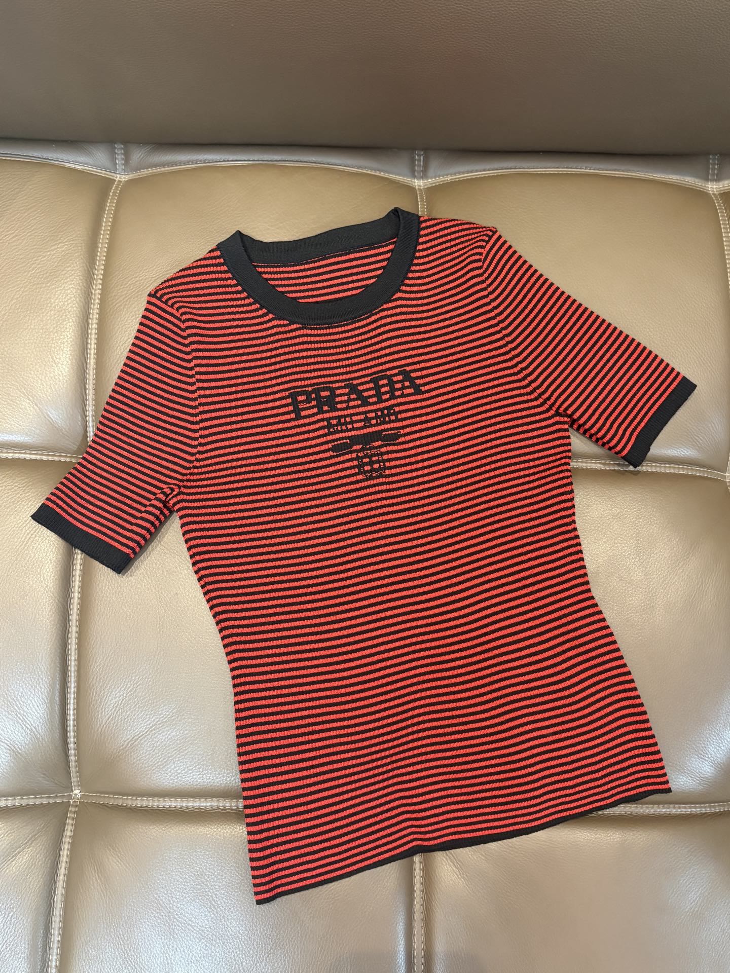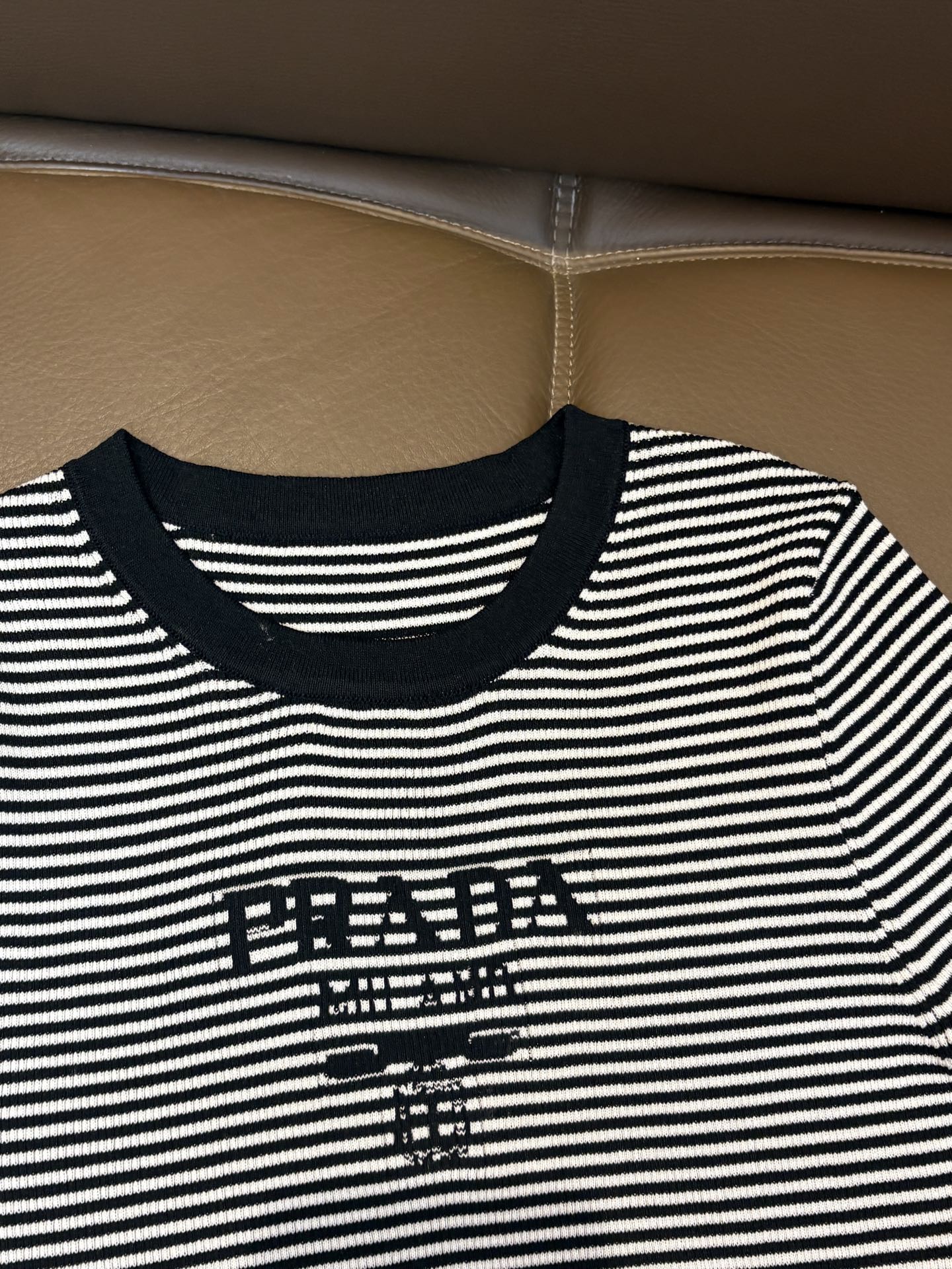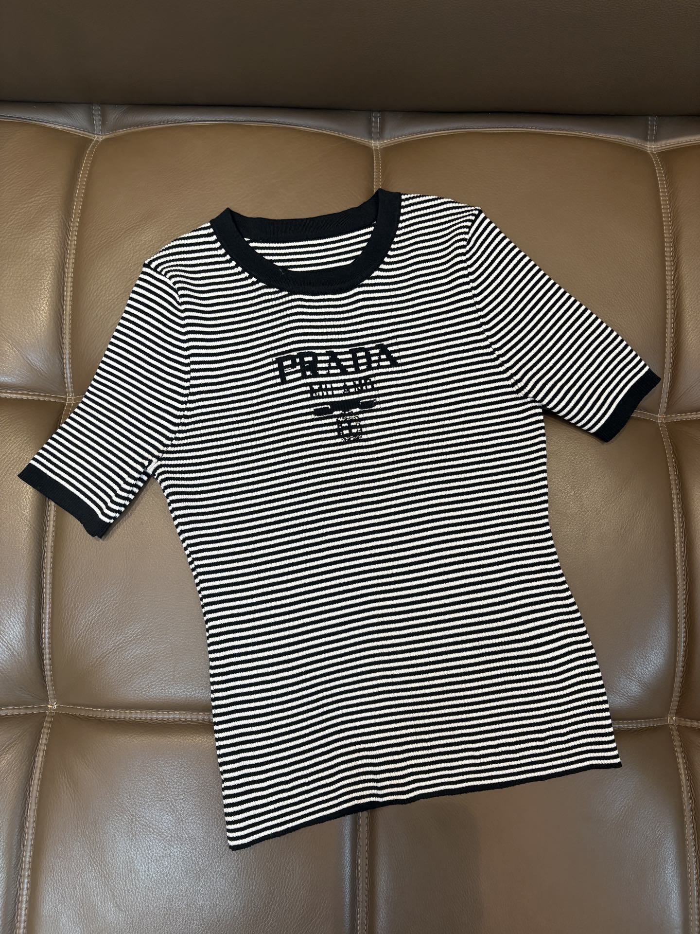 Prada普拉达字母logo提花条纹圆领针织短袖