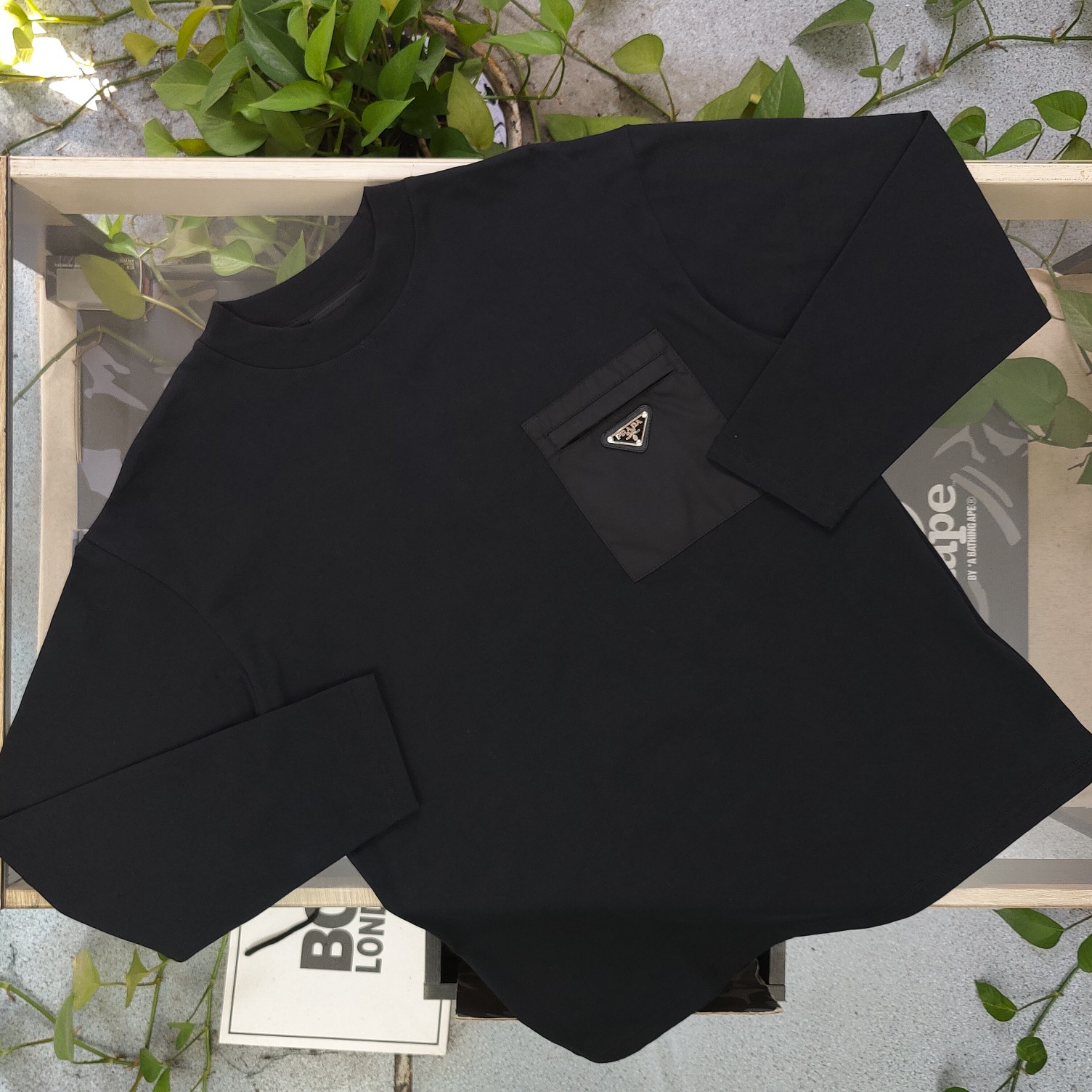 2025秋冬新款Prada普拉达拉链口袋三角徽标休闲情侣长袖T恤 小红书爆款 面料高版本高品质 网红明星同款 采用客供定制超柔纯棉面料 面料柔软舒适更垂顺 品牌字母Logo标志彰显品牌特征 简单款式更易搭配 时尚潮流 水洗麦 时尚休闲百搭款 三标齐全 非市场普通版本 随意对比 品质绝对保证 男女同款