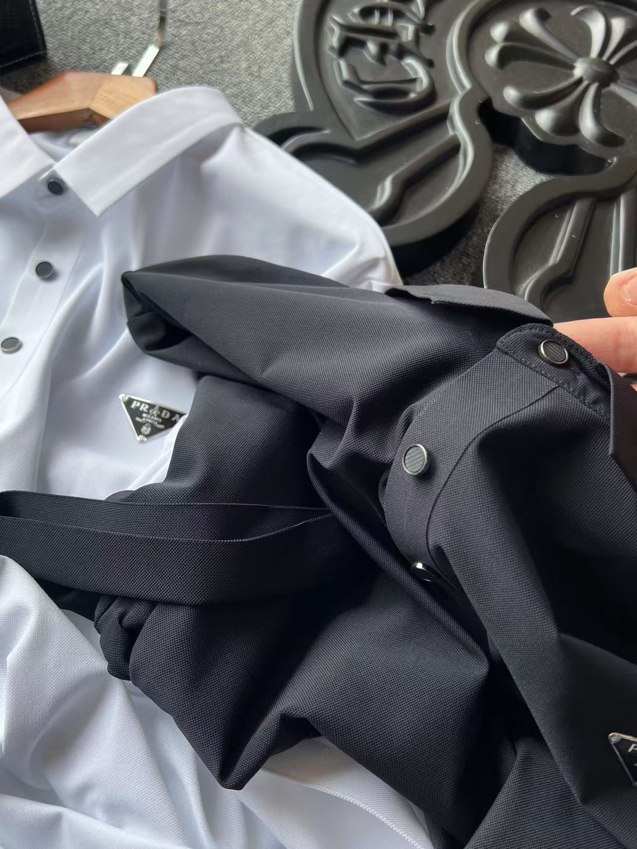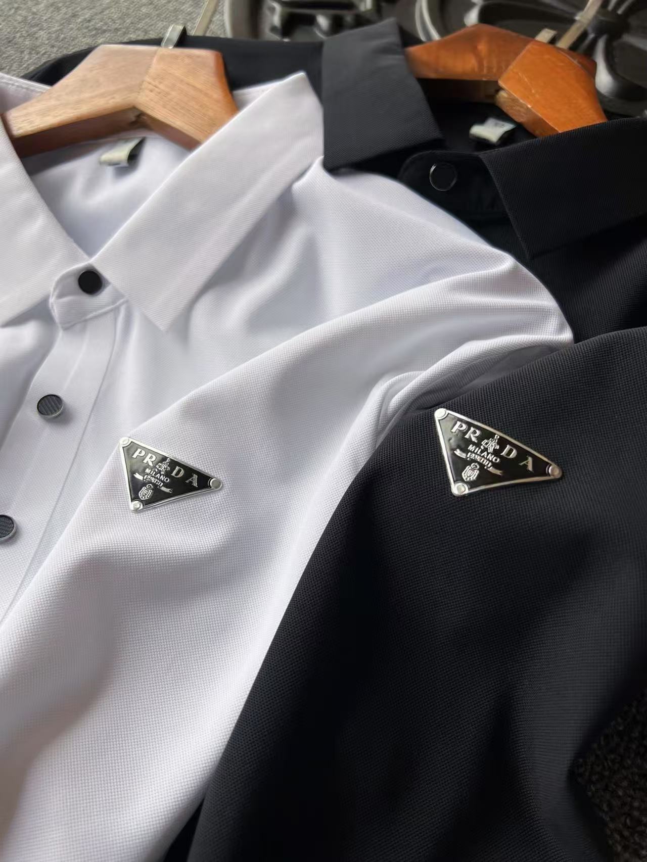 细节细节再细节 普拉达家专柜小仆人公文包系短袖无痕Polo衫 胸前进口TPU材质激光浮雕立体普拉达倒三角小仆人公文包logo 简约奢华 十分精细 从领口门襟到双袖下摆全部做了无缝压胶工艺 进口弹力胶条做到白色切割不变色的高精尖标准