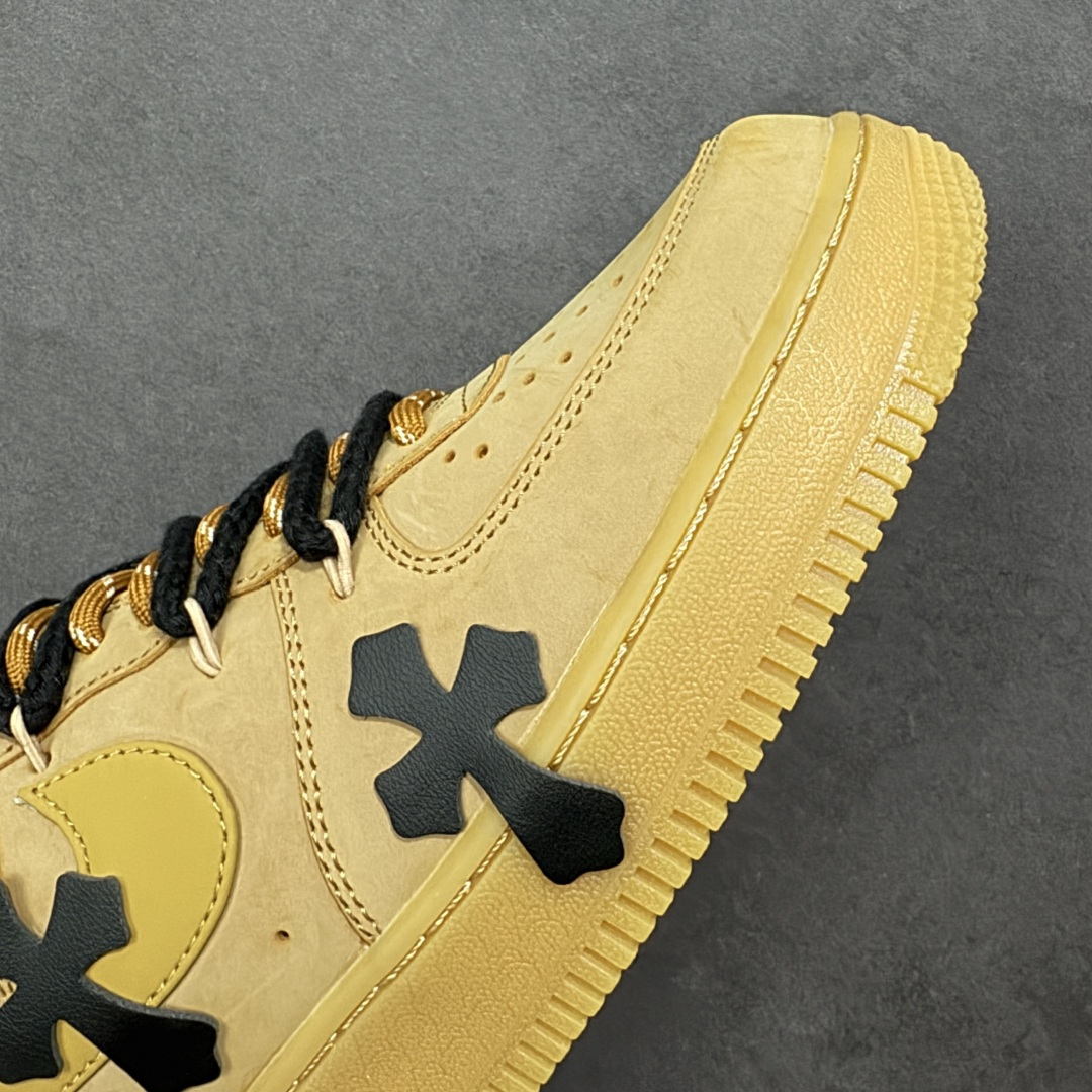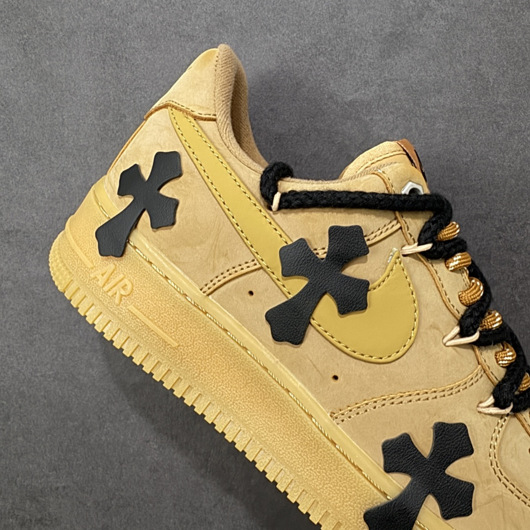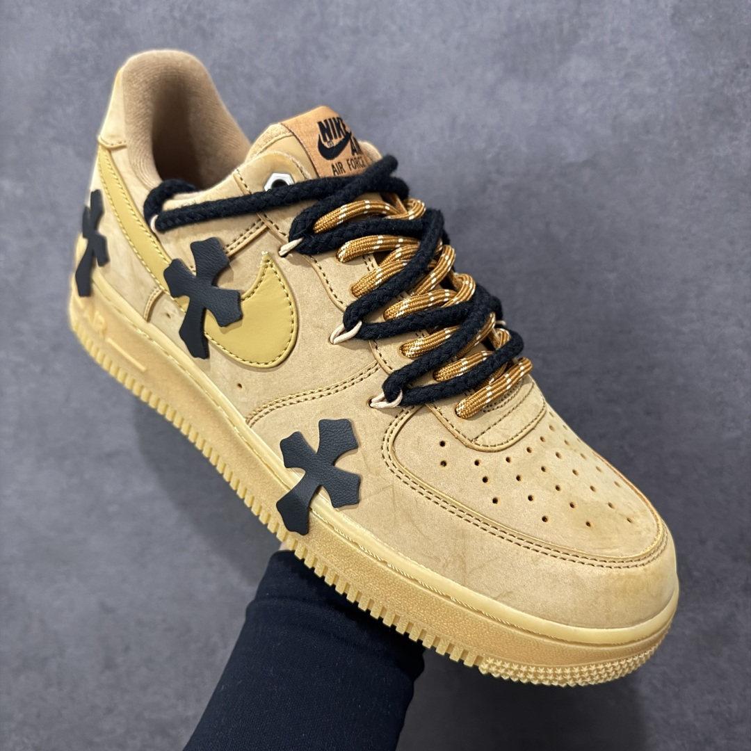 这款鞋是以Nike Air Force 1 空军一号 小麦色经典款为基底的定制款 是街头潮流与经典鞋型结合的设计款 鞋身点缀黑色立体十字装饰 打破经典款的单调感 成为视觉焦点 搭配黑棕拼色的粗织鞋带 进一步强化街头潮流属性 让经典鞋型更具个性