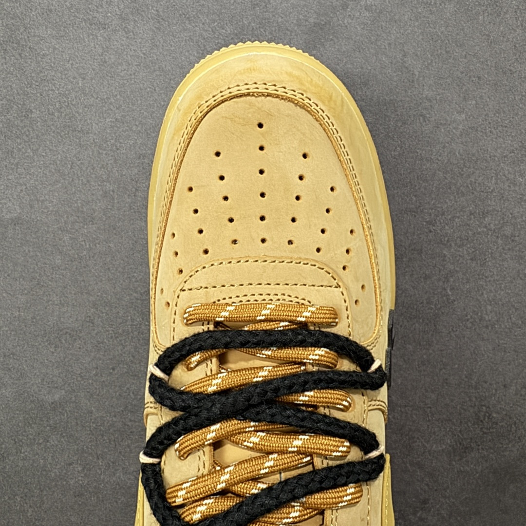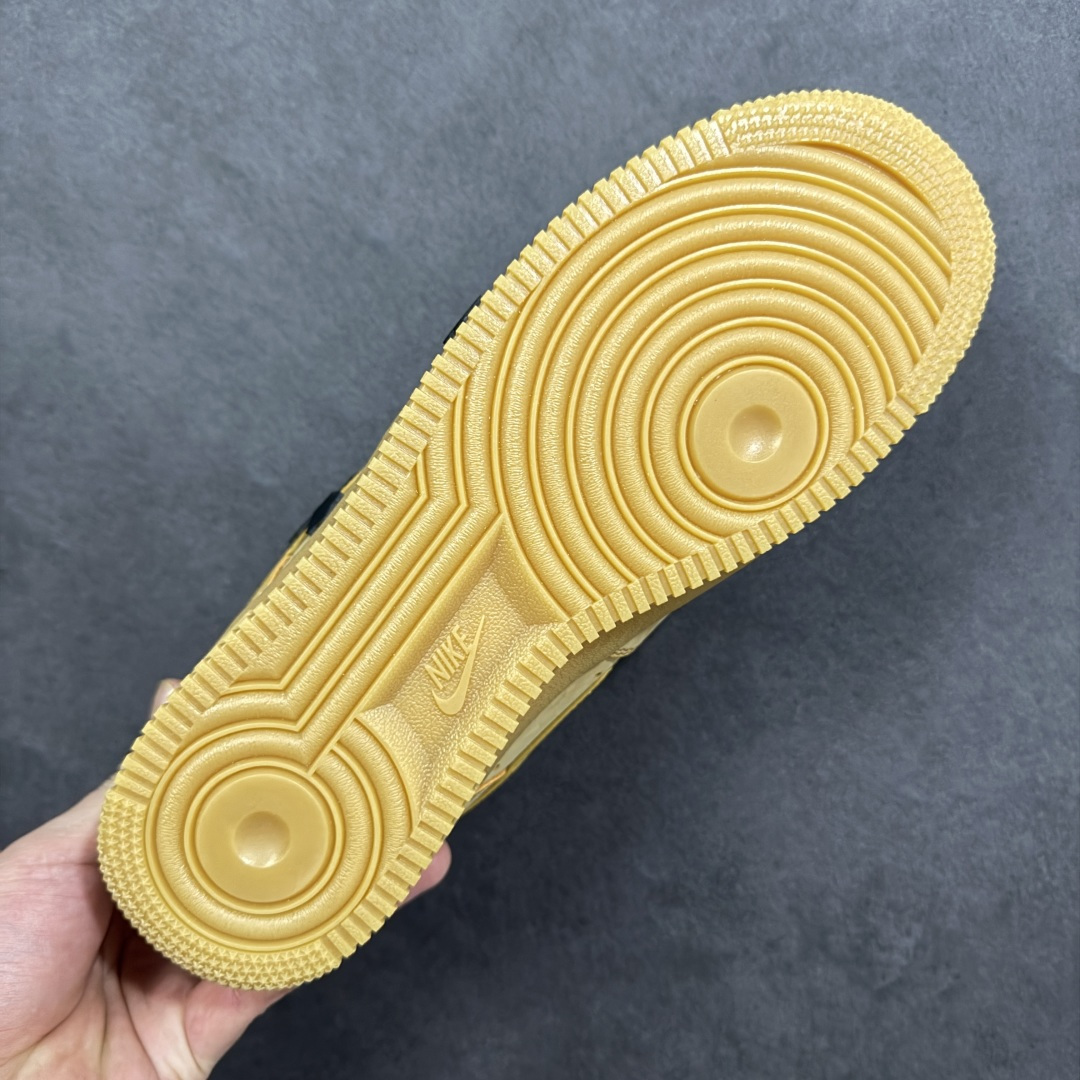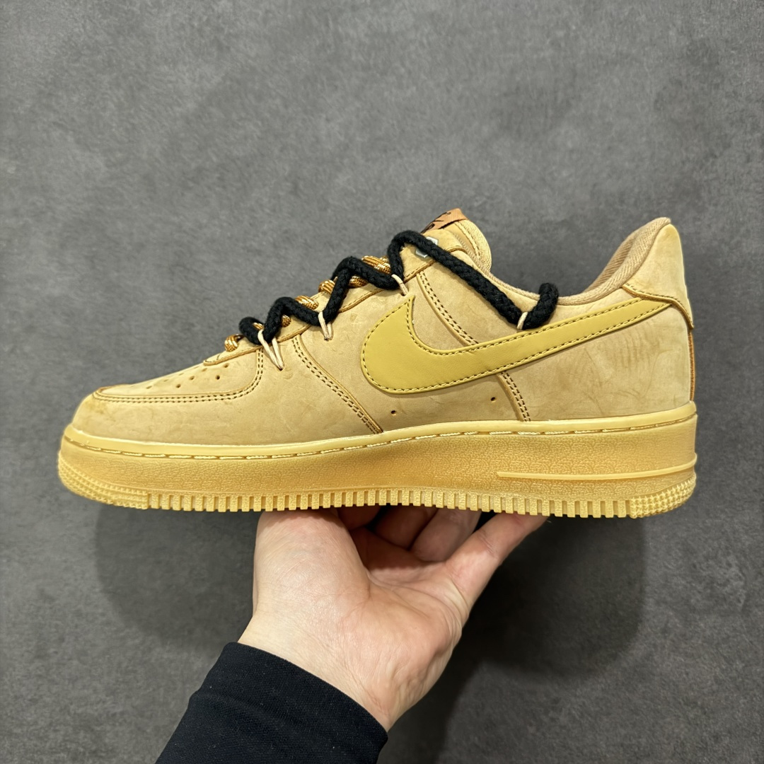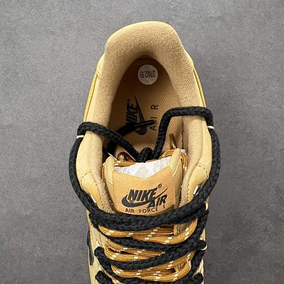 这款鞋是以Nike Air Force 1 空军一号 小麦色经典款为基底的定制款 是街头潮流与经典鞋型结合的设计款 鞋身点缀黑色立体十字装饰 打破经典款的单调感 成为视觉焦点 搭配黑棕拼色的粗织鞋带 进一步强化街头潮流属性 让经典鞋型更具个性
