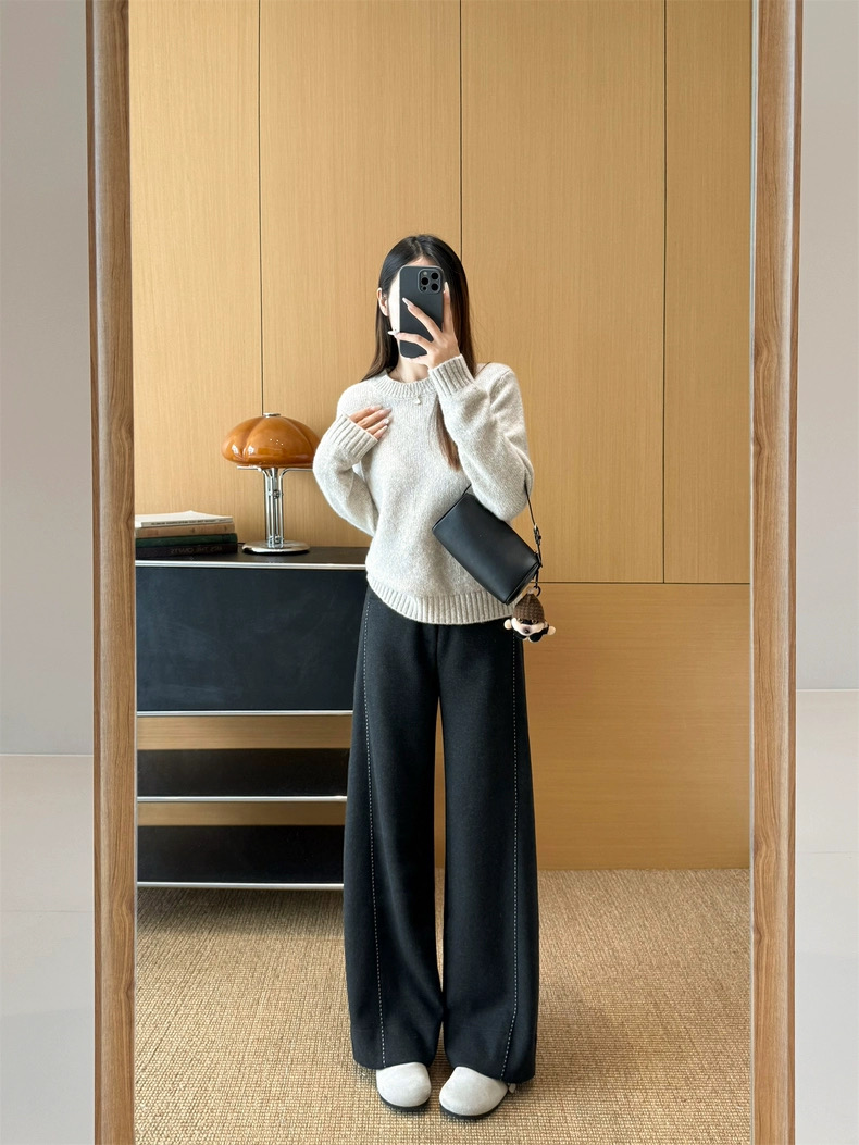 神级修腿 手工明线工艺 冬季羊毛醋酸明线休闲通勤毛呢直筒镰刀阔腿裤