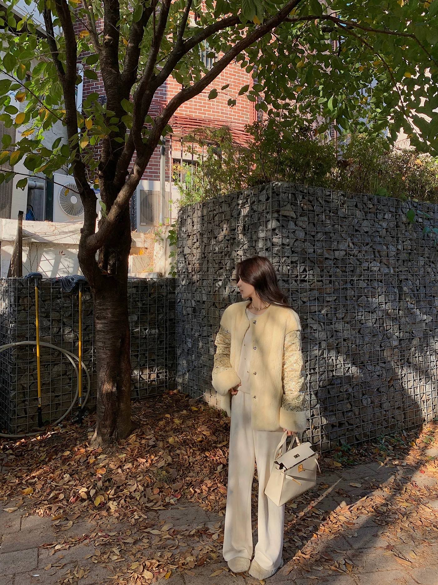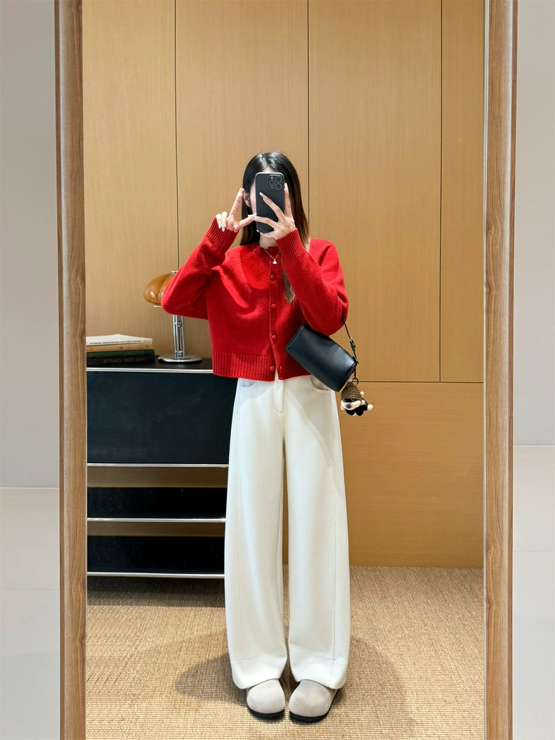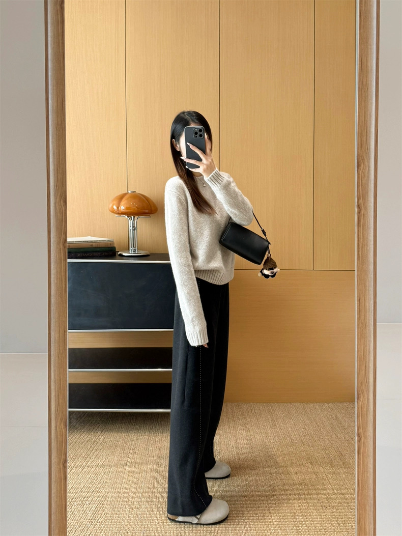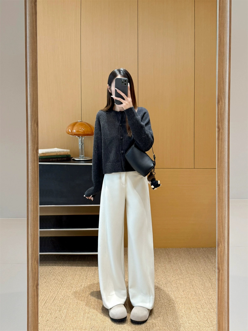 神级修腿毛呢镰刀阔腿裤 版型没话说 要的就是你轻松瘦 不费力得收获大长直腿 见到实物后你就知道这条裤子有多神了 定制醋酸 绵羊毛毛呢面料 经过特殊工艺处理 扎实有分量 手感相当细腻 胜似羊绒 温暖的犹如裹在毛毯里一样 上身没有任何束缚 不沾身 有筋骨 轻松慵懒的获得这一份优雅松弛感 简约即能塑型 步履间篙级随性 帅气时髦 无论与西装还是宽松休闲的单品搭配都OK