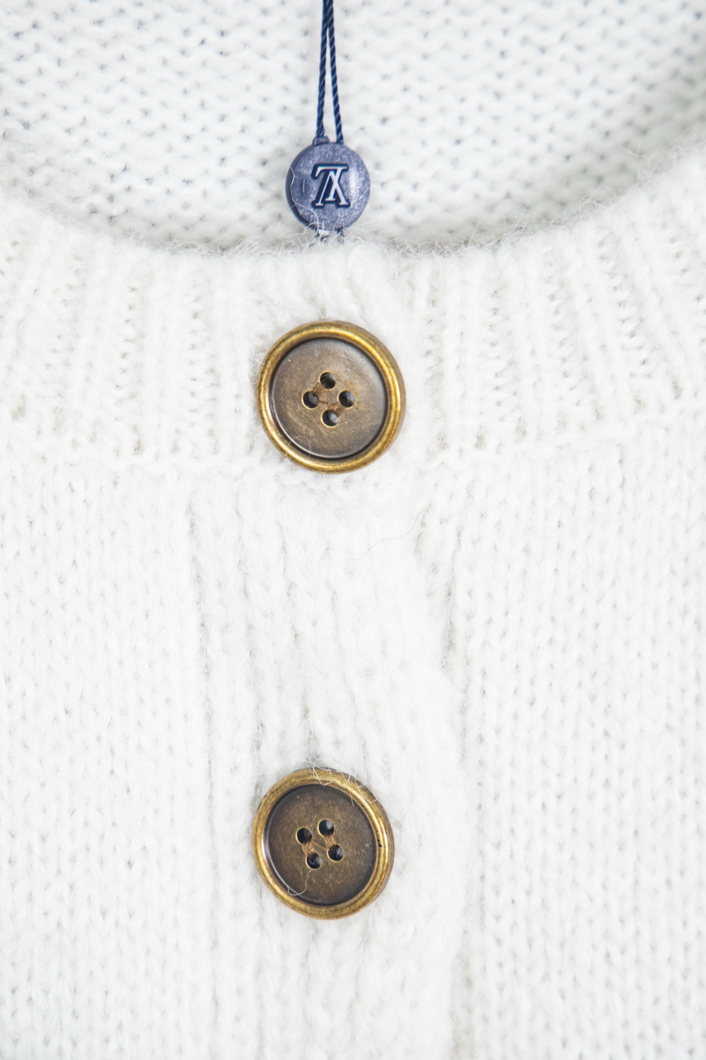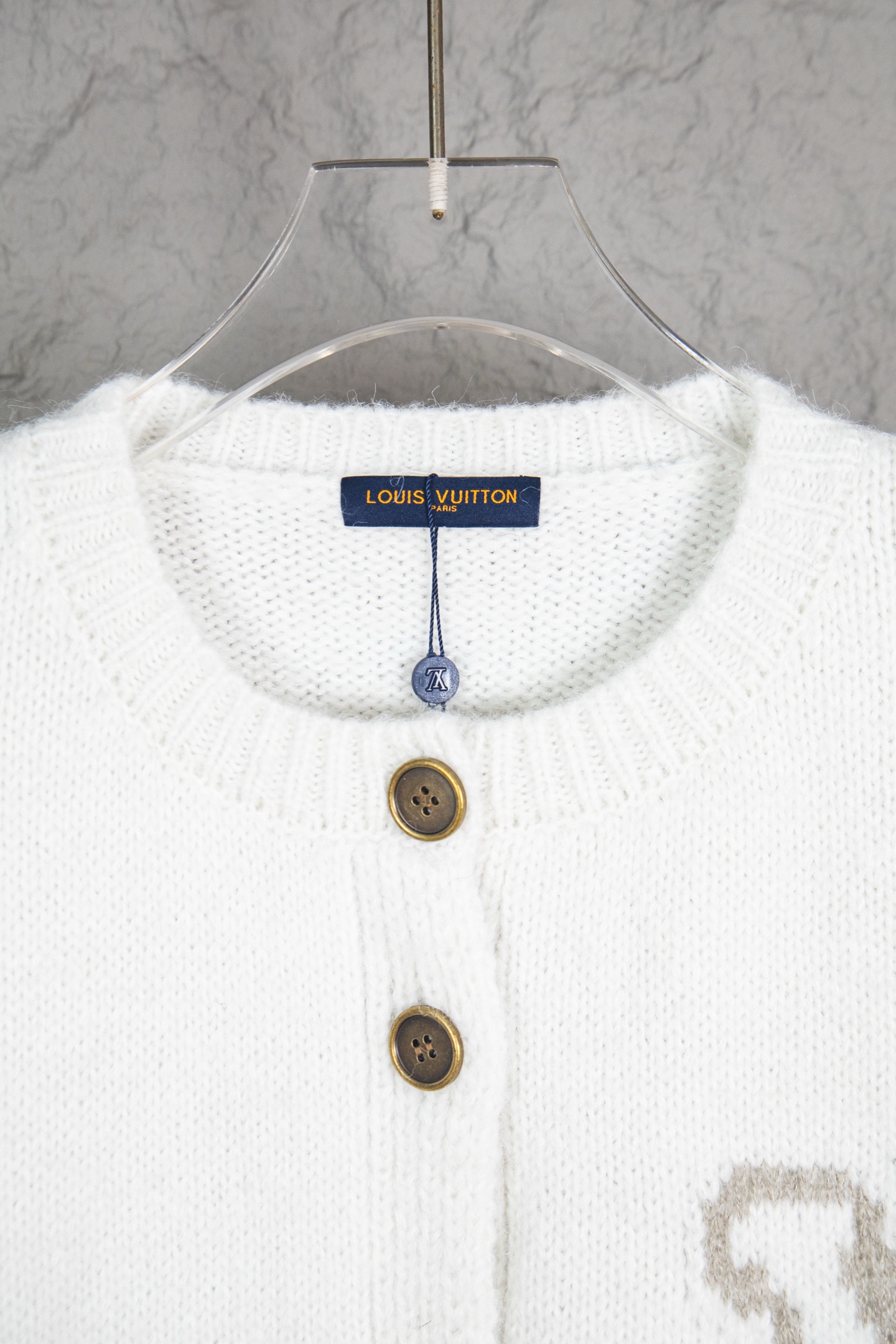 设计细节 圆领 单排棕色纽扣开合 衣身的 LV 标志性提花图案 下摆两侧做了竖纹装饰的口袋 袖口和领口都是罗纹收边 增加了贴合度