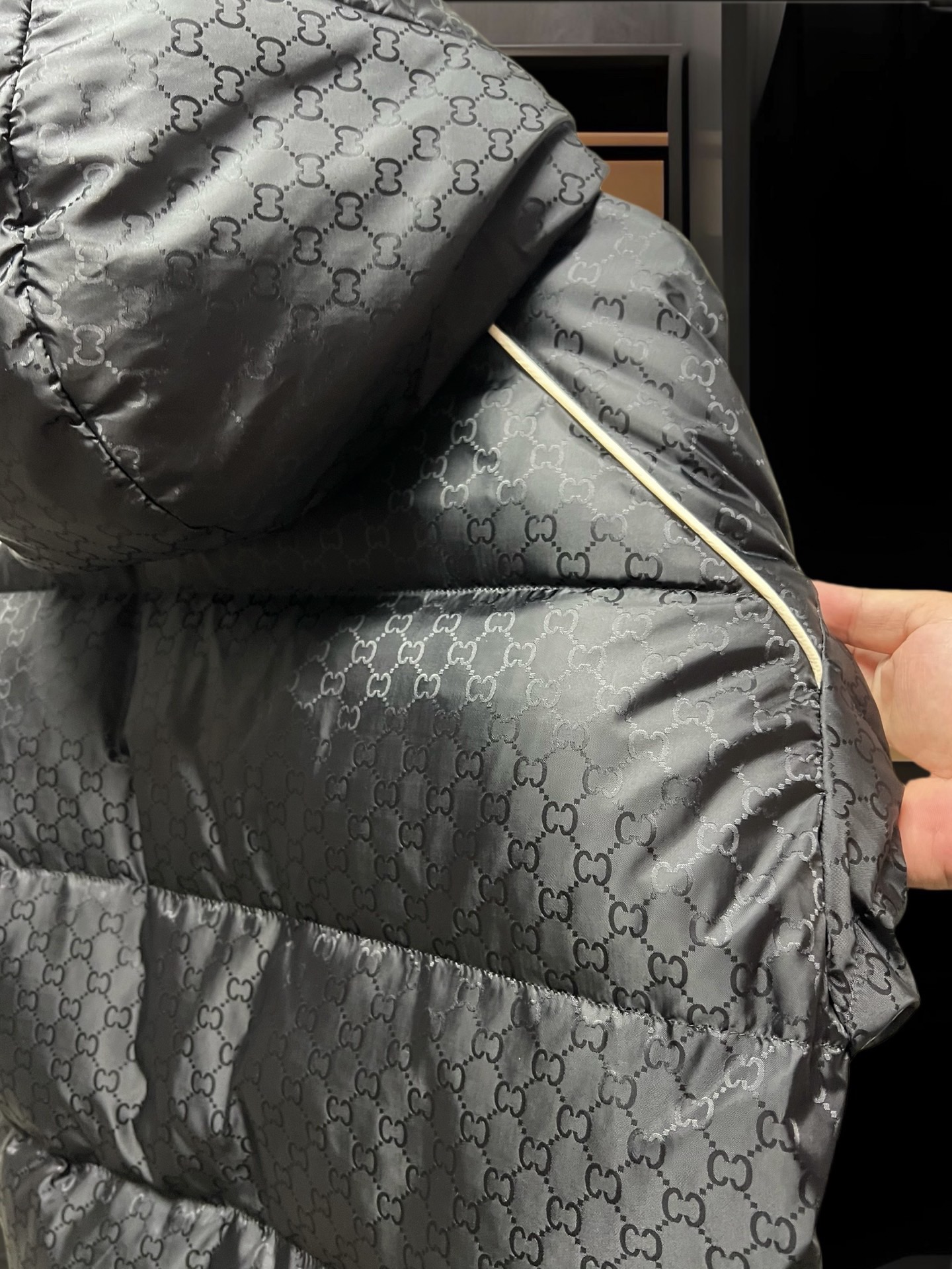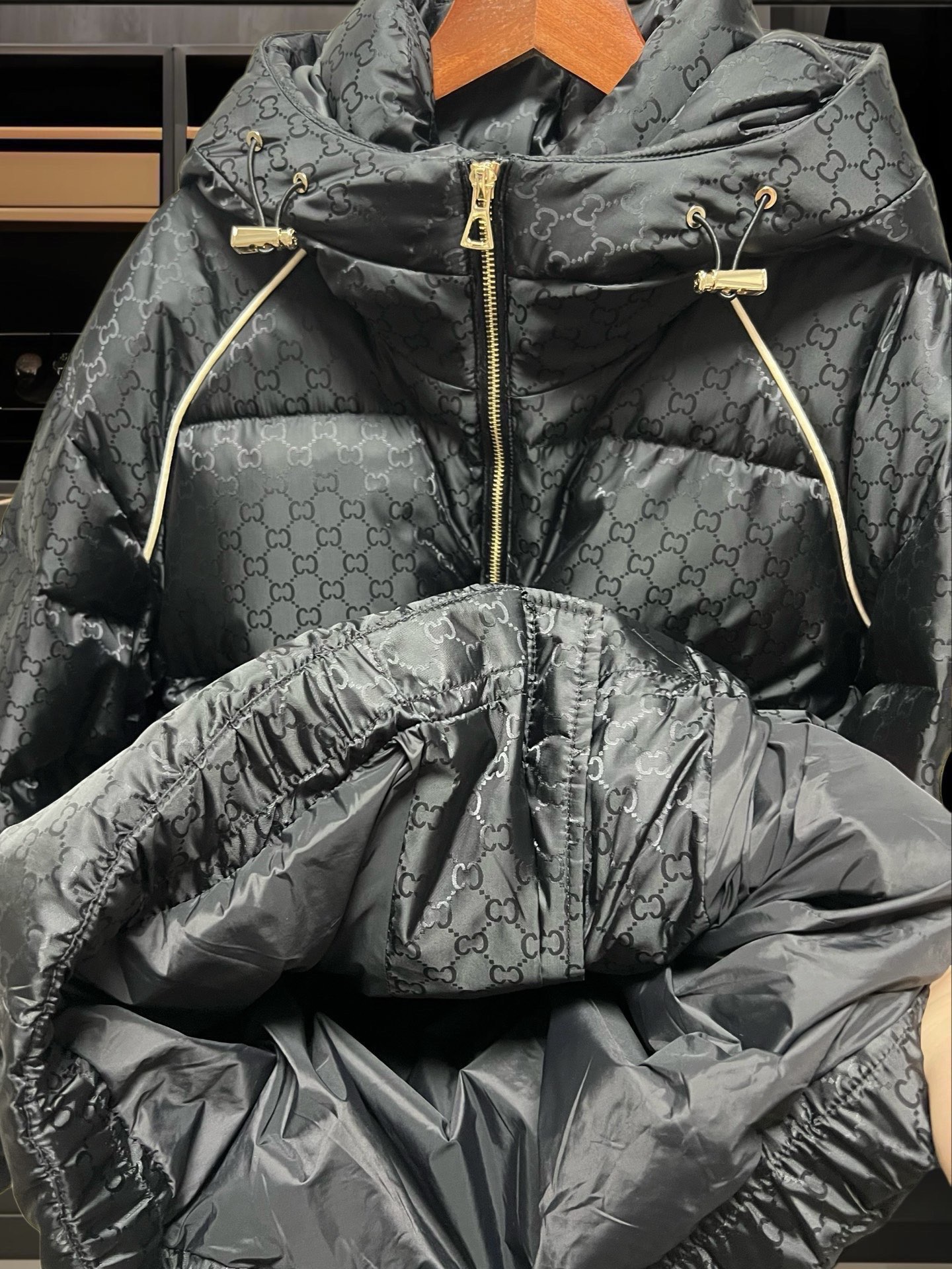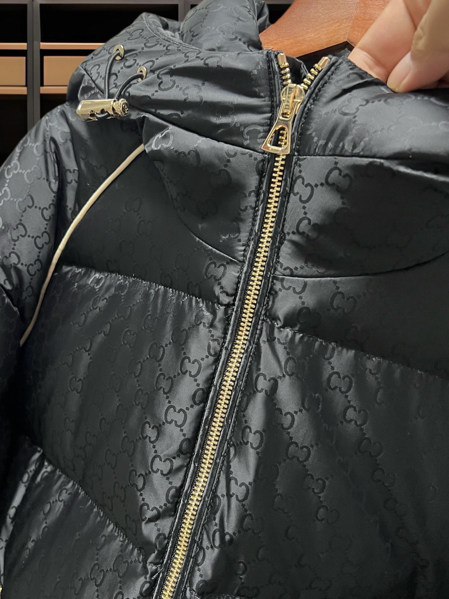 细节细节再细节 Gucci家商场新品重工连帽白鸭绒羽绒服 整件面料暗纹烧花CC标识 前后胸肩都做了米色缝线 精致彰显活力 YKK代工高端古铜五金件 袖臂缝制1978GRME限定织唛 底摆做了内嵌式防风松紧 高效锁温