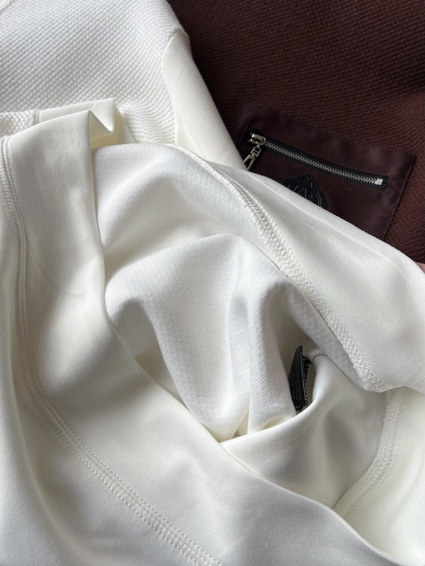 普拉达家高端针织拼接莫代尔空气层组合面料 毛纱纺织面内里复合棉布起到防风效果 莫代尔锦棉高端空气层 摸起来手感特别柔软细腻 同时具有极强的垂感 上身有型