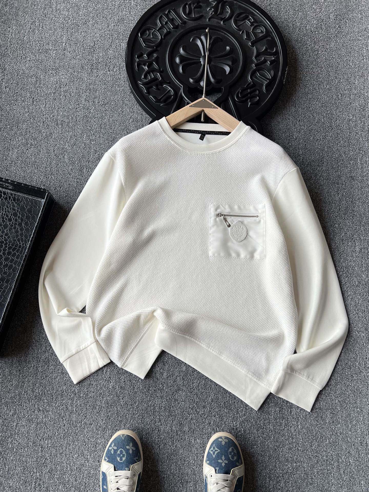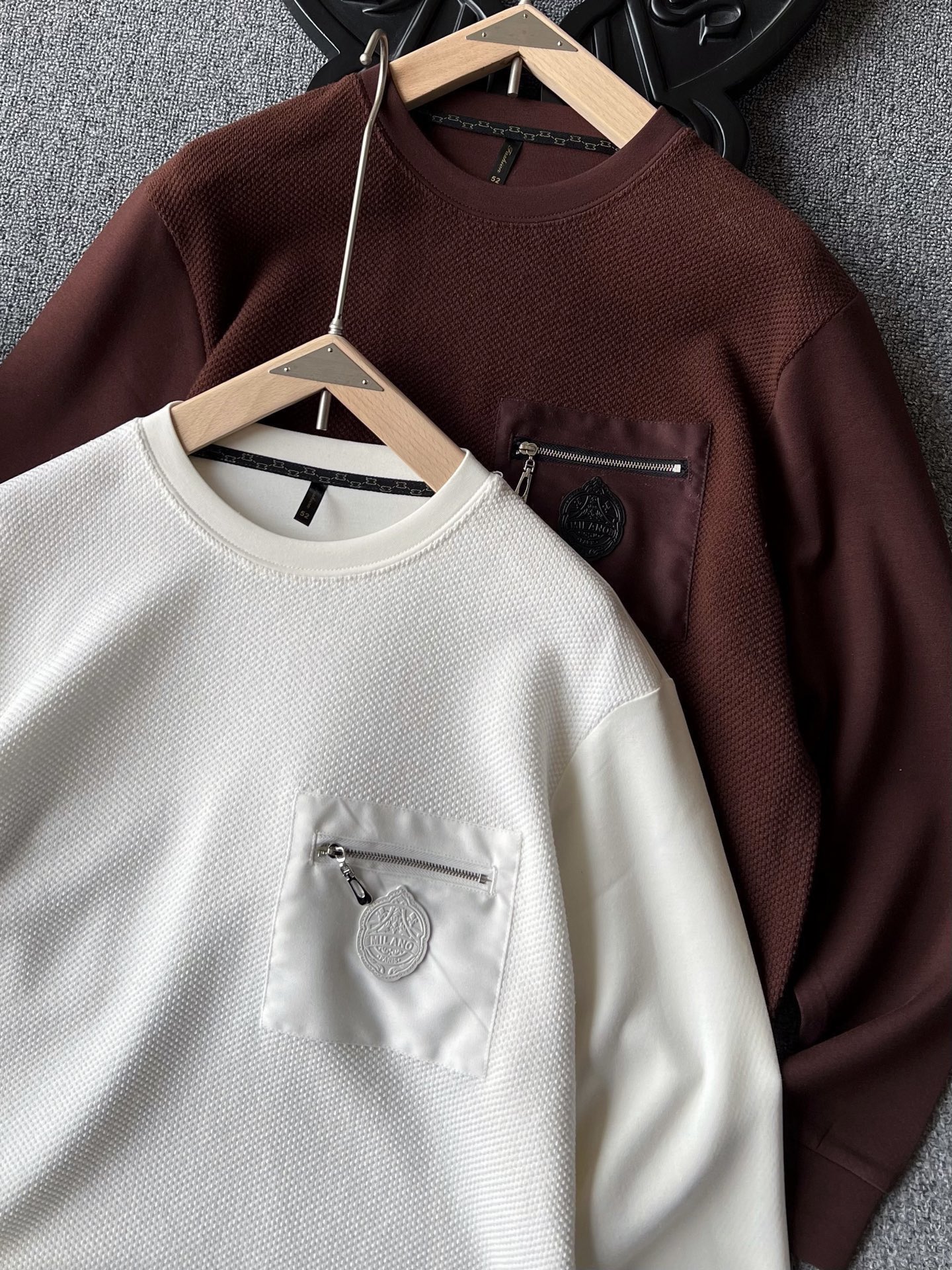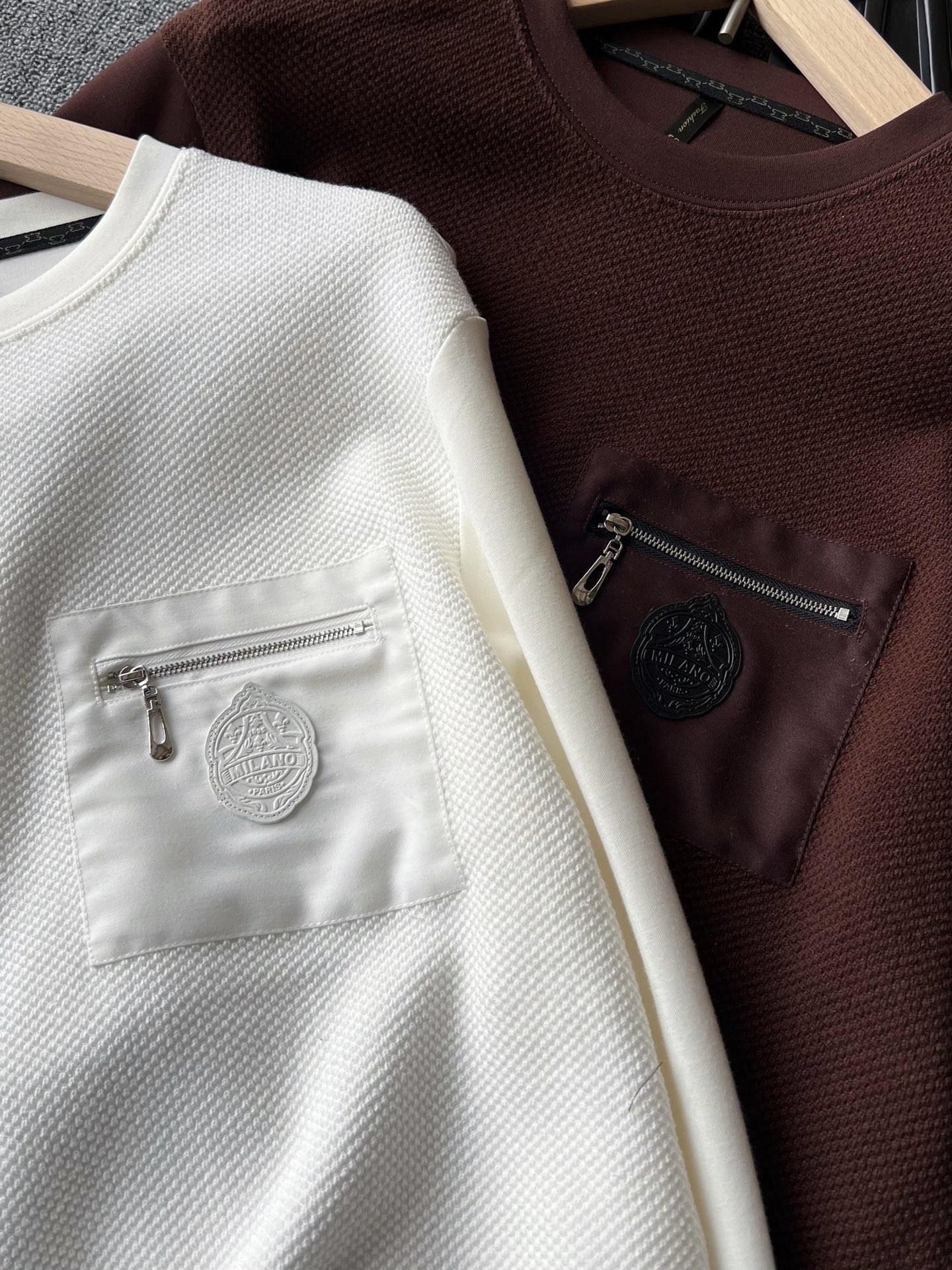 细节细节再细节 Prada家专柜新品重工拉链口袋卫衣 这款生产十分复杂 前片毛纱纺织工艺后又做了复层内里 双袖以及后背大身全部做了莫代尔空气层组合拼接 胸前梭织拉链口袋缝制MILANO意大利米兰限定标识 所有拼接处都加固压线以及精致领压条细节