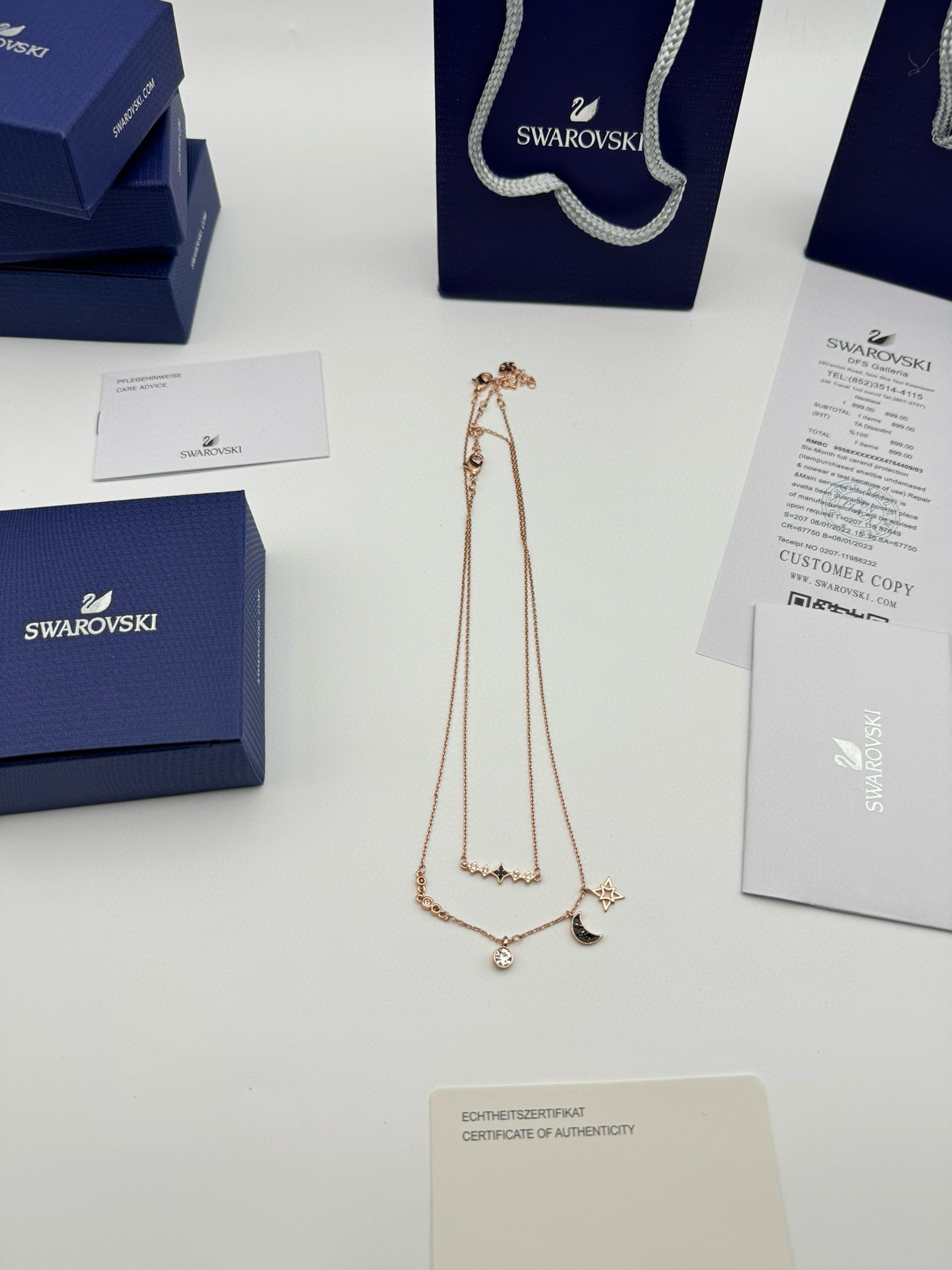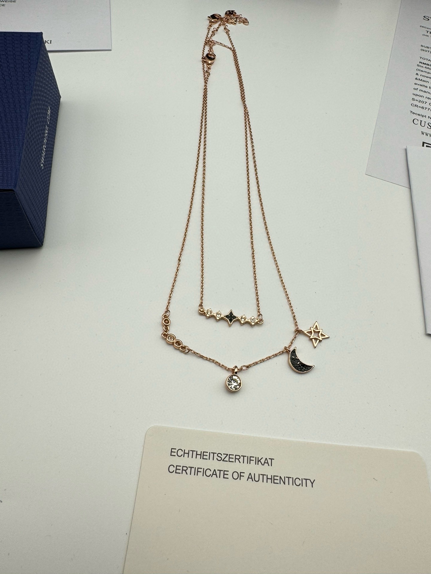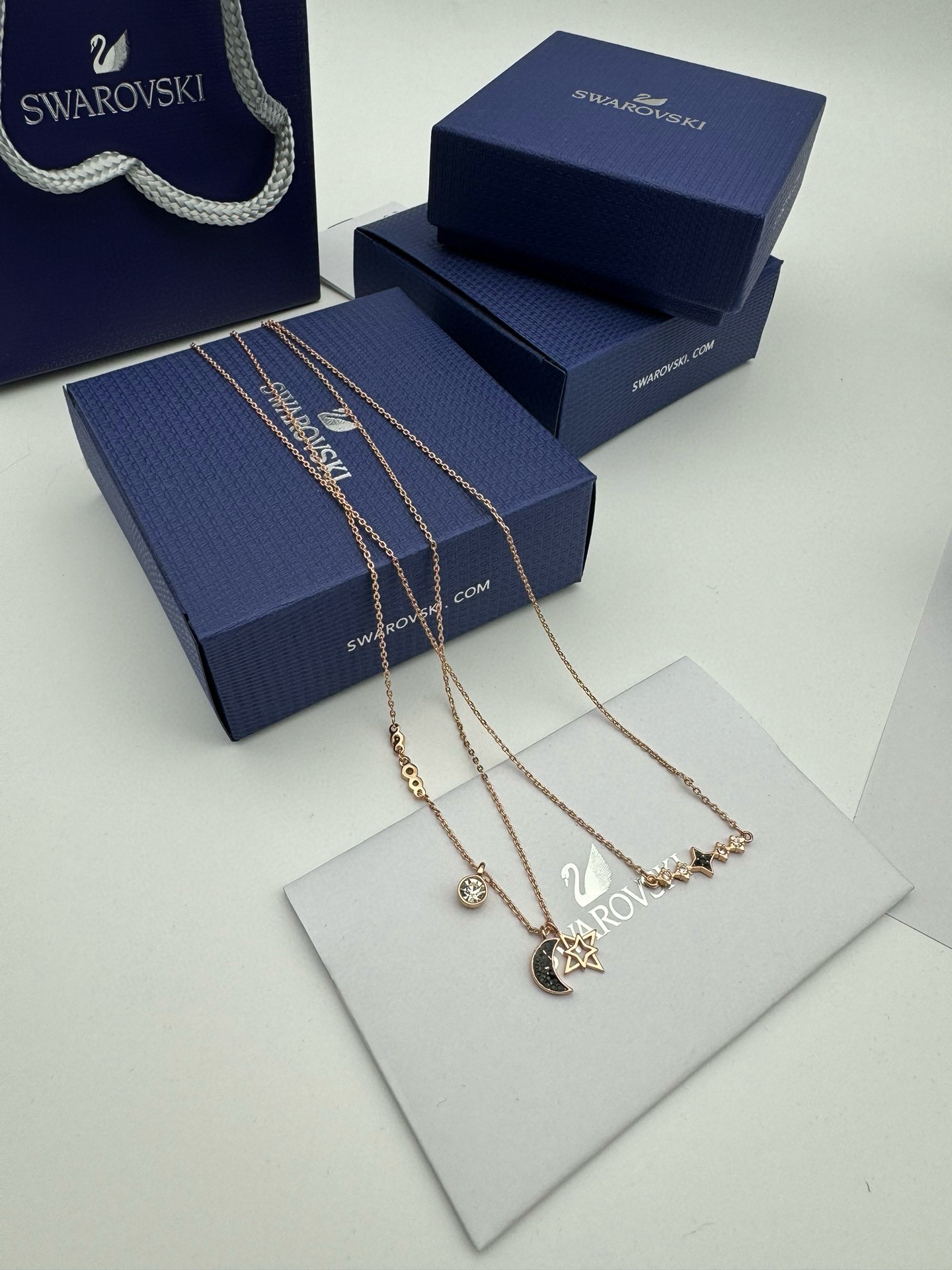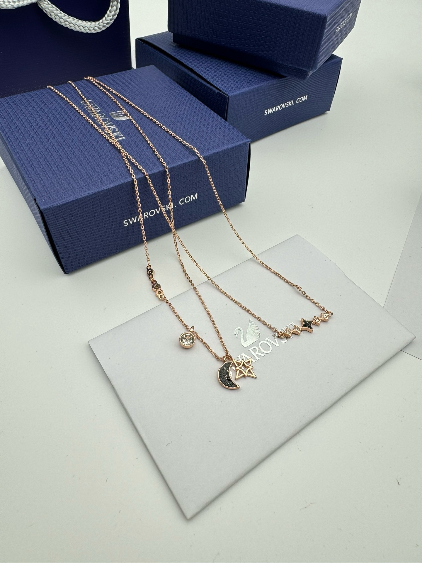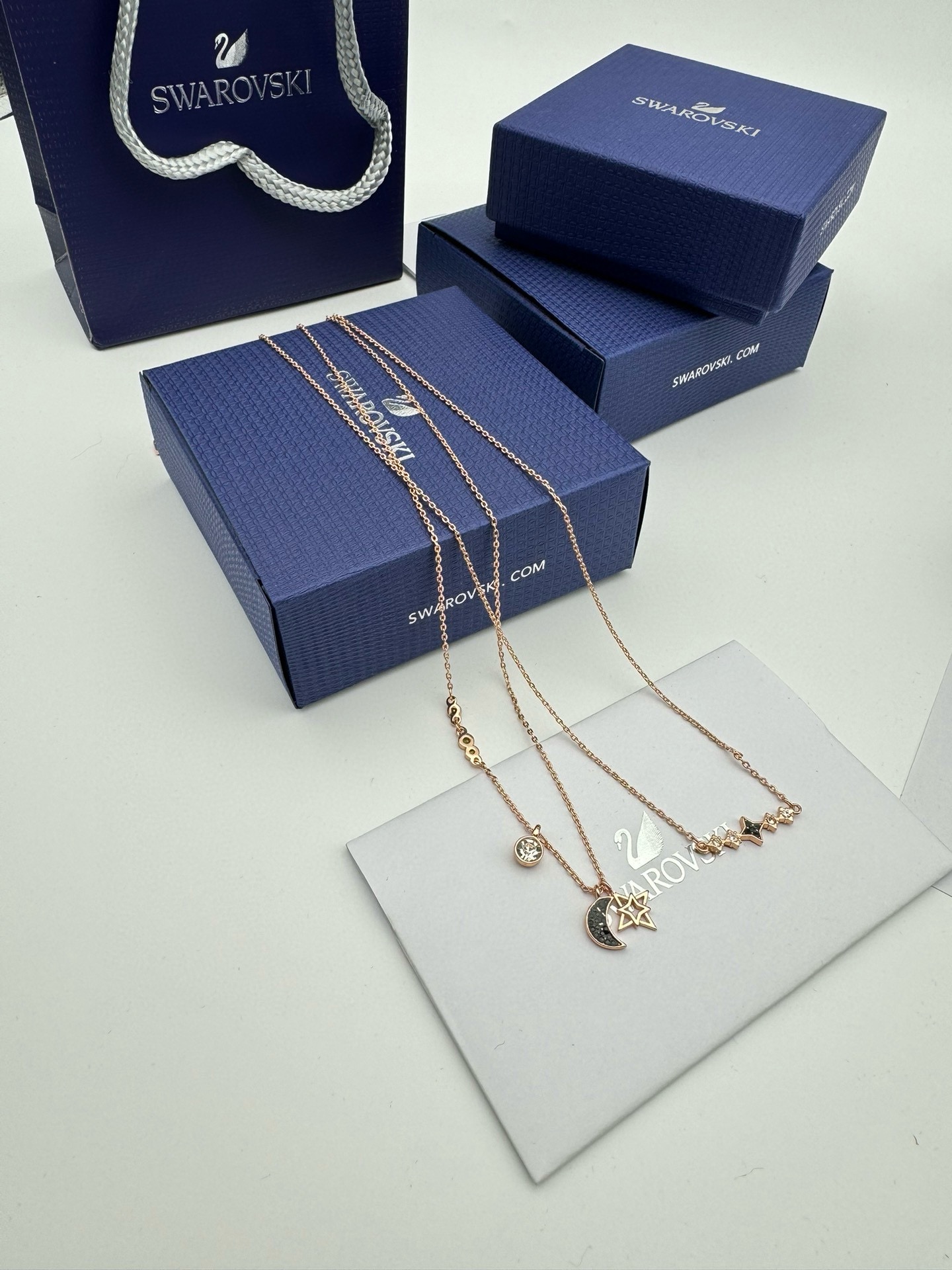SWAROVSKI施华洛世奇月亮双层二合一项链 配全套包装 款415 施华洛世奇原厂订单 深圳出口港货 仅此一批 礼物准备好了吗 象征优雅及高贵是施华洛世奇首饰的标志 自信 幸运并且一生只有一个伴侣 象征着一心一意 代表珍贵而永恒的爱情 这款活泼迷人的二合一项链套装 揉合了多种金属镀层 既可一整套佩戴以展现层次感 又可分开佩戴 两条项链均镶有透明及彩色仿水晶 而长项链更有一颗精致悦目的金属星星 以及一枚密镶仿水晶的月亮装饰 除了是送礼之选外 亦是日常必备的优雅配饰 随附一条饰链 带上它尽显风情 让你在每个场合更添优雅 链长 45CM可调节 颜色 玫瑰金 材质 合成立方氧化锆 仿水晶 镀玫瑰金色调