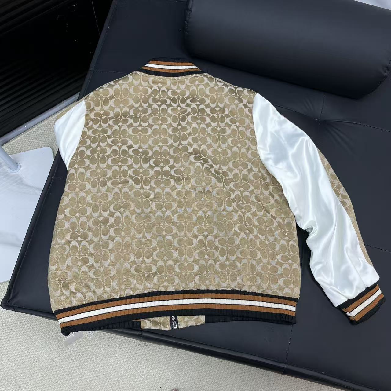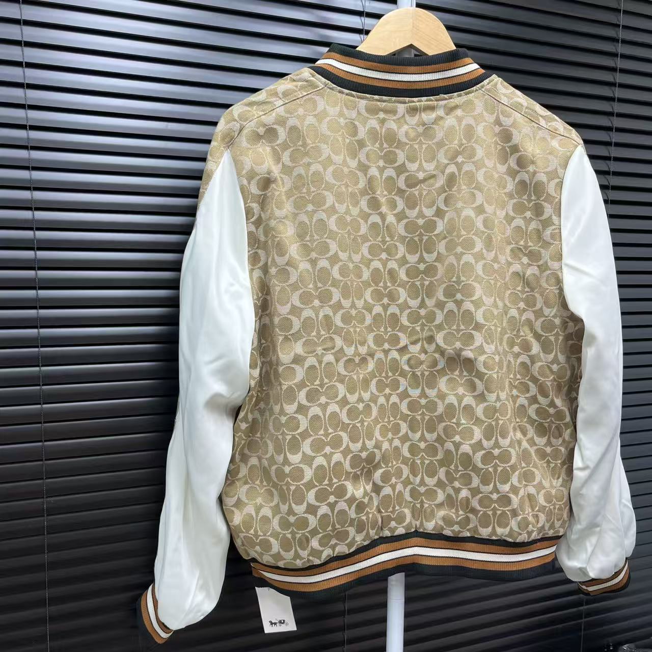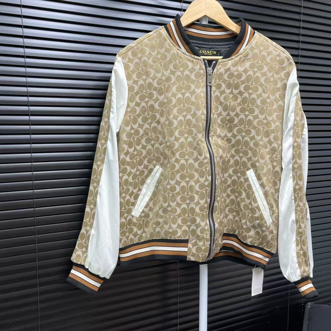 Coach老花棒球外套 经典老花满印 复古又有辨识度 拼接设计巧妙 不同材质碰撞出独特风格 棒球领和螺纹细节 美式复古感拉满 日常搭配超百搭 轻松打造潮流造型
