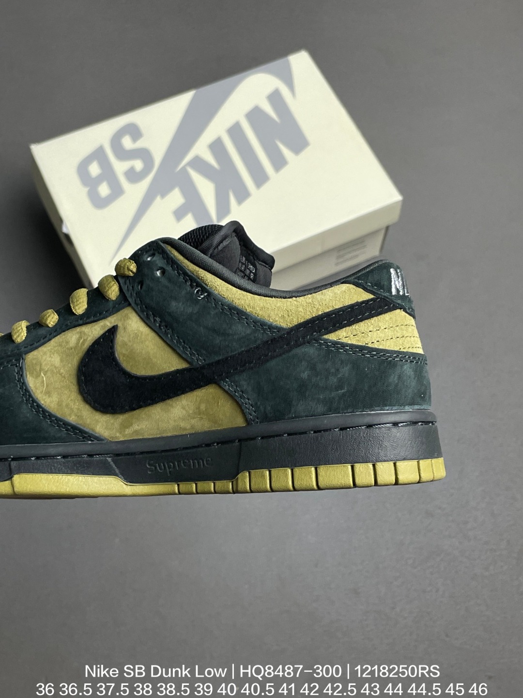 Nike 耐克 男女鞋真标半码制 采用荔枝纹牛剖革组合固色猪巴革鞋鞋面材质 鞋垫嵌EVA缓震物料及背胶 全新窄版翘头耐磨橡胶大底94年神秘密码 Dunk联名细节封神 经典美系街头品牌斯图西与至高无上Supremex Nike SB Dunk Low Retro Supreme 94 扣篮系列低帮休闲运动滑板板鞋 Sup联名深灰黄94刺绣 HQ8487 300
