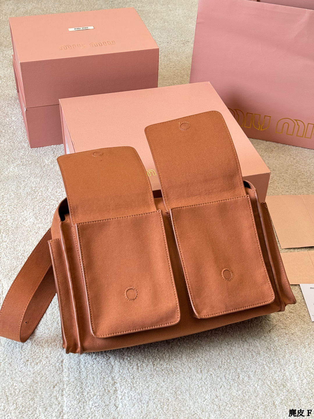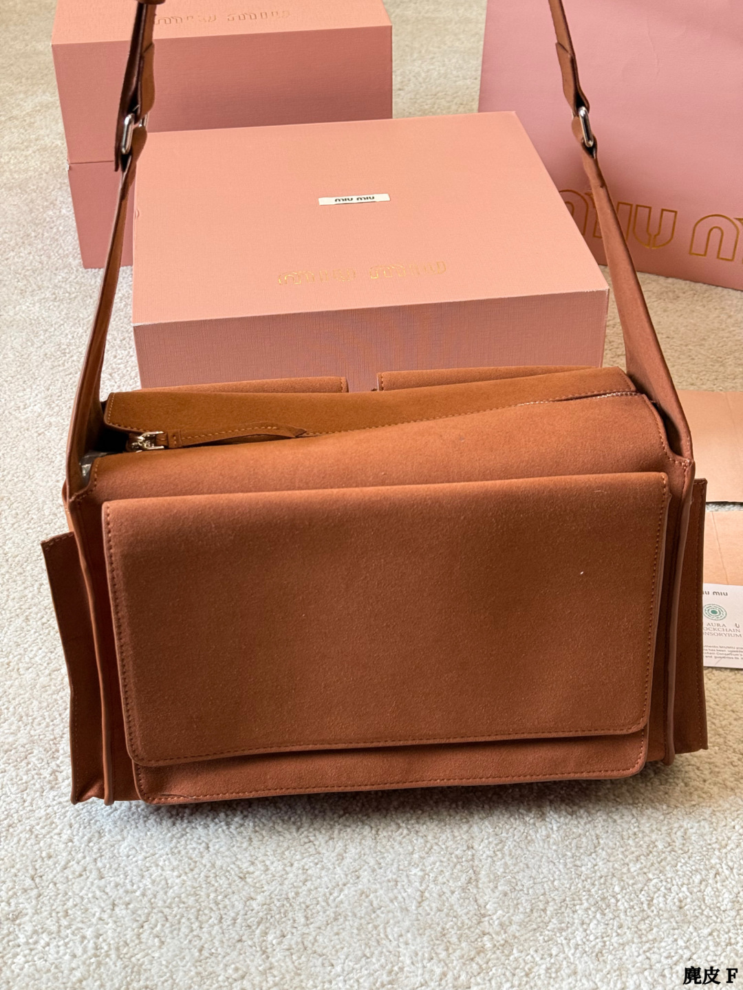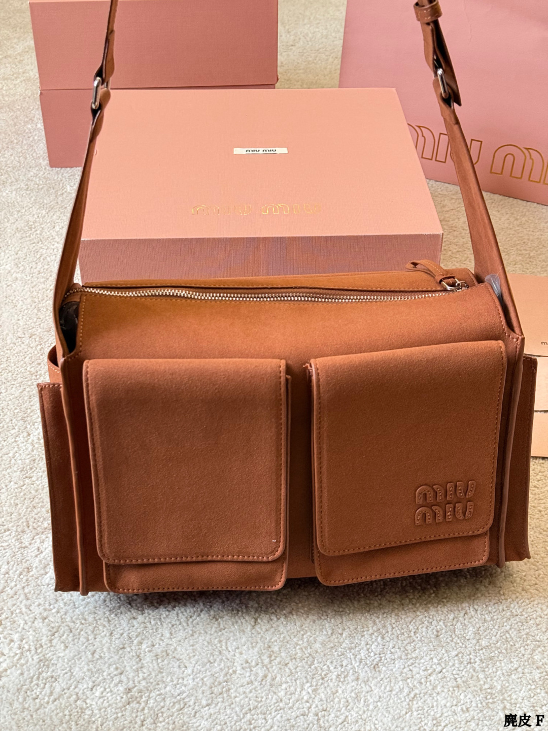 些Miu Miu 2026春夏系列麂皮邮差包 深棕磨砂麂皮 质感柔软低调高级 翻盖 拉链设计 正面双口袋 实用又时髦 肩带可调节 单肩斜挎都OK 通勤出街都能轻松驾驭 容量适中 日常物品轻松收纳 复古风格 麂皮材质 秋冬搭配超有氛围感 是实