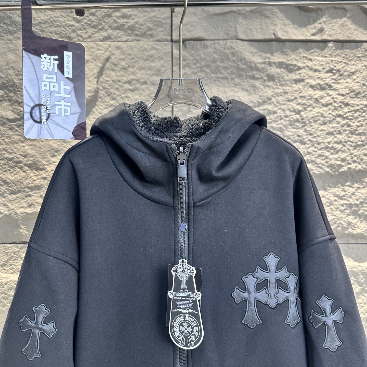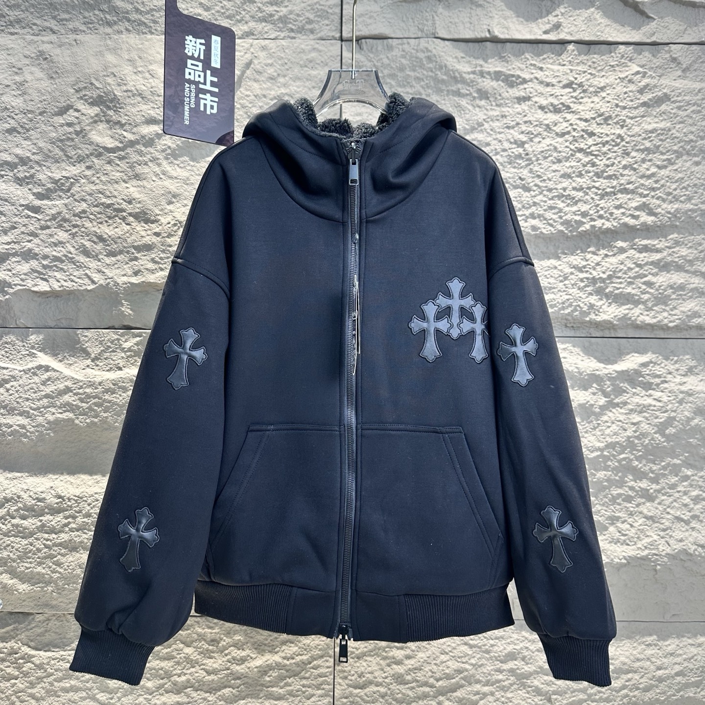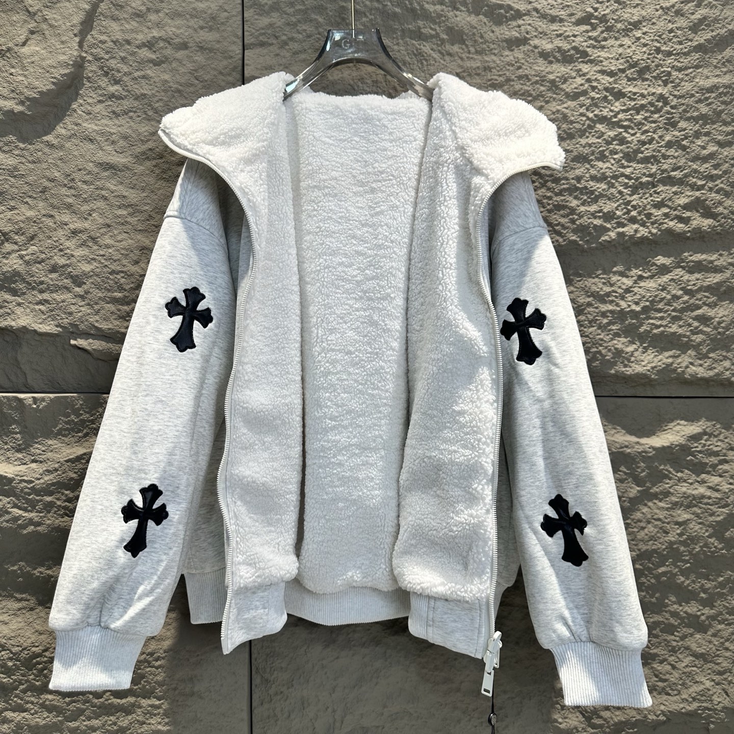 克罗心2025冬季新十字贴皮刺绣加厚羊羔毛连帽开衫卫衣外套美式潮牌 双面可穿