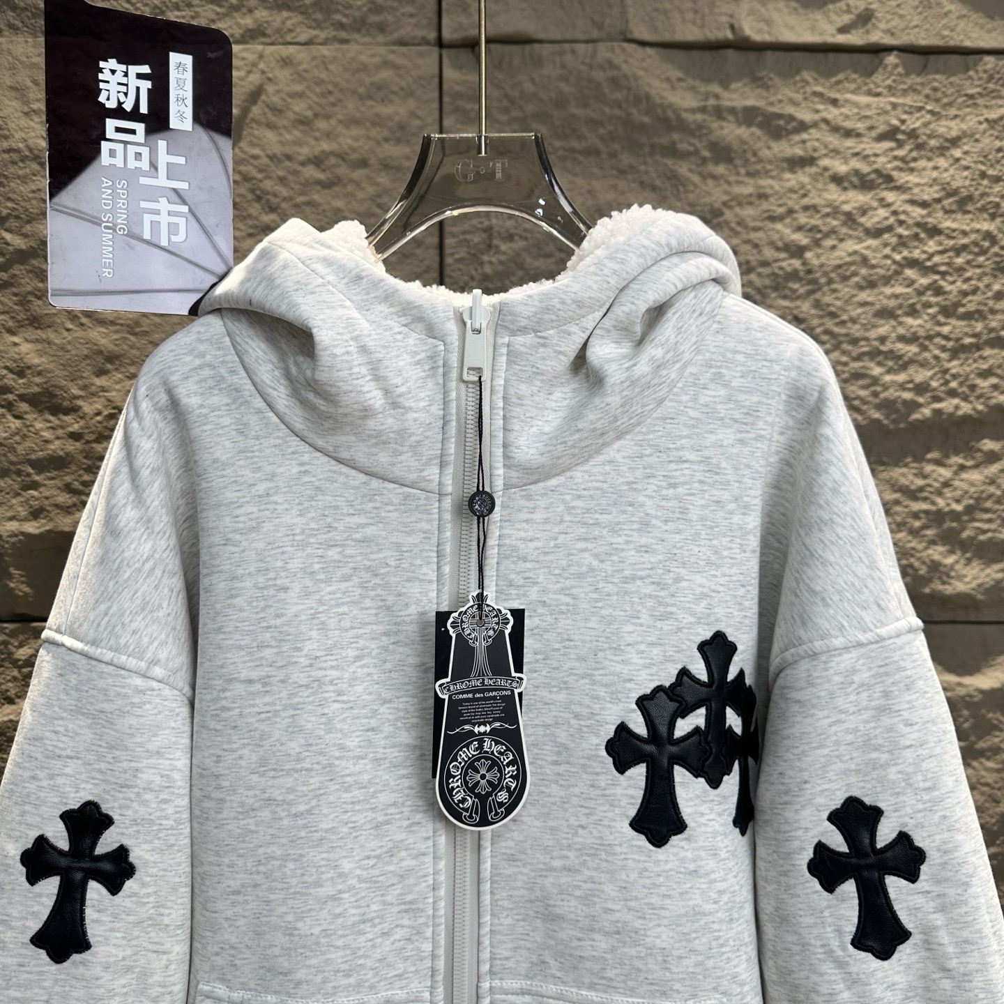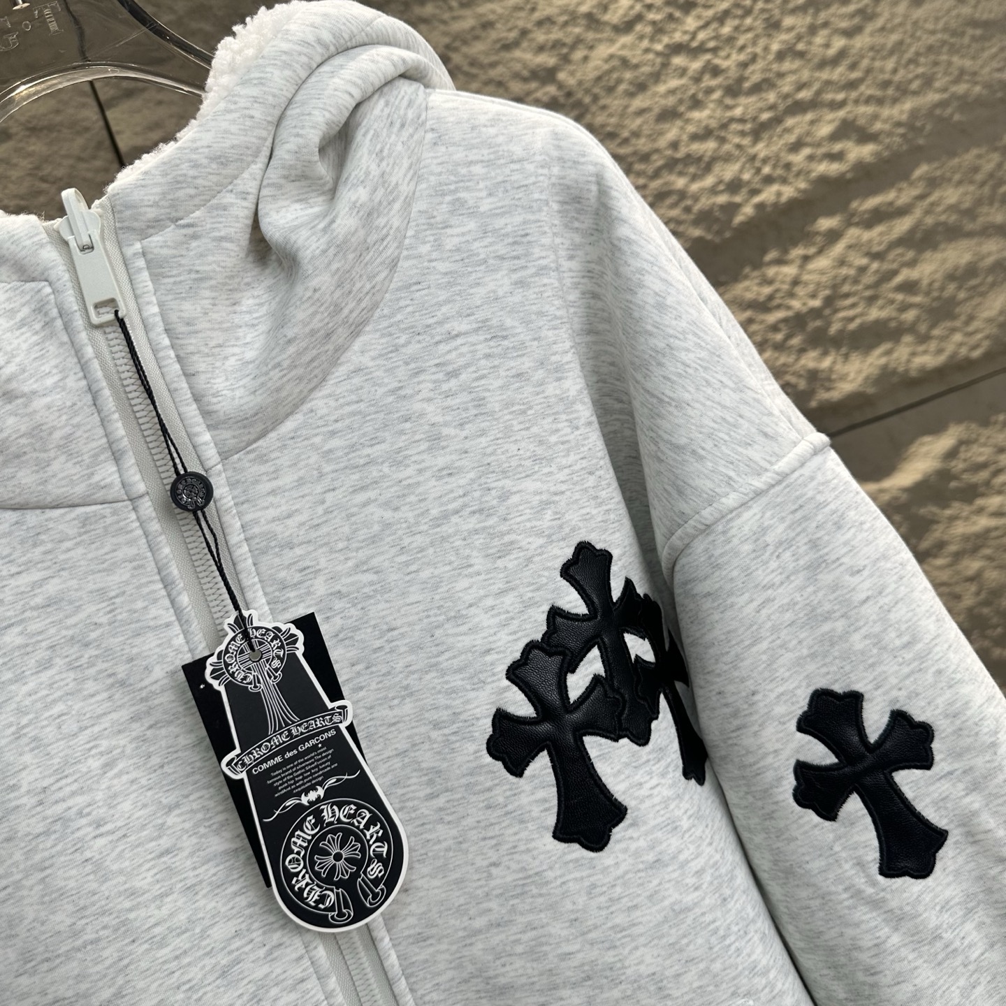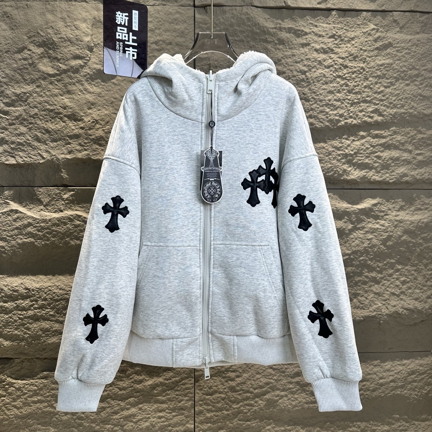 克罗心2025冬季新十字贴皮刺绣加厚羊羔毛连帽开衫卫衣外套美式潮牌 双面可穿