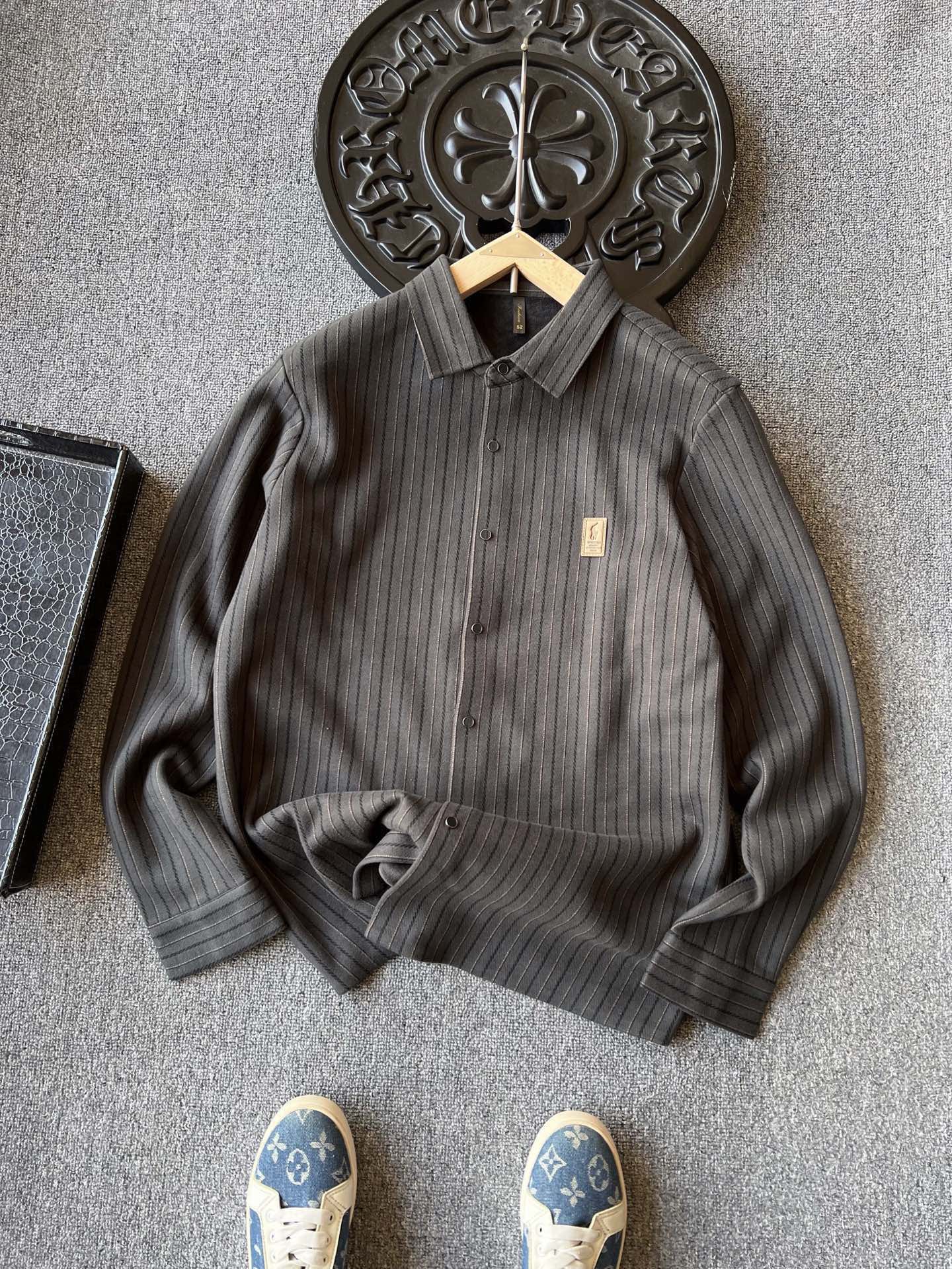 细节细节再细节 Ralph Lauren家商场新品一体色织竖条纹超柔羊毛蚕丝衬衫外套 胸前3D泡芙材质做了钢印凹凸激光烧花拉夫劳伦Polo棕标 十分精致 高端定制浮雕五金纽扣细节 外穿内搭高级感拉满
