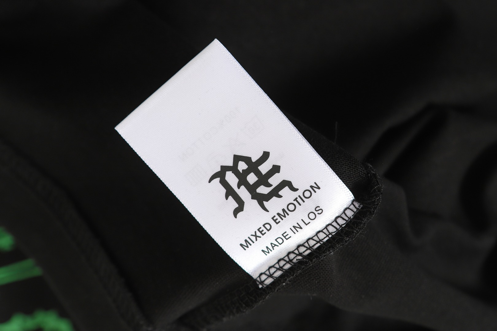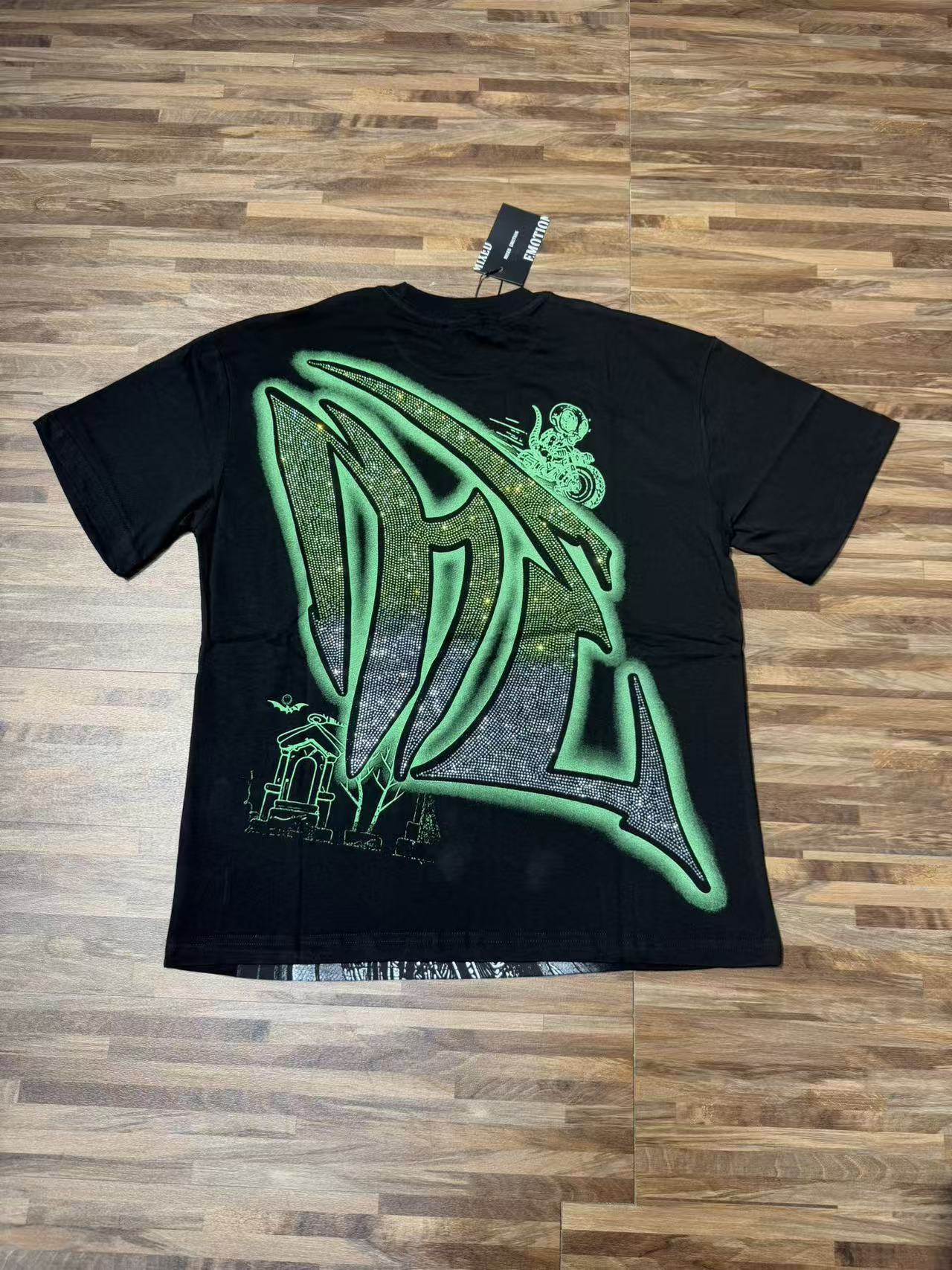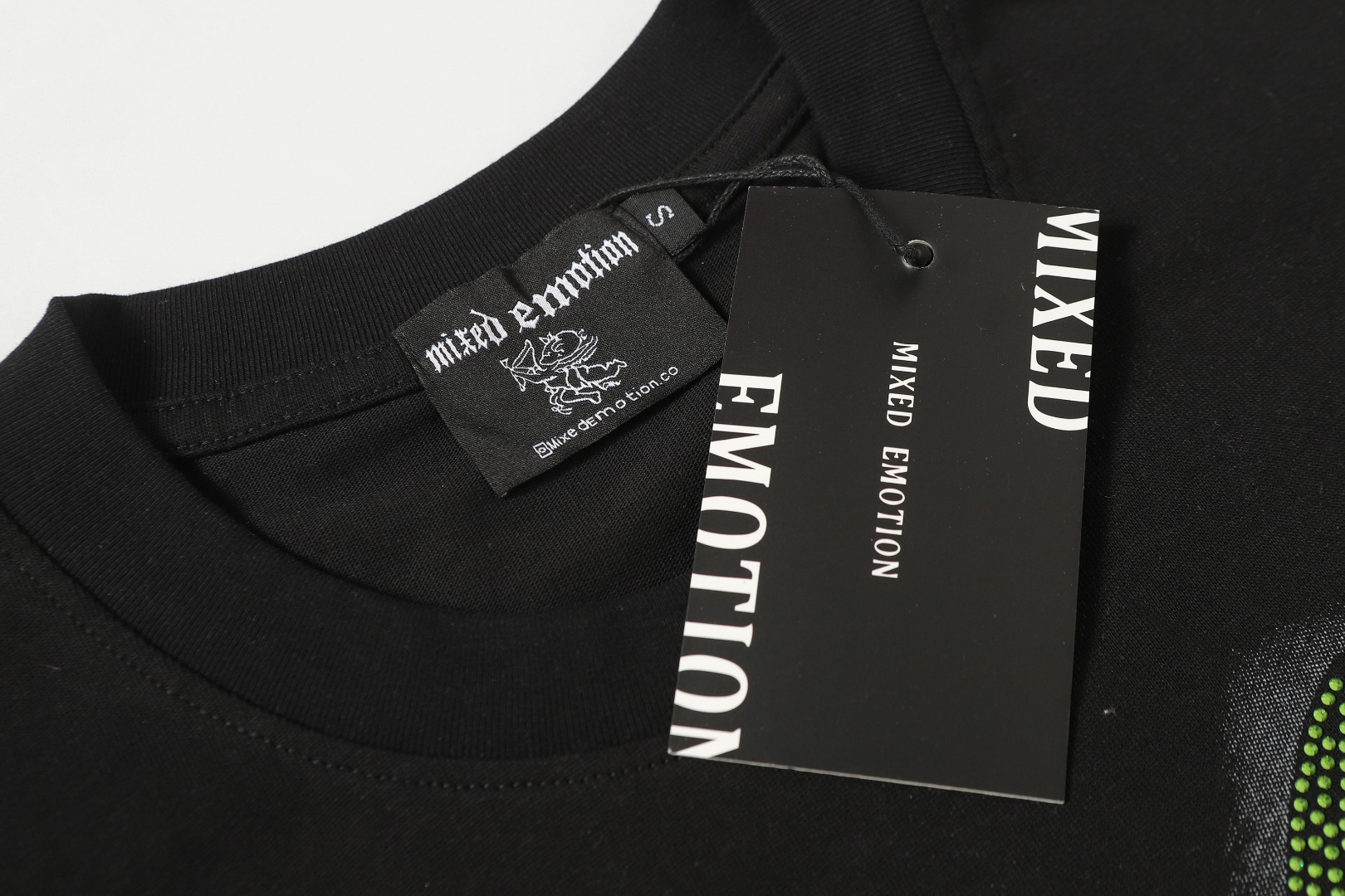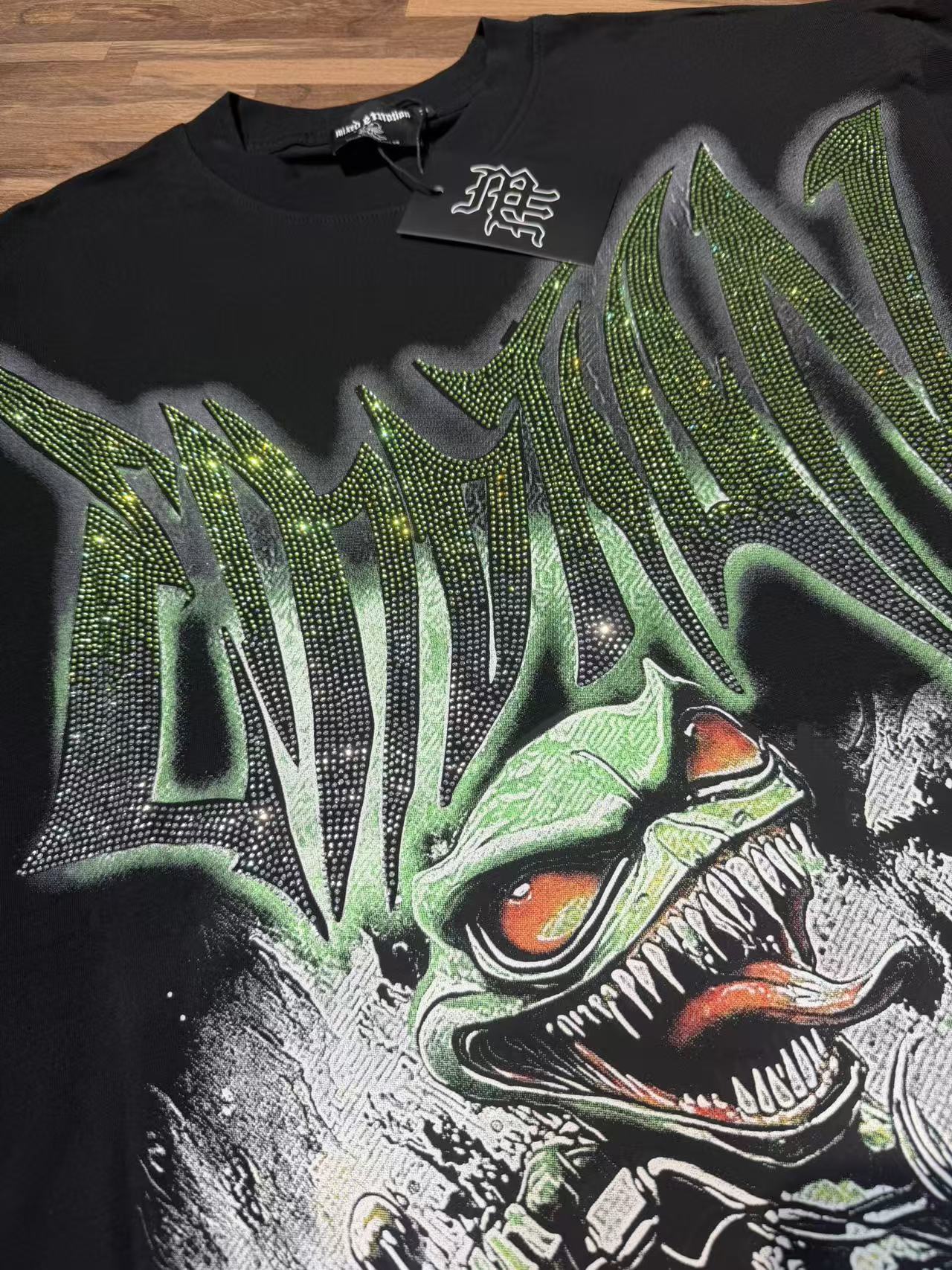 活性黑色 MIXED EMOTION 现货实拍 美式潮牌宽松休闲T恤 面料 fabric 32支270 克重精梳双纱纯棉 码数 size S M L X L 工艺 高清印花 烫压 中东进口A钻 颜色 colour 活性黑色