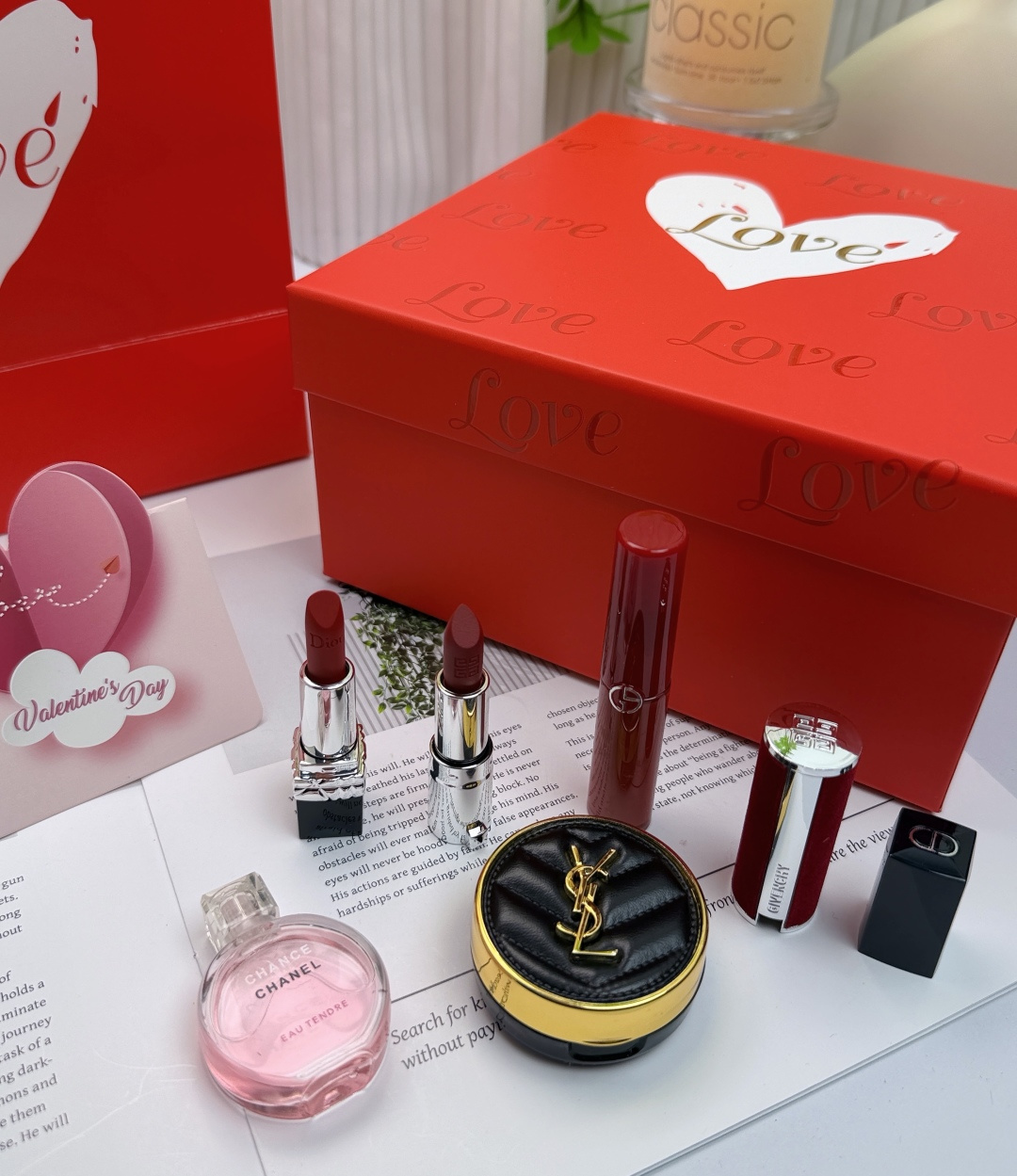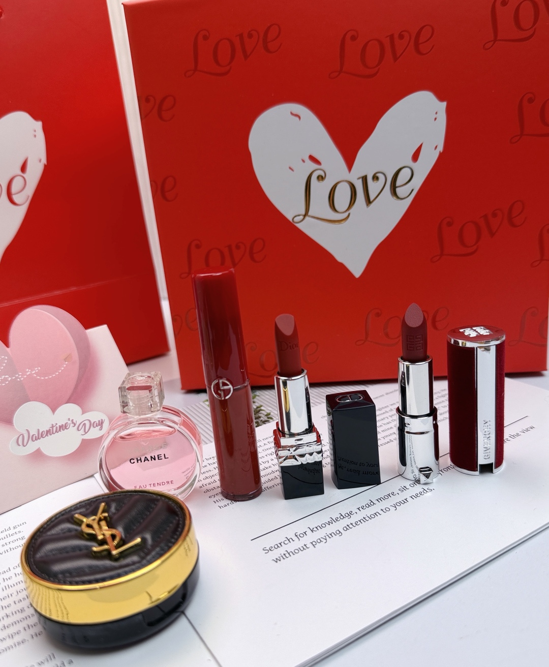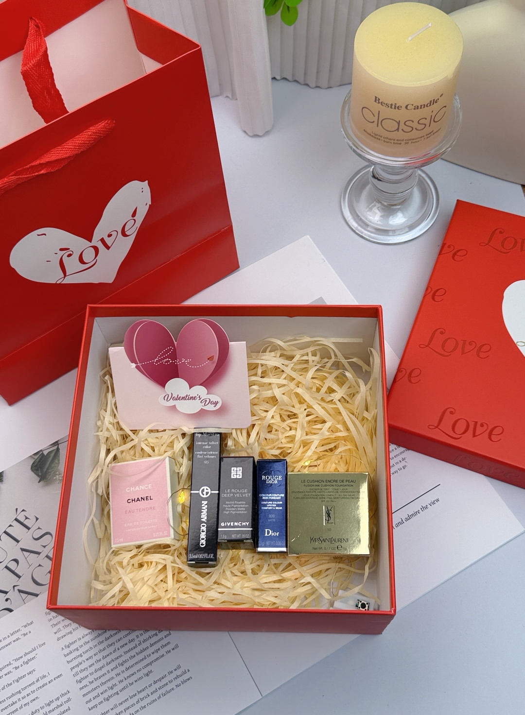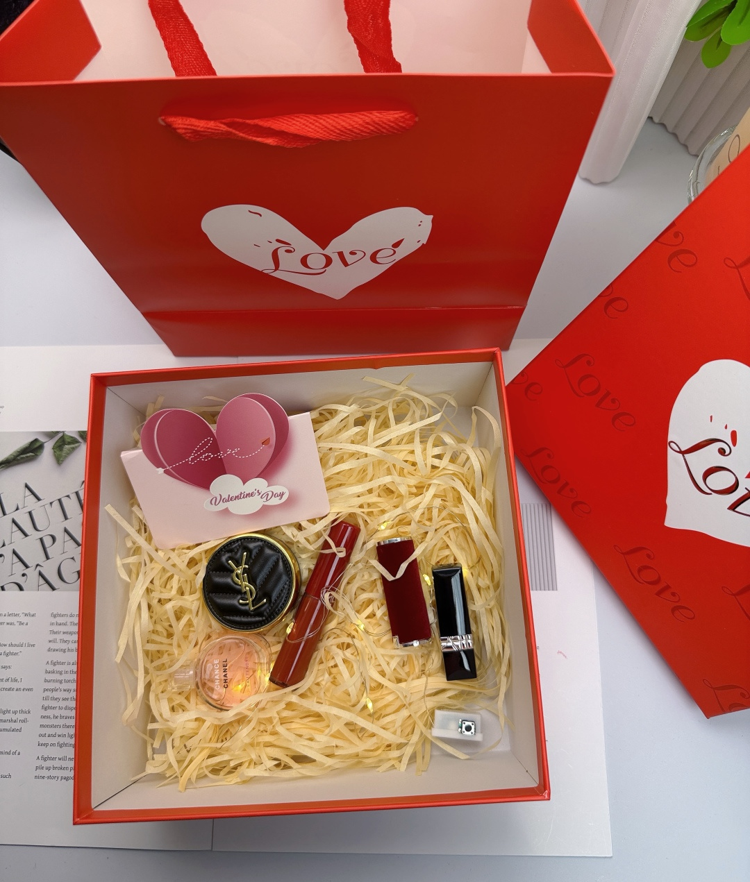 外盒是高级感爆棚的红底白心烫金设计 满印 Love 字样 打开后是铺满的米色拉菲草和暖光灯带 氛围感瞬间拉满