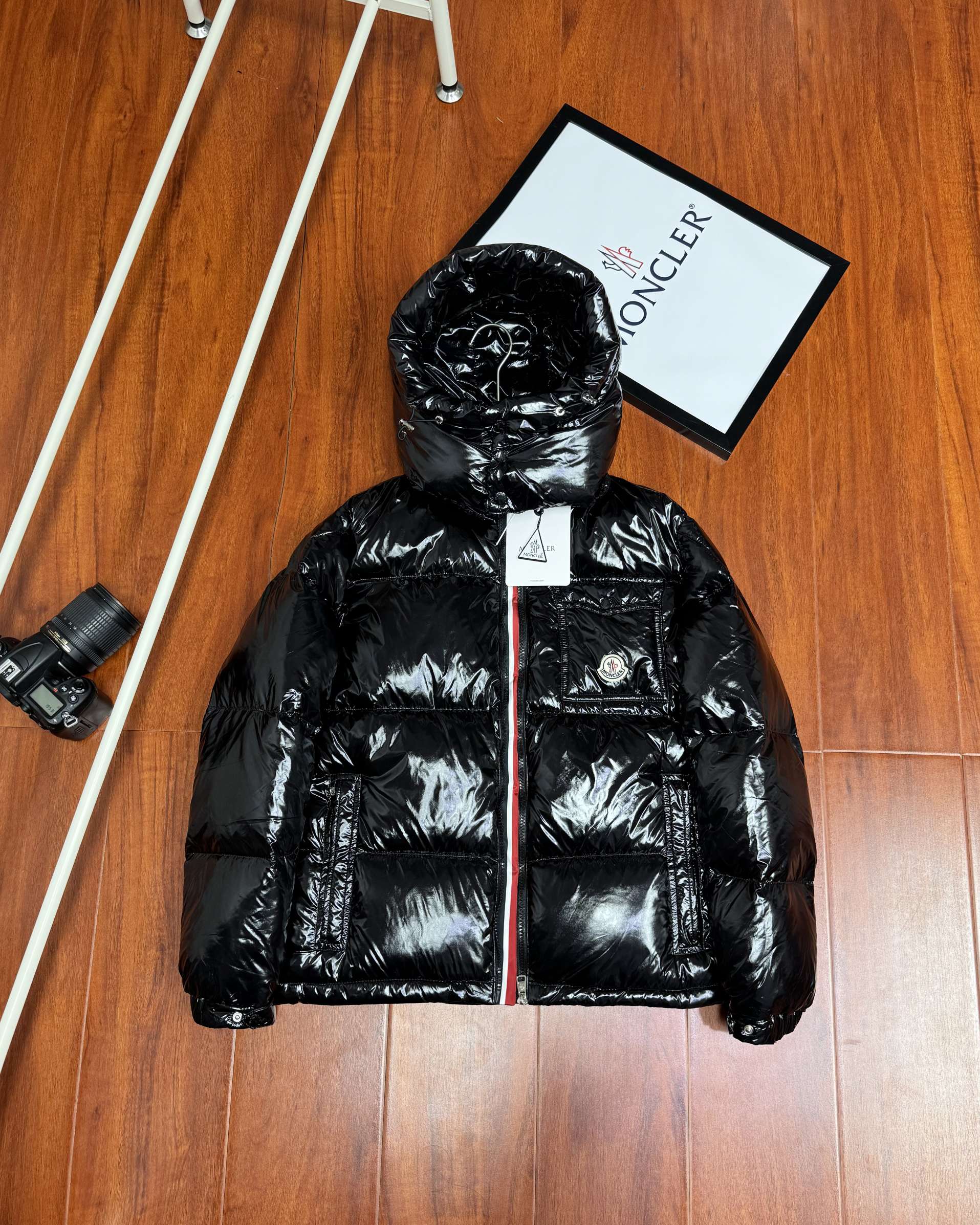 该款羽绒服采用标志性的闪亮漆面尼龙面料制成 双门襟设计可轻松调节款型 点缀标志性三色织带细节 可根据气候情况拆卸风帽 打造更简洁造型
