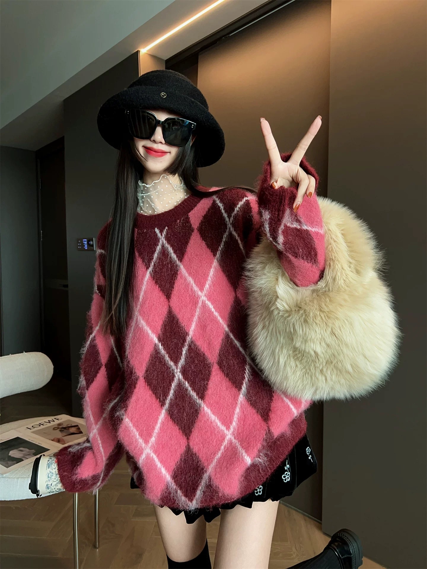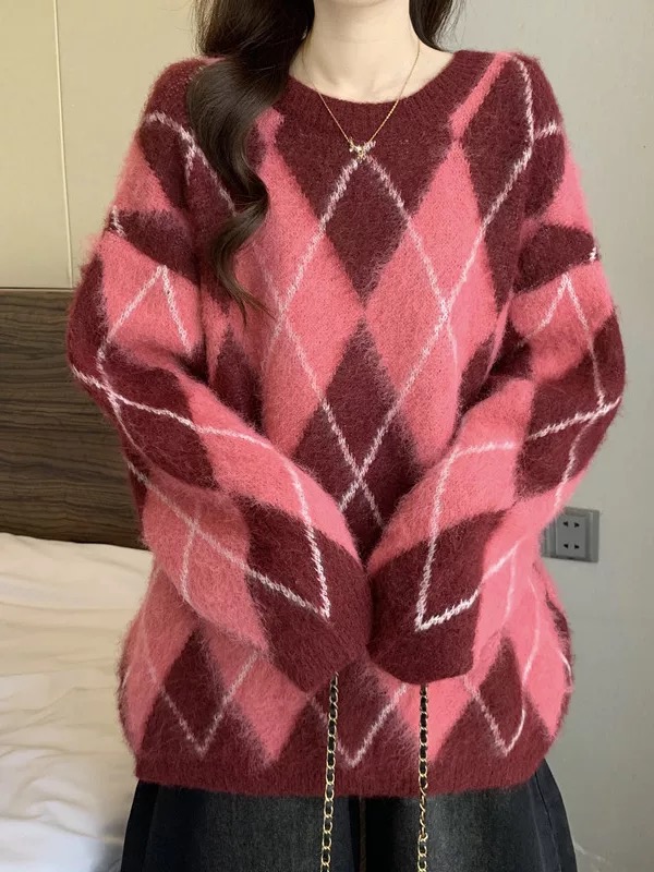 85169704 - 批菱格套头针织毛衣 女冬季高级感加厚羊毛衫打底衫撞色宽松慵懒 387719