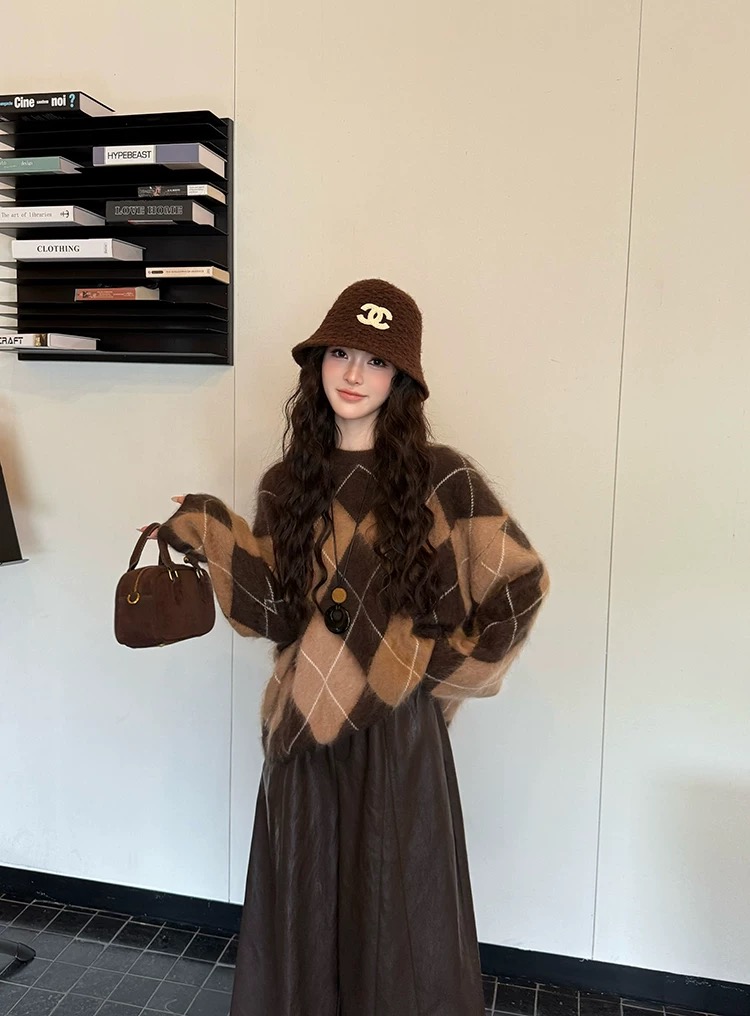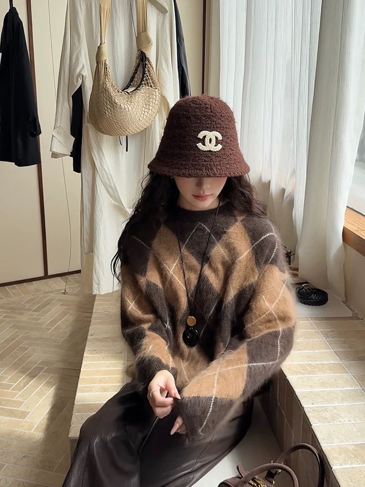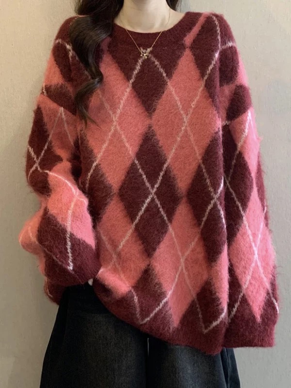 批菱格套头针织毛衣 女冬季高级感加厚羊毛衫打底衫撞色宽松慵懒毛衣 复古菱格针织 秋冬氛围一把拿捏