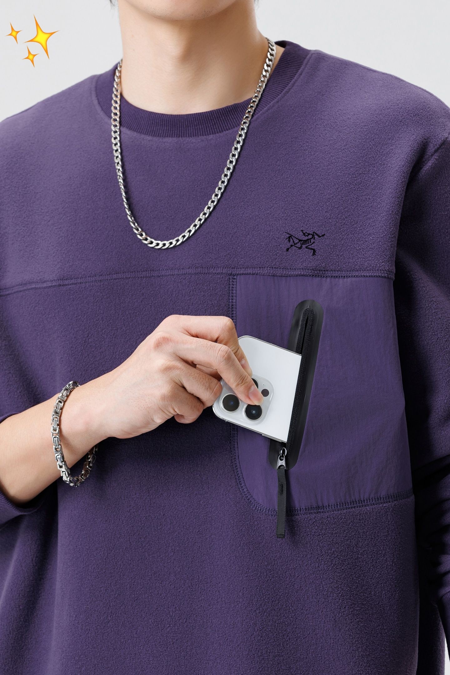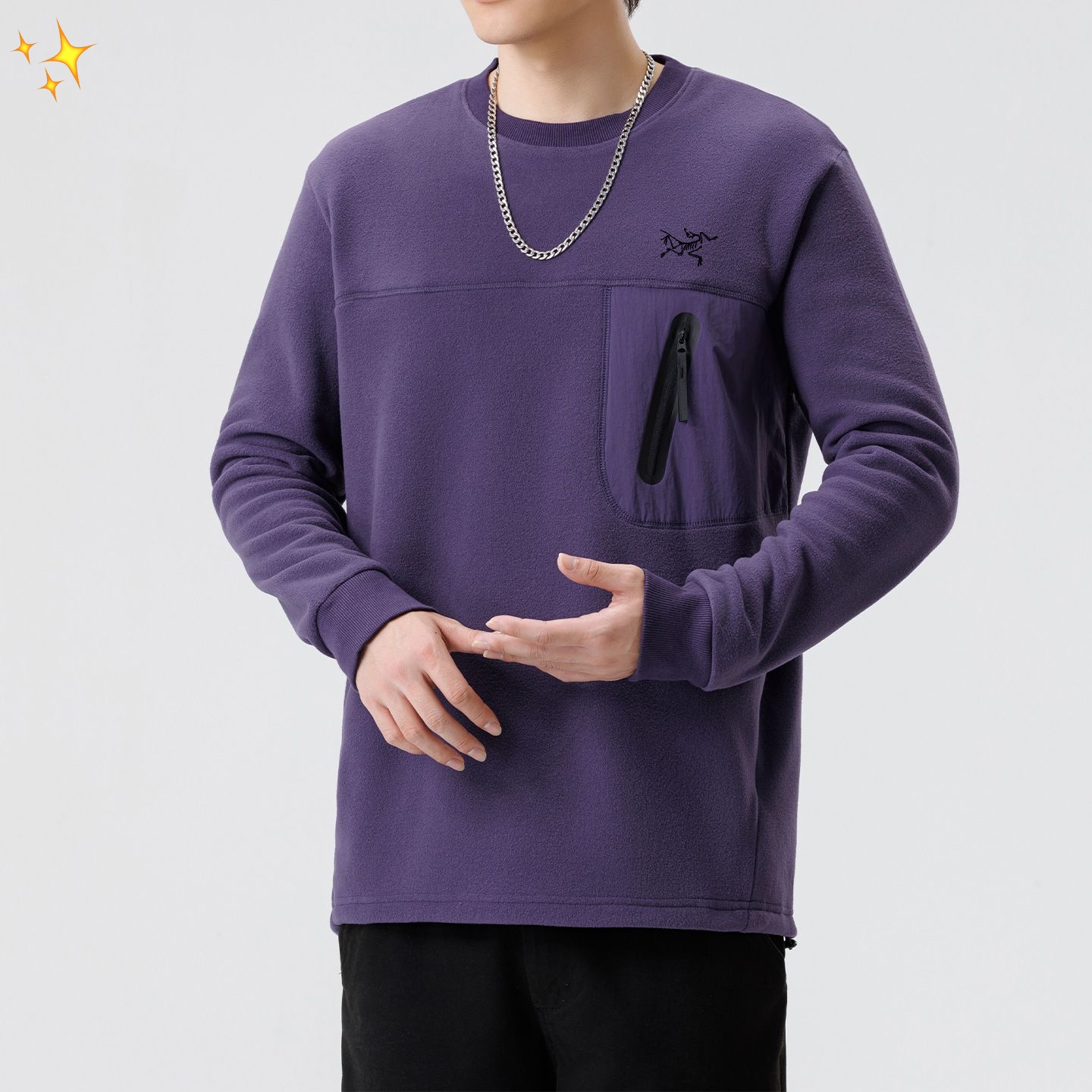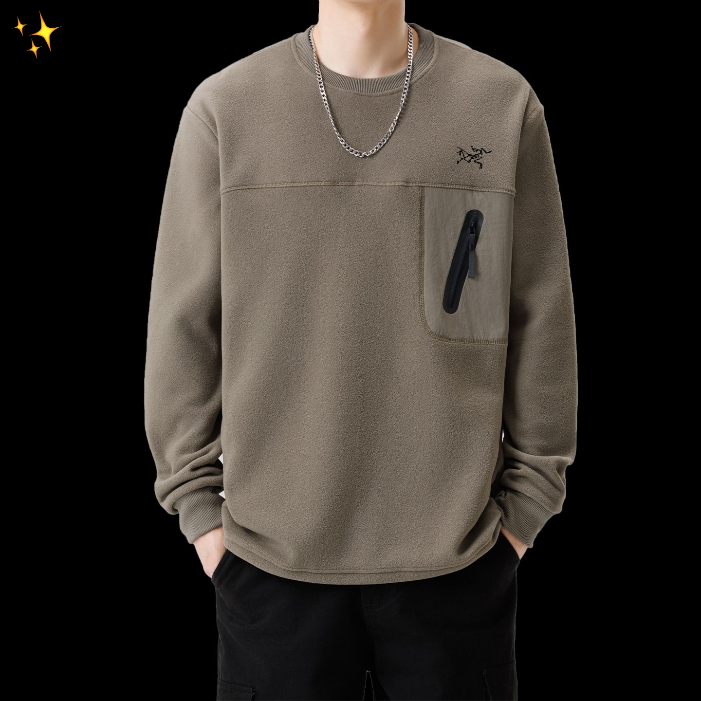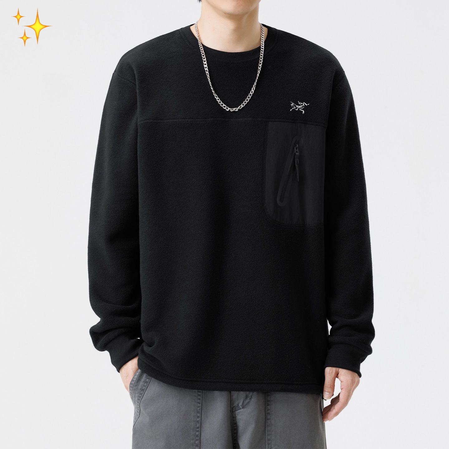 经典圆领搭配利落线条 自带90年代日系复古韵味 宽松版型藏肉又自在 撞色拼接口袋是点睛之笔 既保留机能风的实用属性 又让整体造型层次更丰富 单穿是街头焦点 叠穿大衣或冲锋衣更显格调