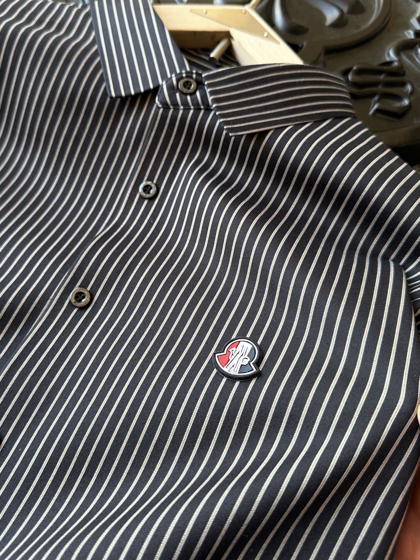 细节细节再细节 Moncler家商场新款条纹长袖加绒衬衫 定位精致都市商务休闲系列 胸前采用红白蓝硅胶基底表层镶嵌金属蒙口小标 轮廓一圈硅胶环绕 十分精致 内里精湛做工 拼接处做了套结加固细节可圈可点
