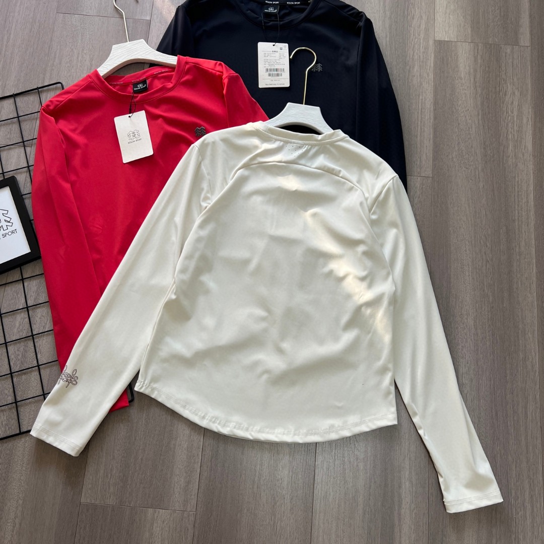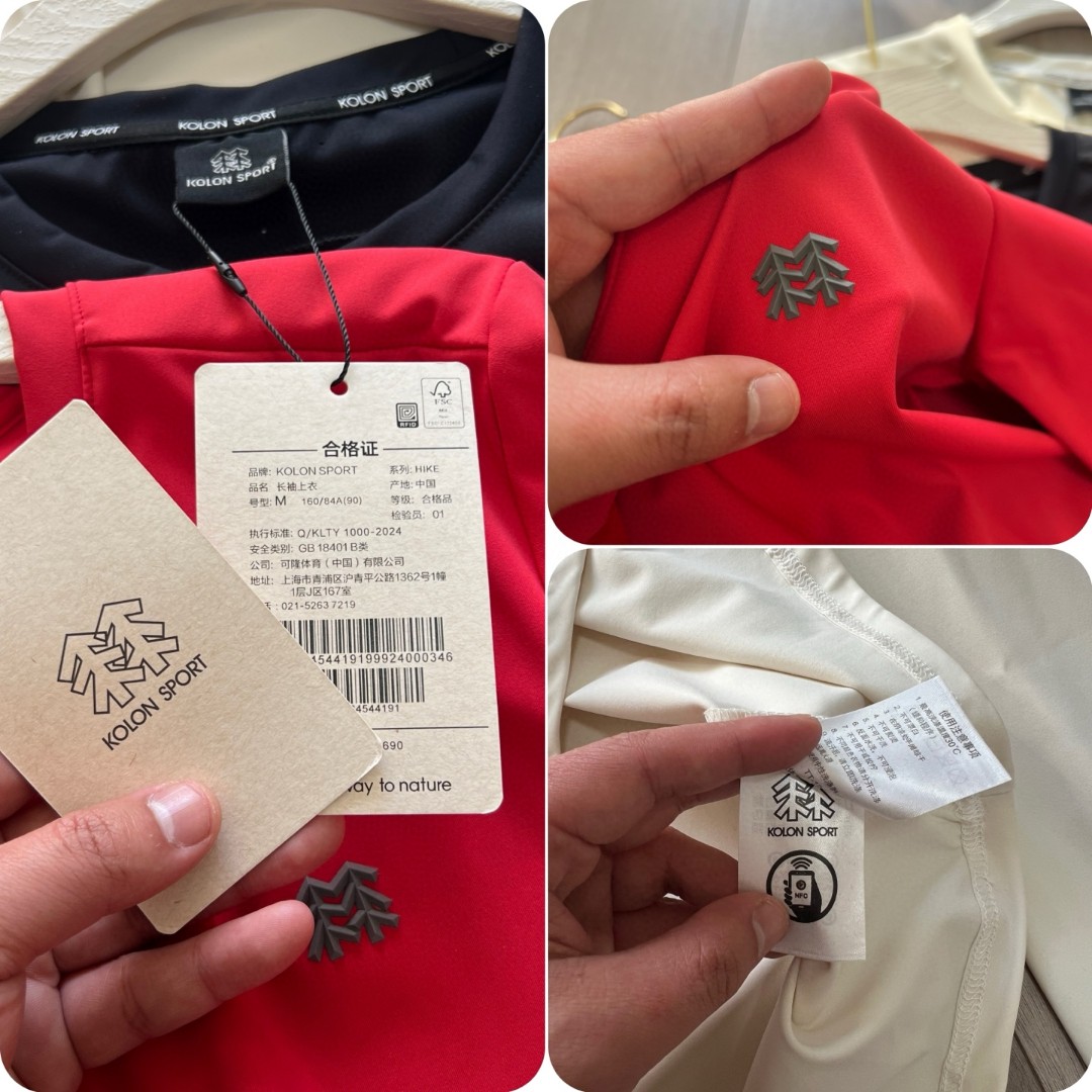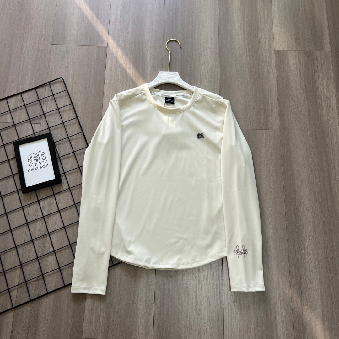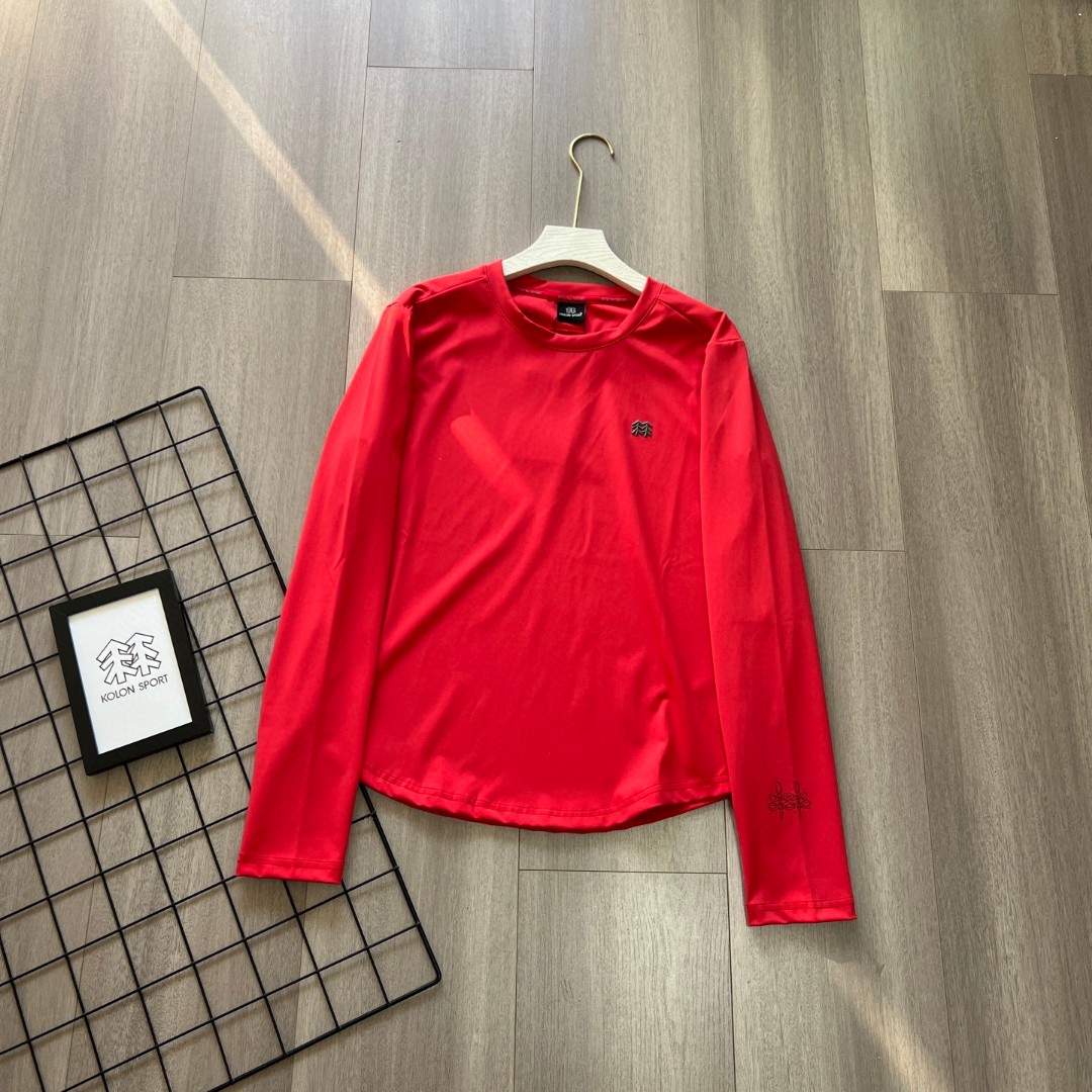 可隆这次出的颜色好美袖口还有中国结设计 本命年的情侣夫妻们 安排起来 料子很舒服 可隆打底衫24秋冬新款女子综训系列长袖运动衫KOLON SPORT可隆休闲衣弹力圆领户外运动防晒长袖打底T恤 可隆的内搭 SECO面料和 POLYGIENE银盐抗菌科技结合速干 棉触感 抗褶皱 耐洗护 基础款圆领长袖T恤 具备高弹力 防晒性能背面 提高穿着舒适性 面料 聚酯纤维80 氨纶20 柜子同步 迪家高端专业运动面料 亲肤舒适 排汗吸湿 面料不易变形 不易褪色以及快速干爽的三大顶尖优势 胸前的立体LOGO 高温热烫印的工艺加持 右下摆字母小压花 增加了设计的趣味性和观赏度 整体既有严谨的精英范 又有利落阳光的运动感 彰显品牌魅力