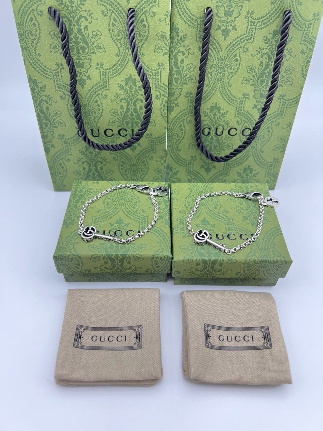 这款泰银手镯采用做旧效果 巧妙融入别致的钥匙设计 钥匙顶部饰有鲜明的品牌标识双G元素 Gucci银饰系列经过精心设计和专业制作 通过微妙细节致敬品牌传承 呈现出一系列时尚和经典单品